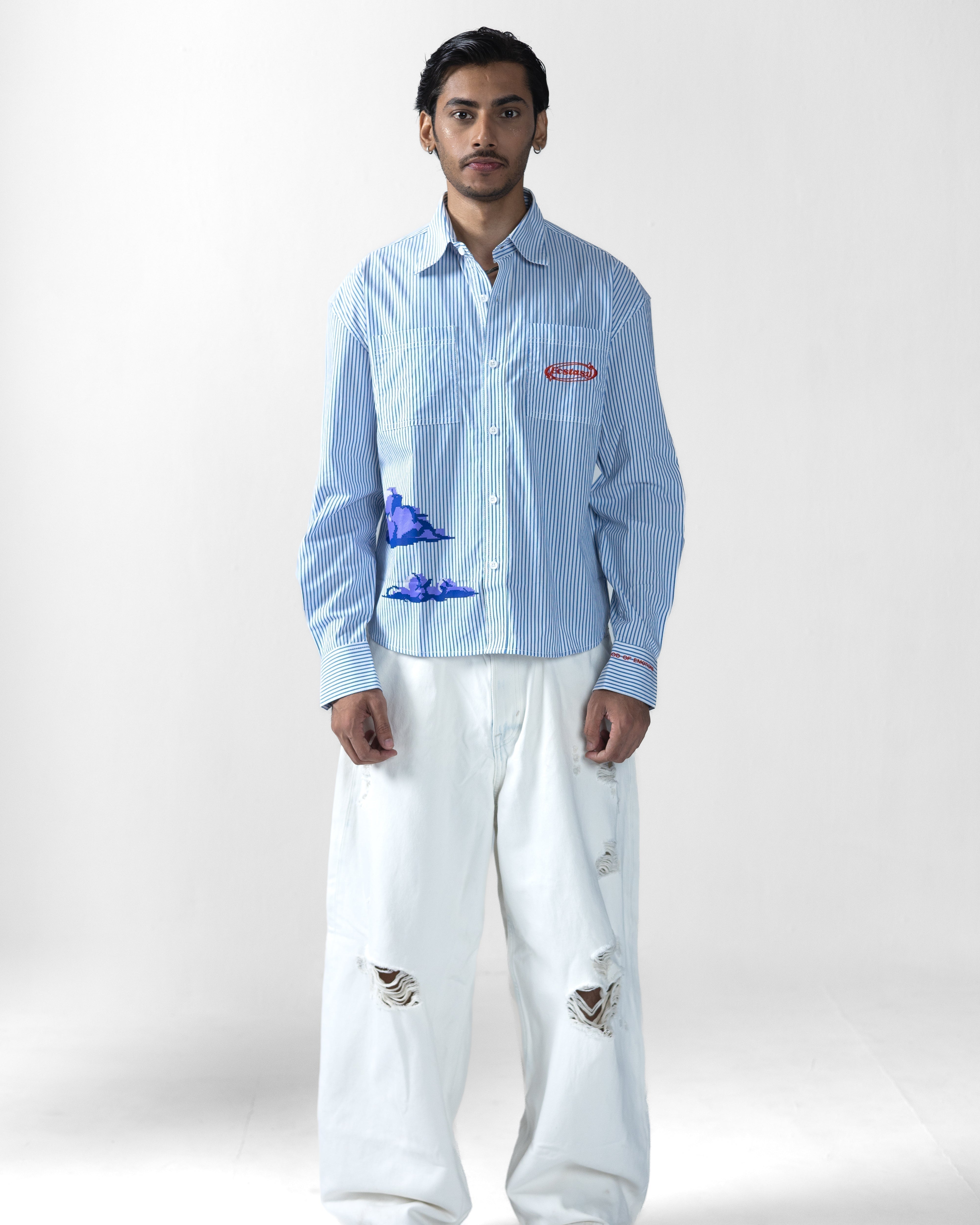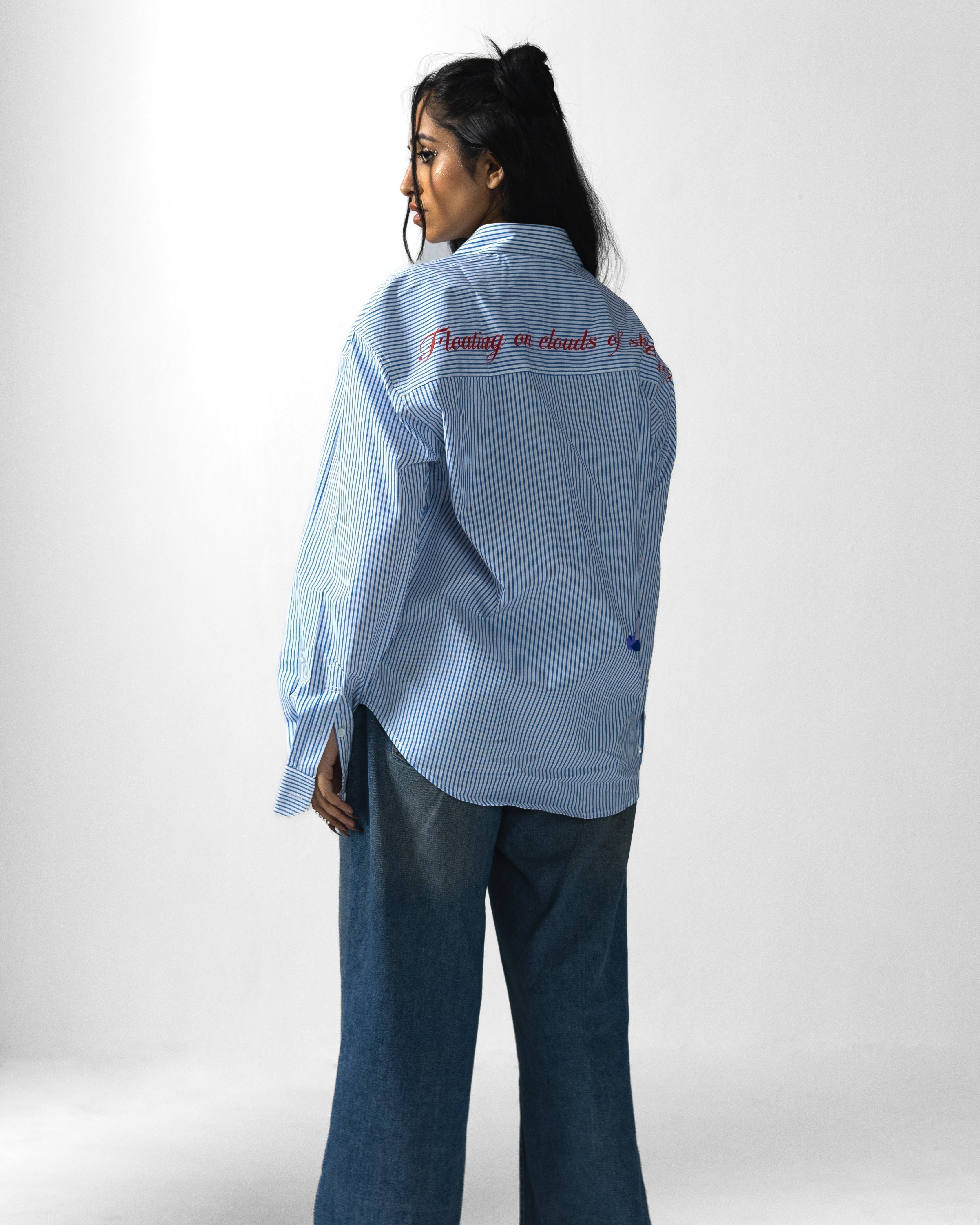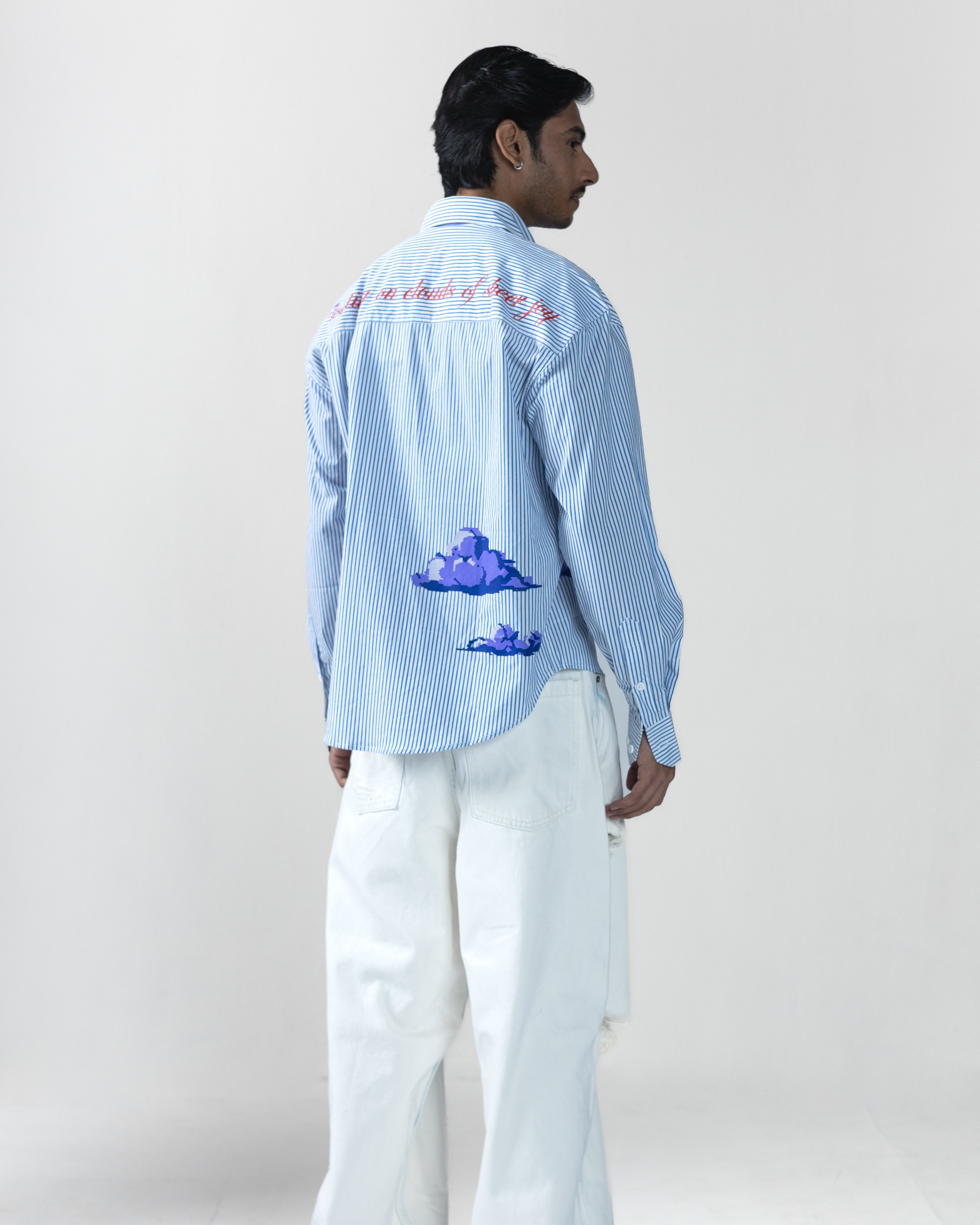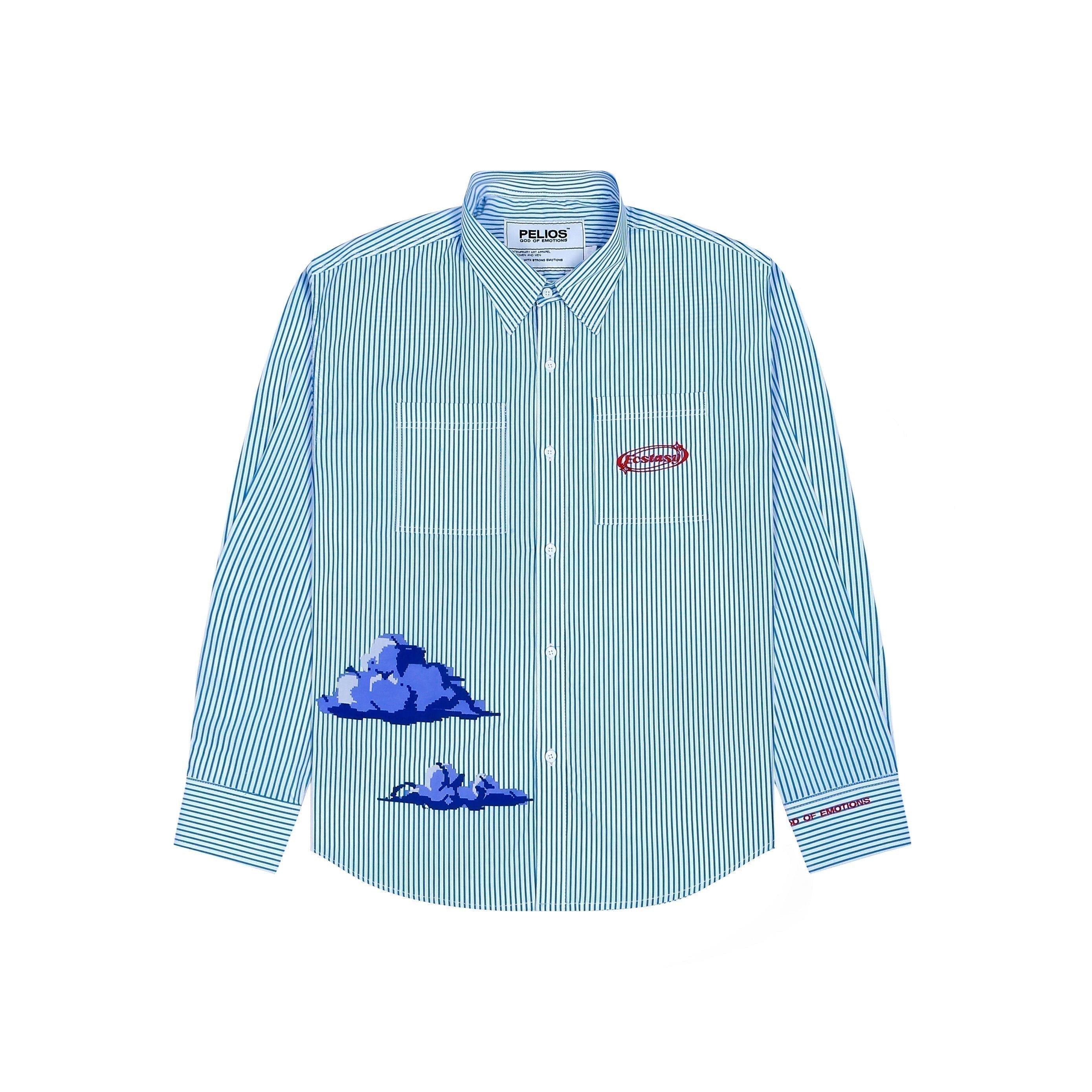 A TIMELESS, CONCEPTUAL HIGH-LOW SHIRT DESIGNED FOR EFFORTLESS STYLING. CRAFTED FROM PREMIUM COTTON POPLIN, IT FEATURES HD 3D-PRINTED CLOUD ARTWORK ON THE FRONT AND BACK, CAPTURING THE ESSENCE OF FLOATING IN PURE BLISS.