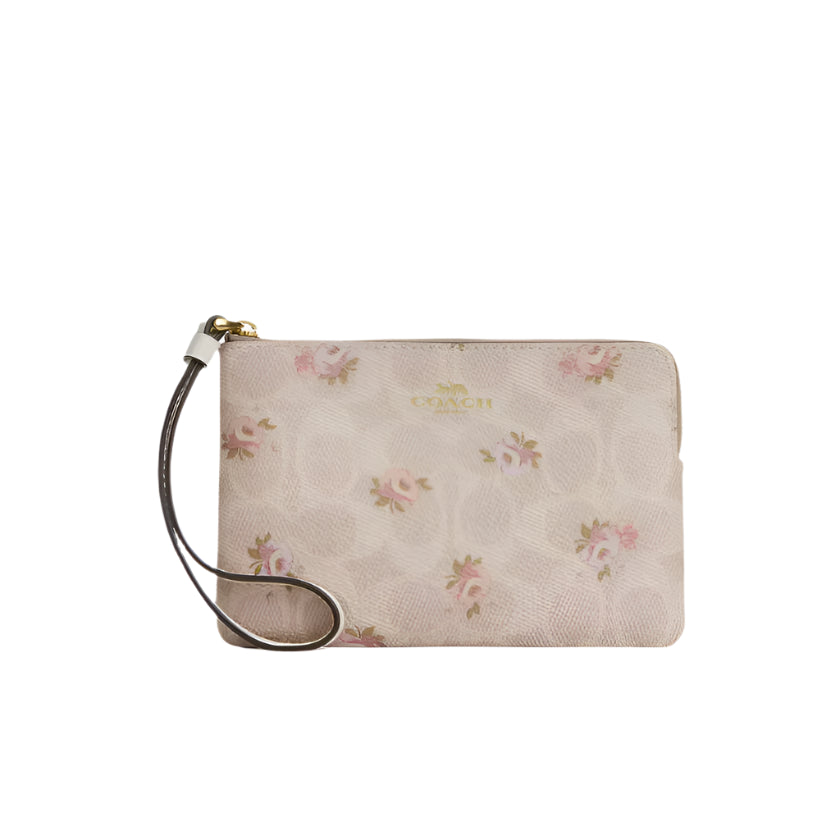 COACH Corner Zip Wristlet In Signature Canvas With Floral Print Gold/Sand Multi