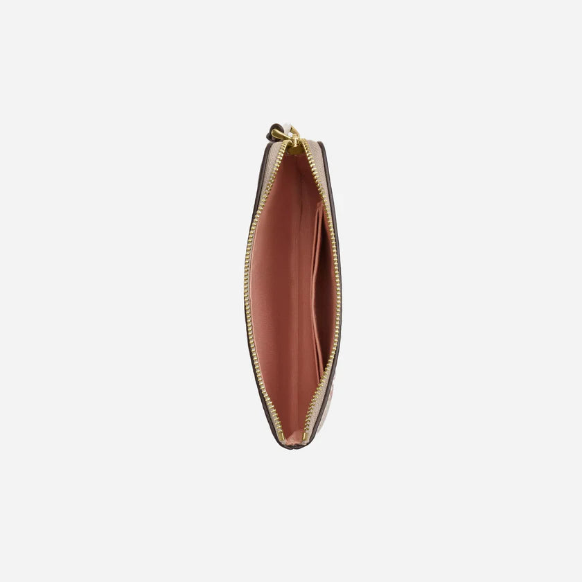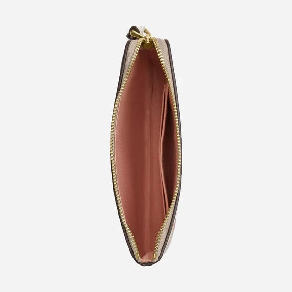 Elevate your accessory collection with the COACH Corner Zip Wristlet crafted in signature canvas featuring a delicate floral print in gold and sand tones. This compact wristlet offers secure zip closure and a convenient wrist strap, combining style with practicality. Perfect for organizing essentials while adding a refined touch to your ensemble.
