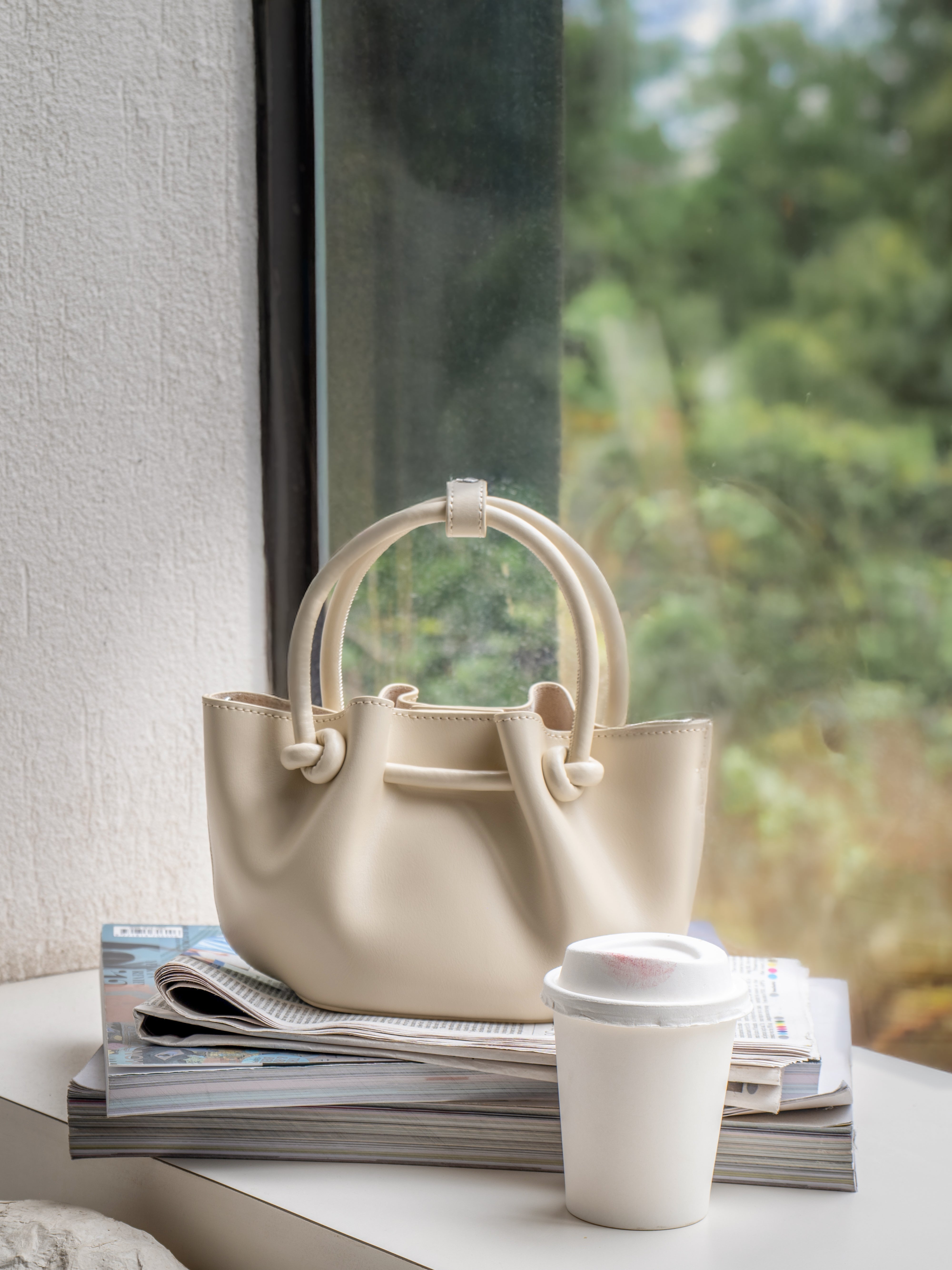 1. Elegant Design: A small-sized top-handle silhouette highlighted by a signature knotted handle, adding a modern sculptural touch.