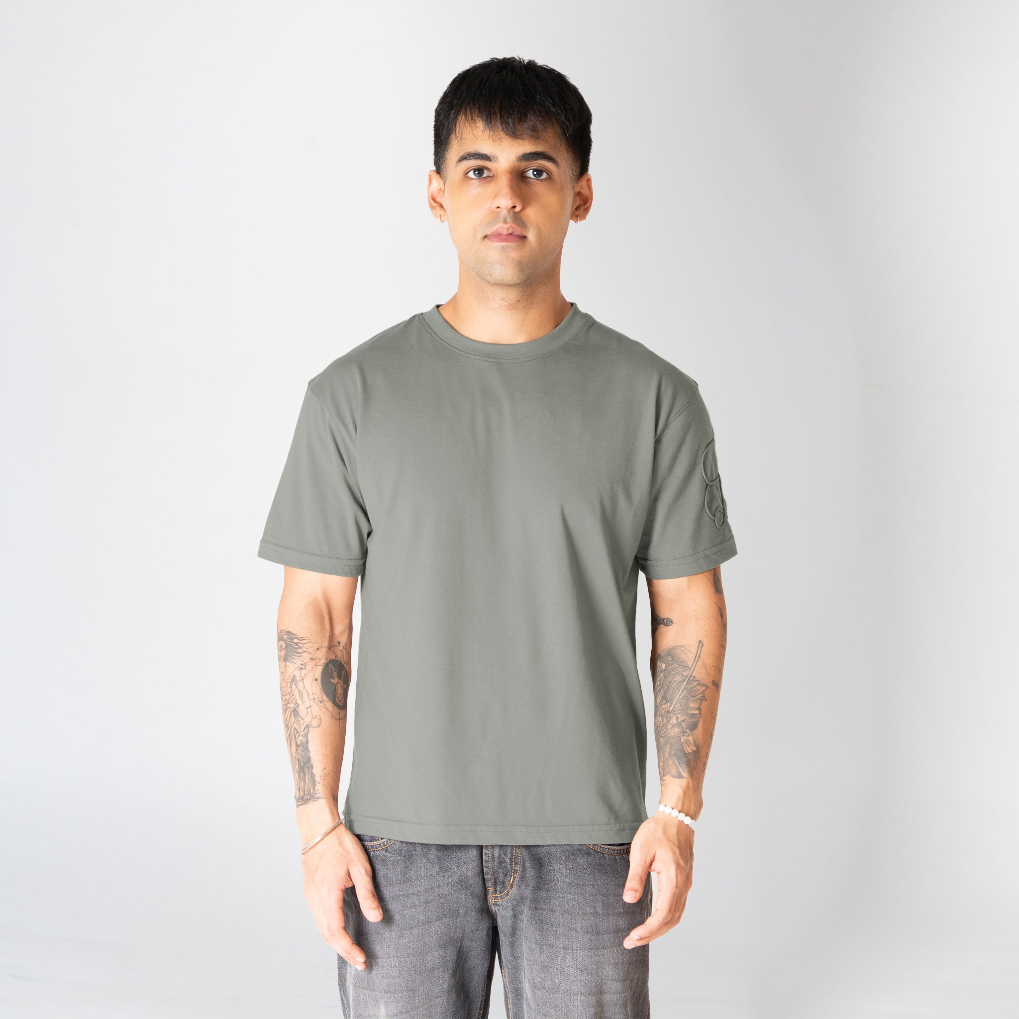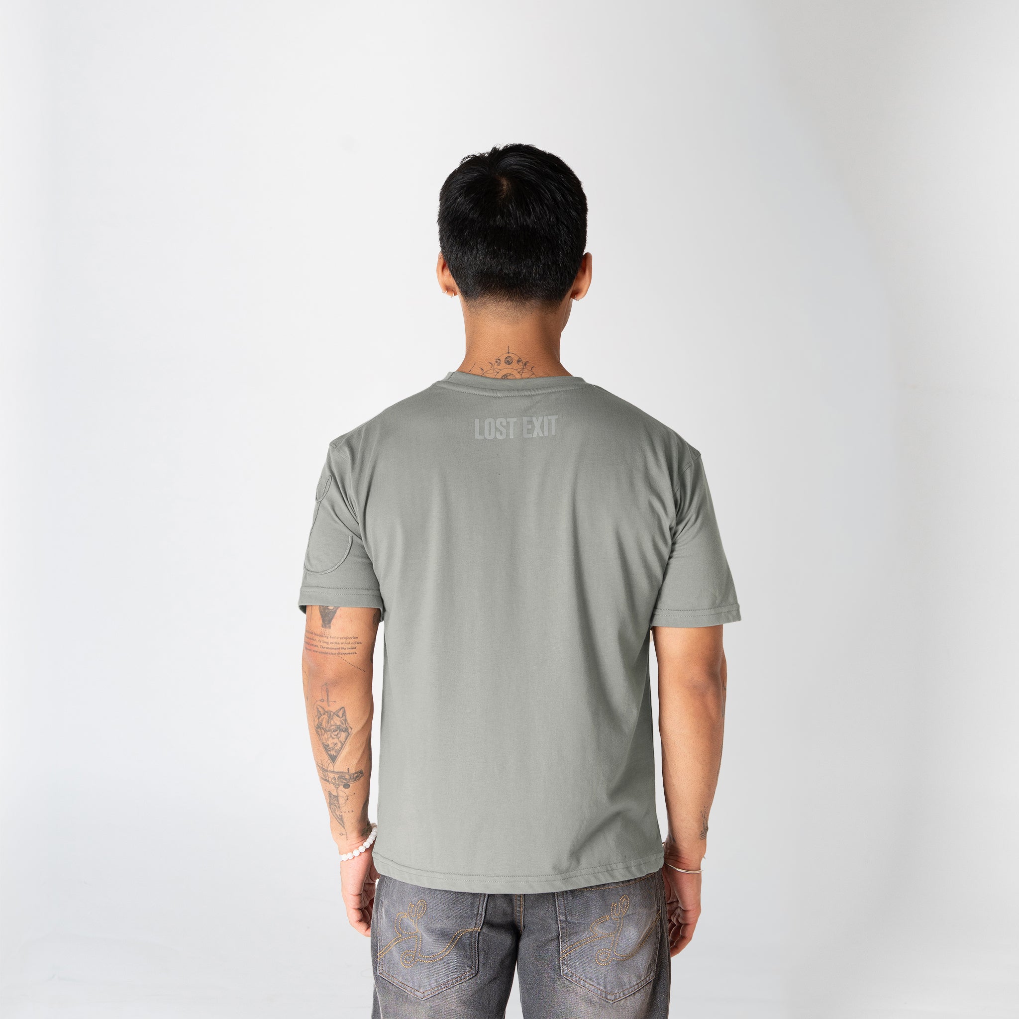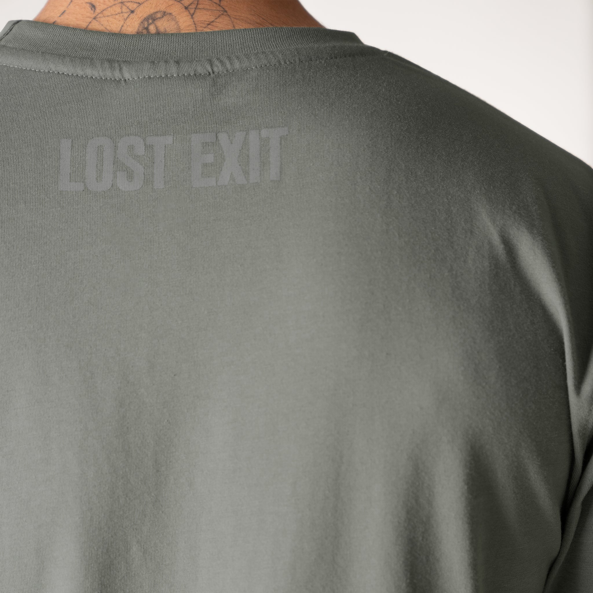 A relaxed-fit cotton t-shirt in olive, detailed with tonal cord embroidery on the sleeves and a Lost Exit print on the back. Minimal, functional, and made for everyday wear.