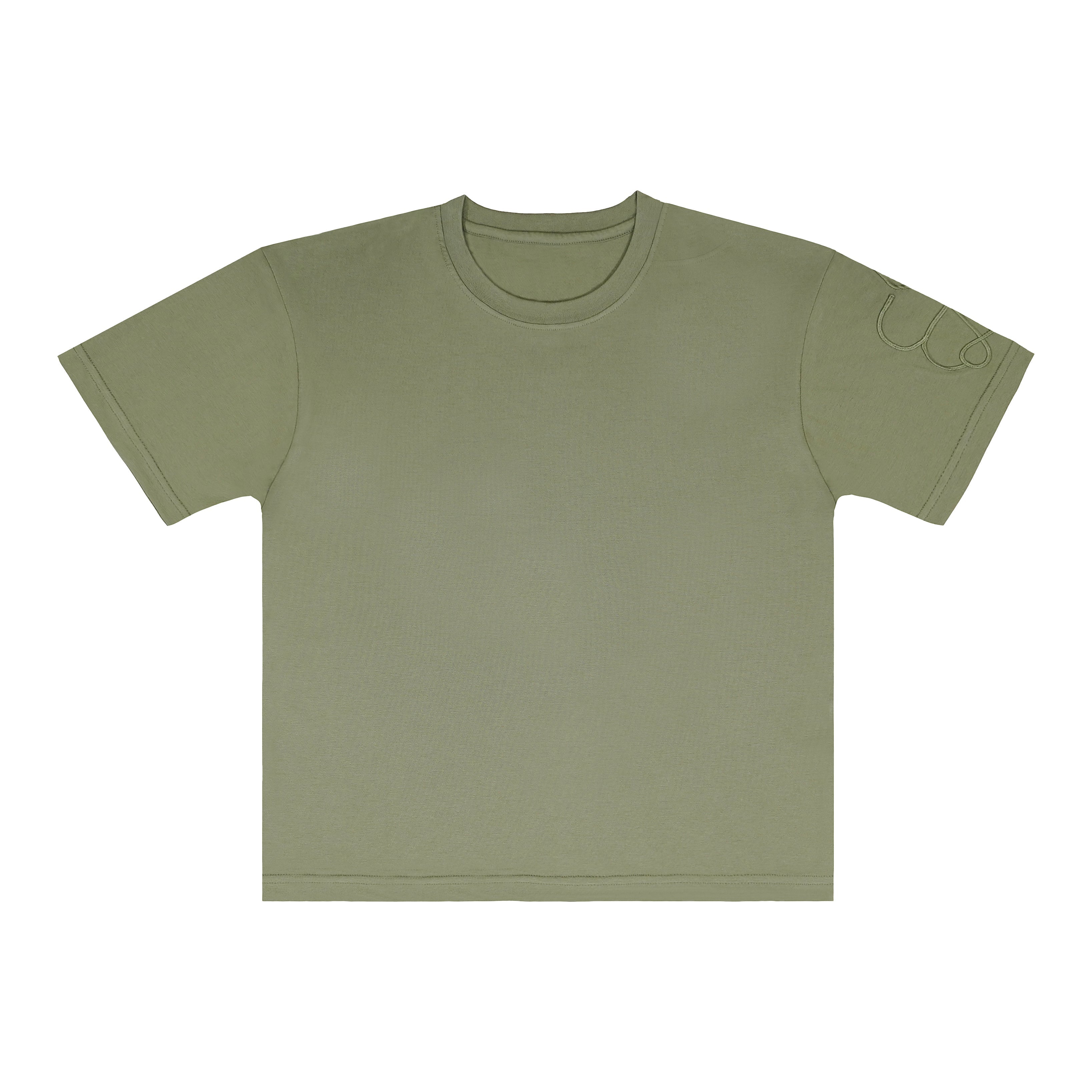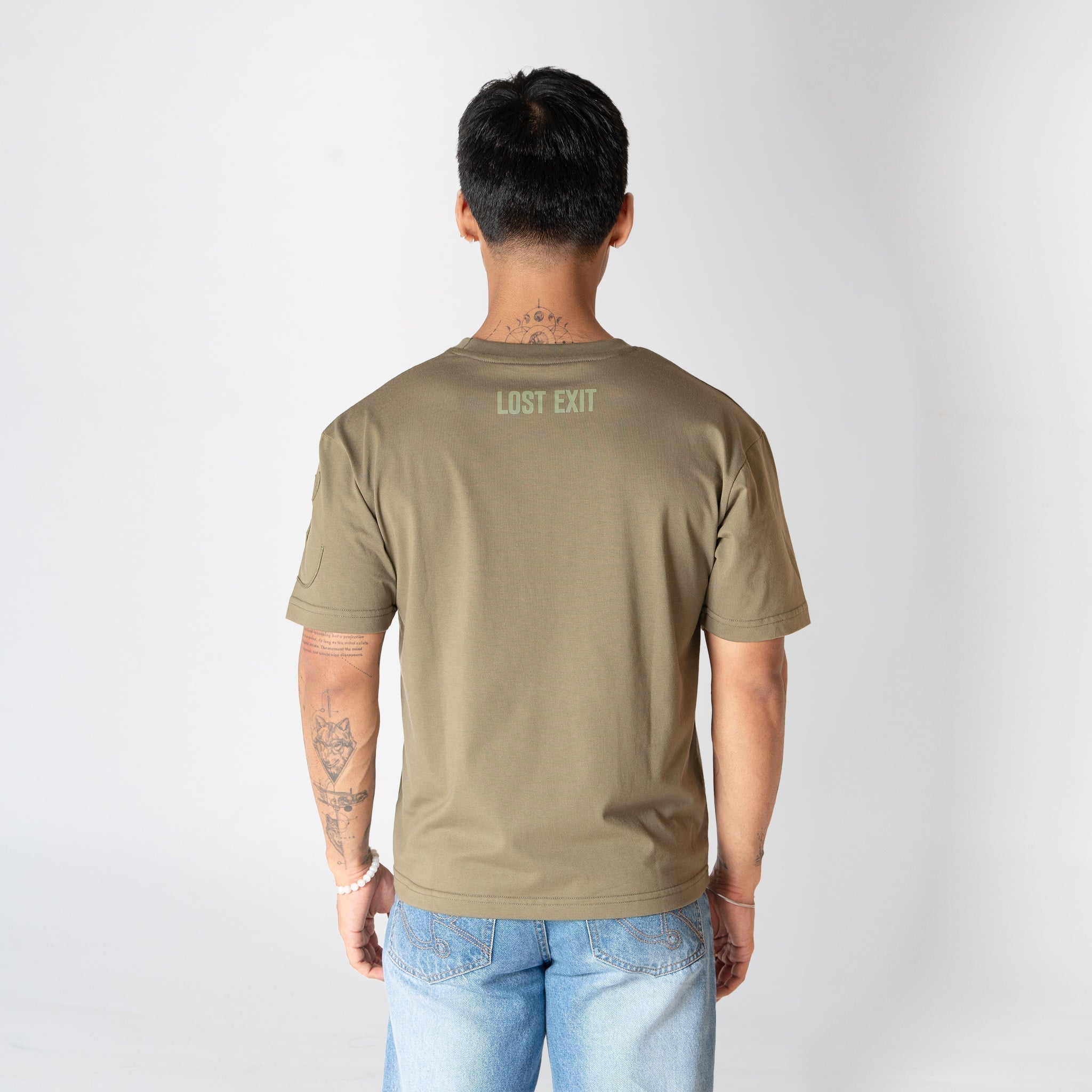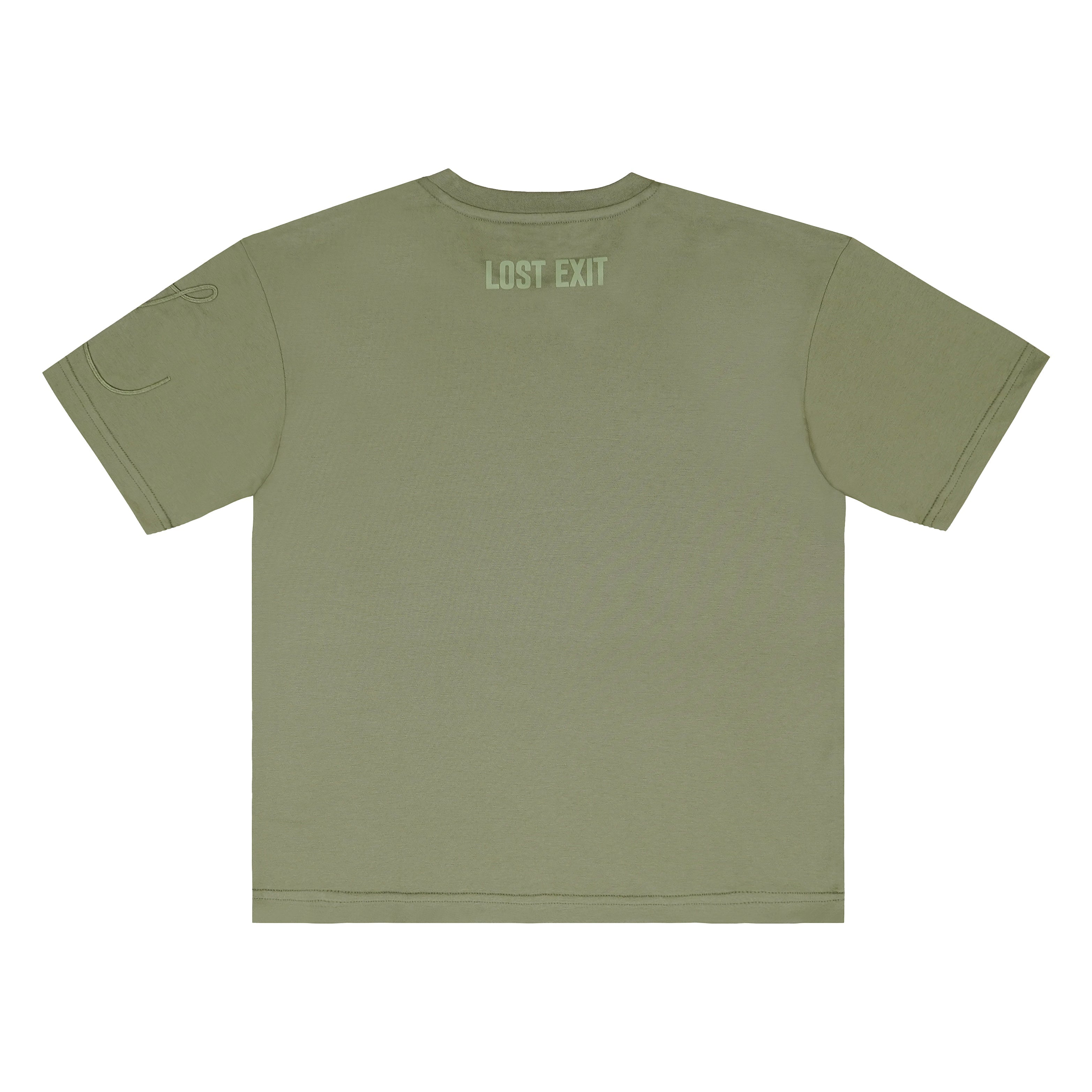 A relaxed-fit cotton t-shirt in olive, detailed with tonal cord embroidery on the sleeves and a Lost Exit print on the back. Minimal, functional, and made for everyday wear.