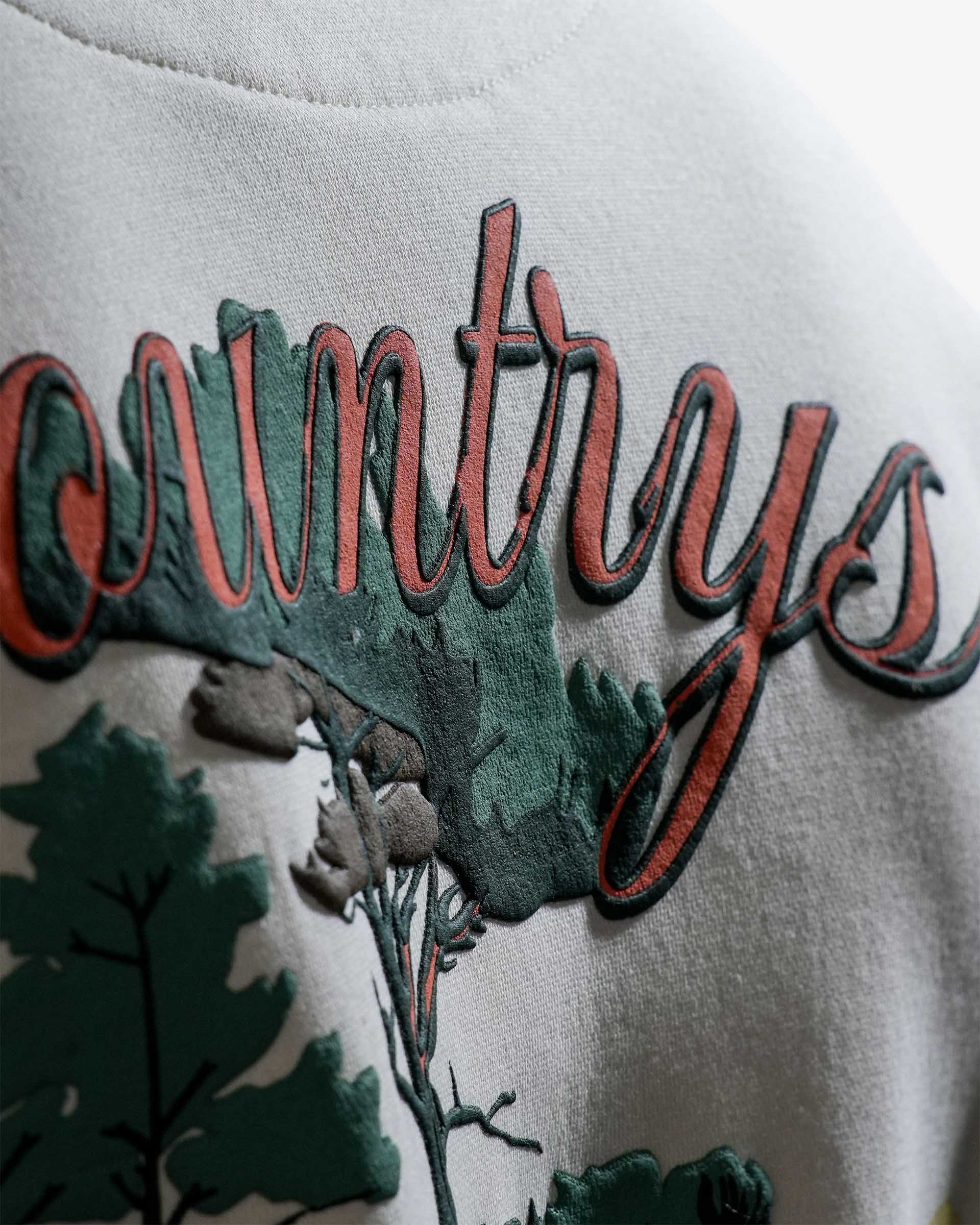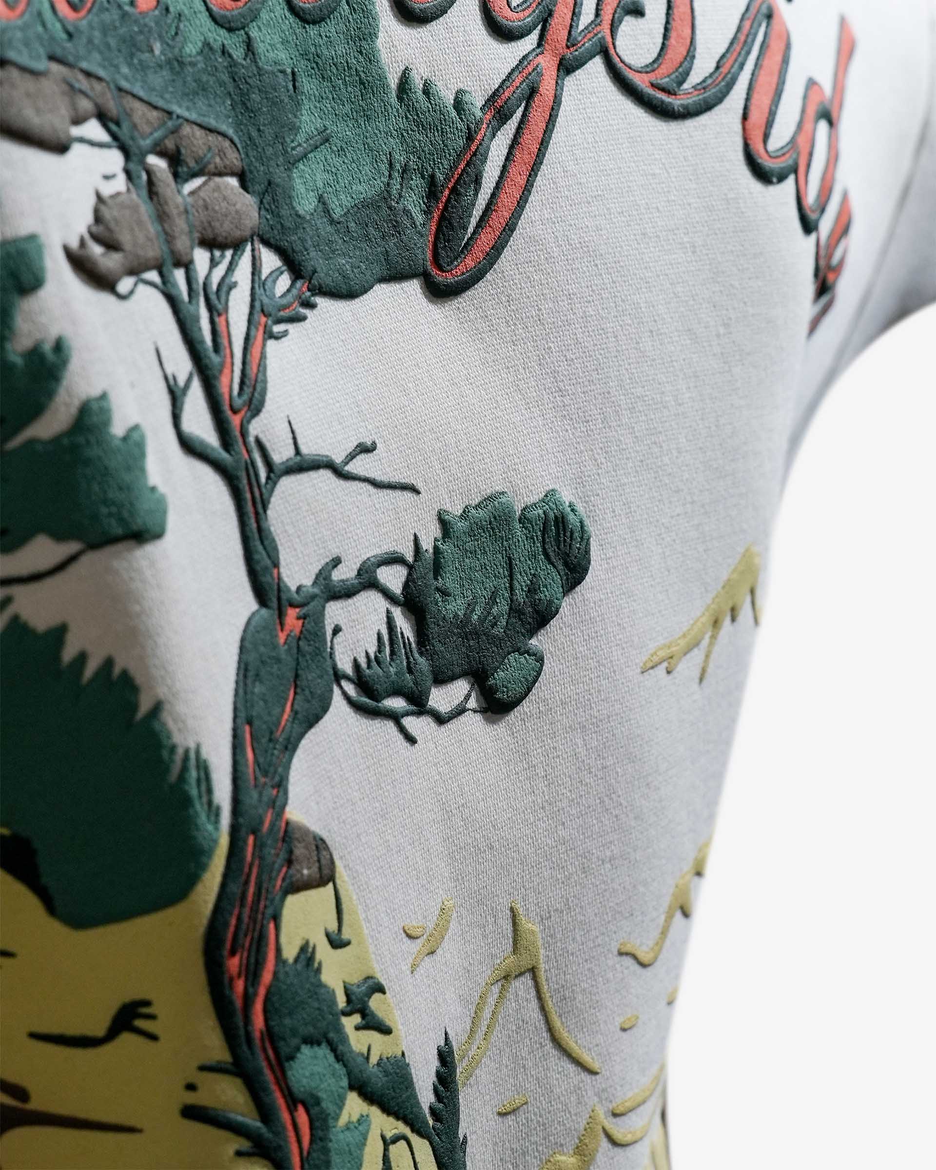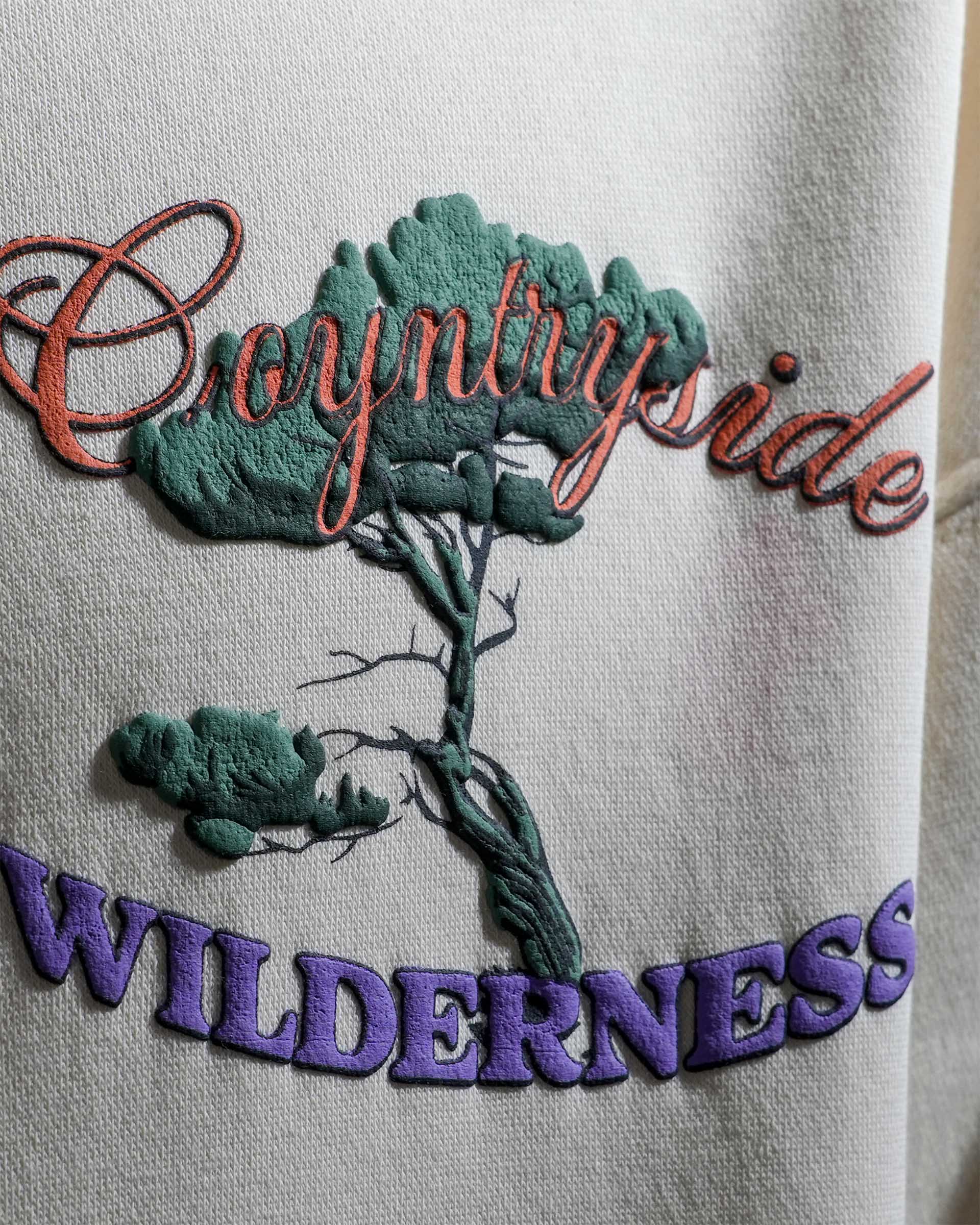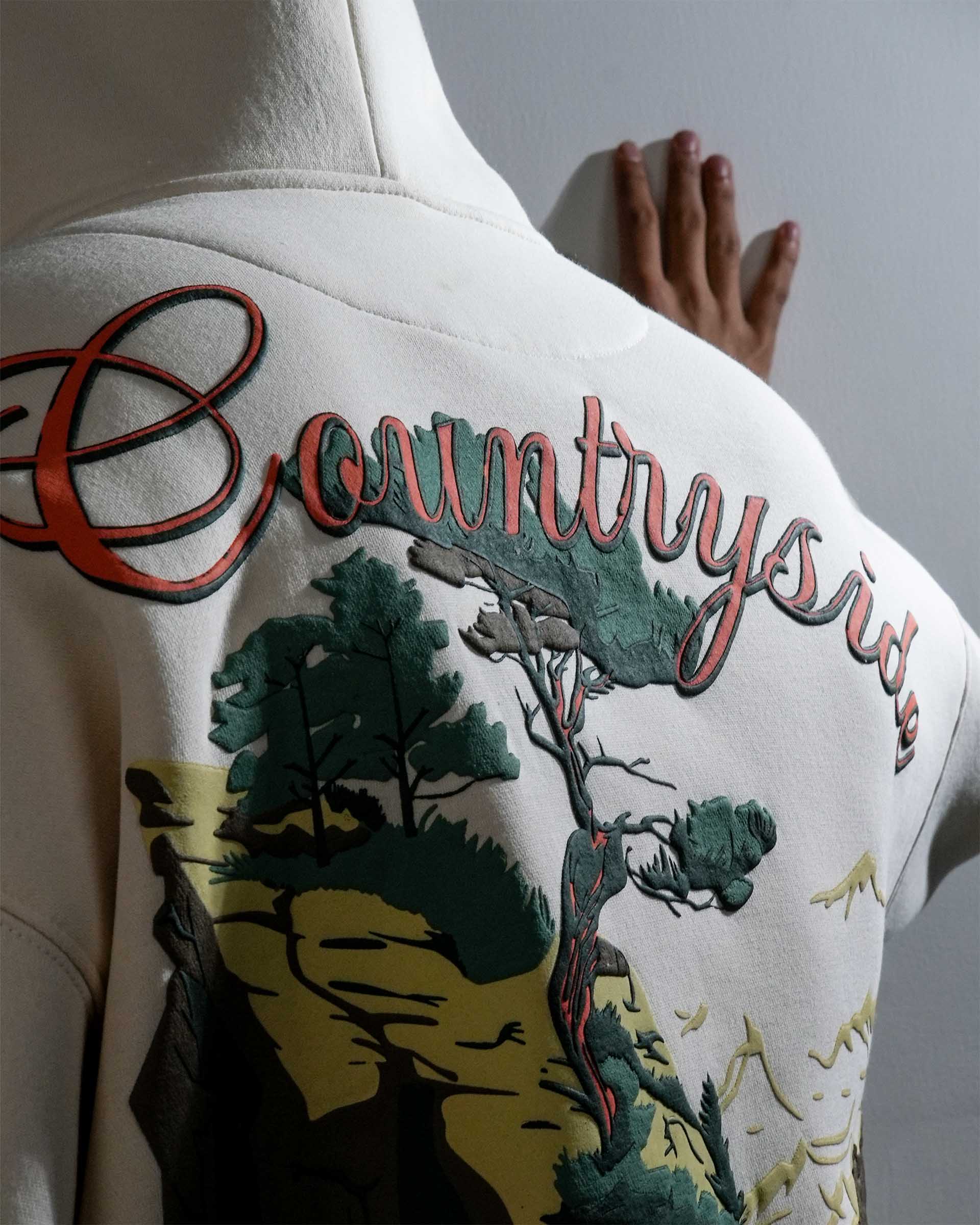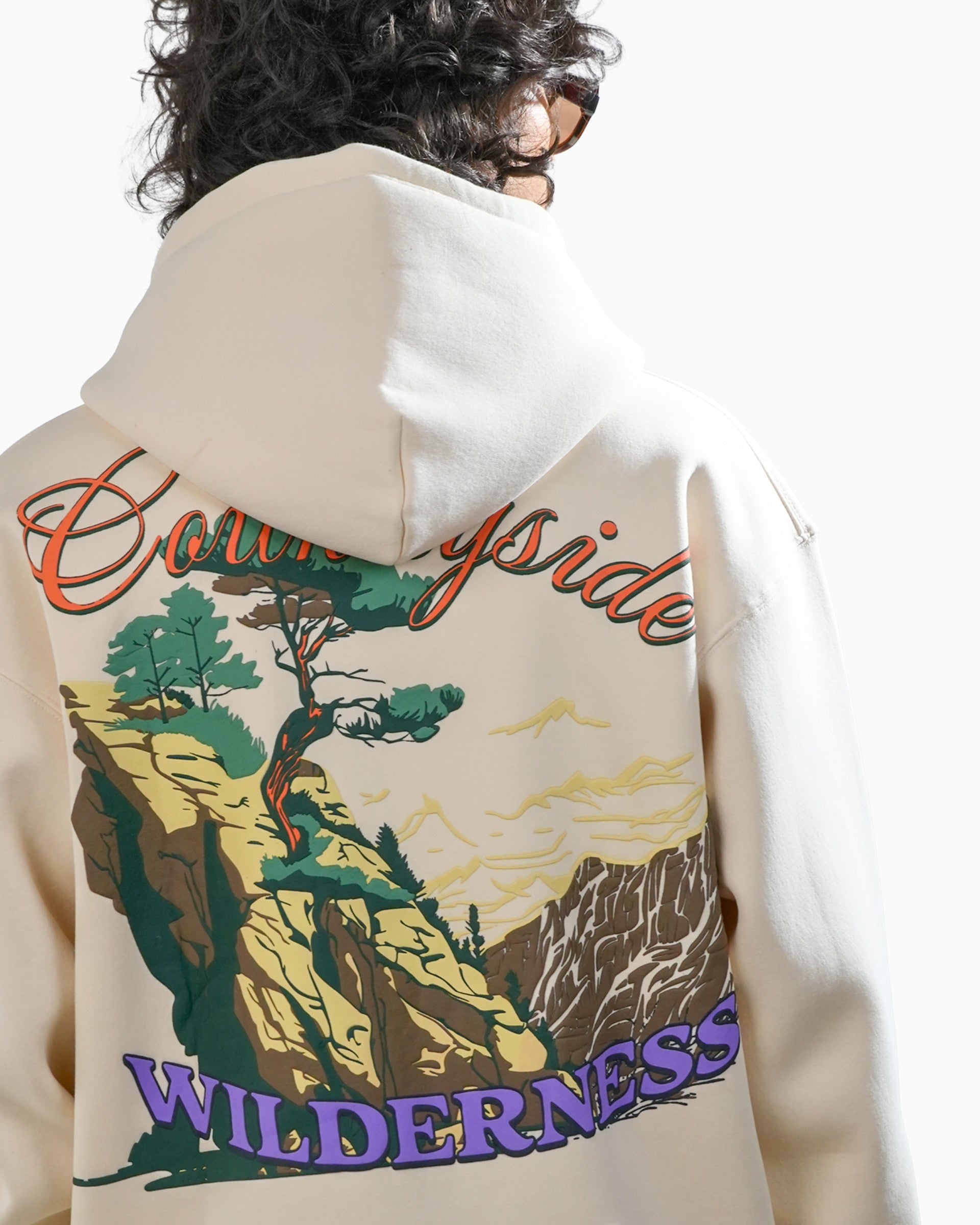 The Countryside Wilderness Hoodie in Off White is made from premium 400 GSM cotton 3-thread fleece, delivering a substantial feel with a soft, smooth finish. The oversized hooded zip-up design offers a relaxed, modern fit, while puff print graphics on the front and back add elevated texture and visual depth. Finished with durable 2x1 ribbing, this hoodie is built for everyday wear.
