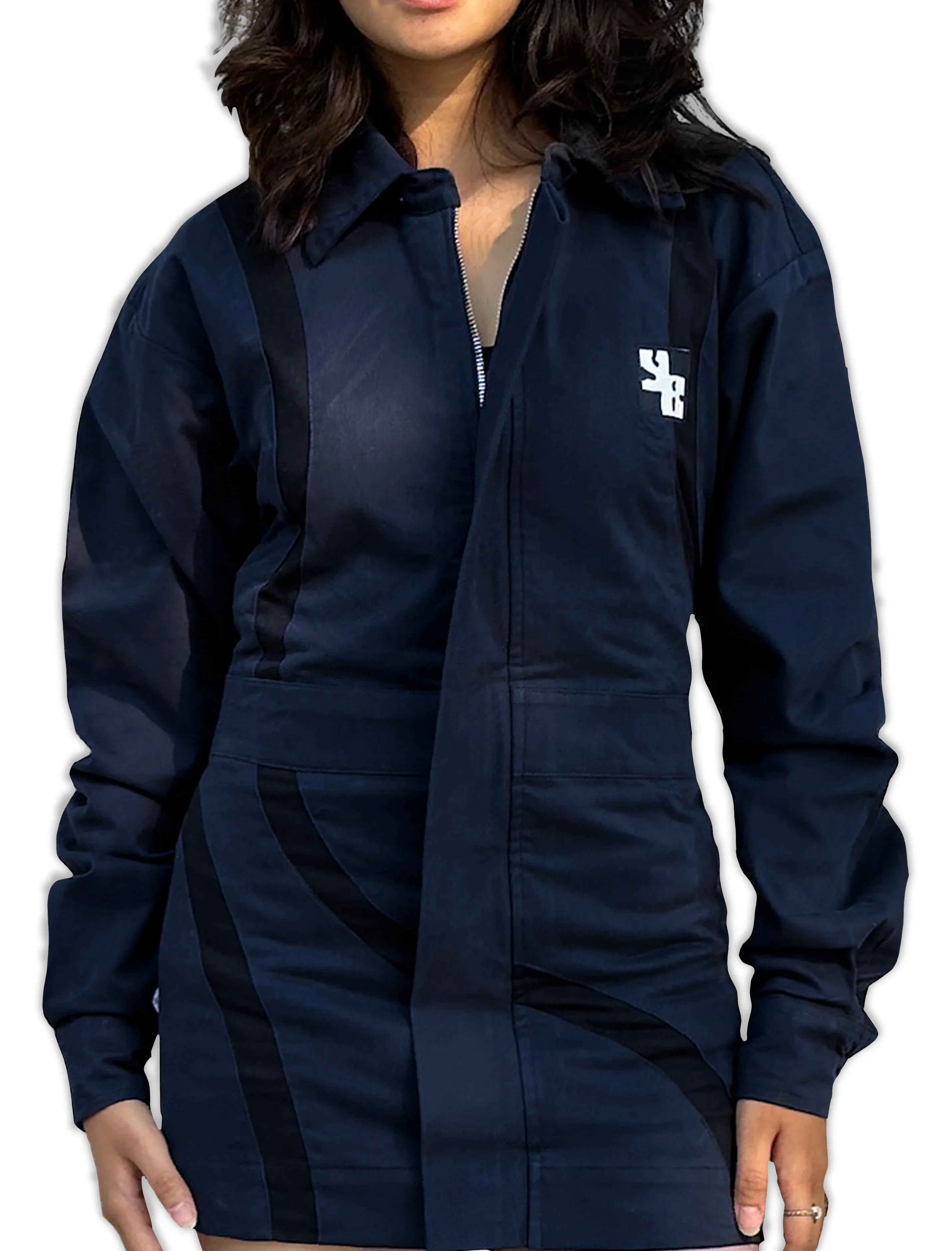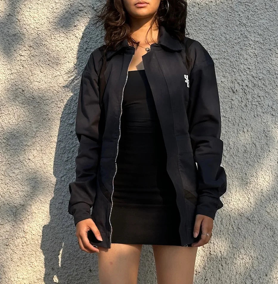 Crater Dress, featuring dynamic wave panel detailing that adds movement and edge. Versatile enough to style as a jacket or dress, it’s the perfect choice for making a statement at any party.