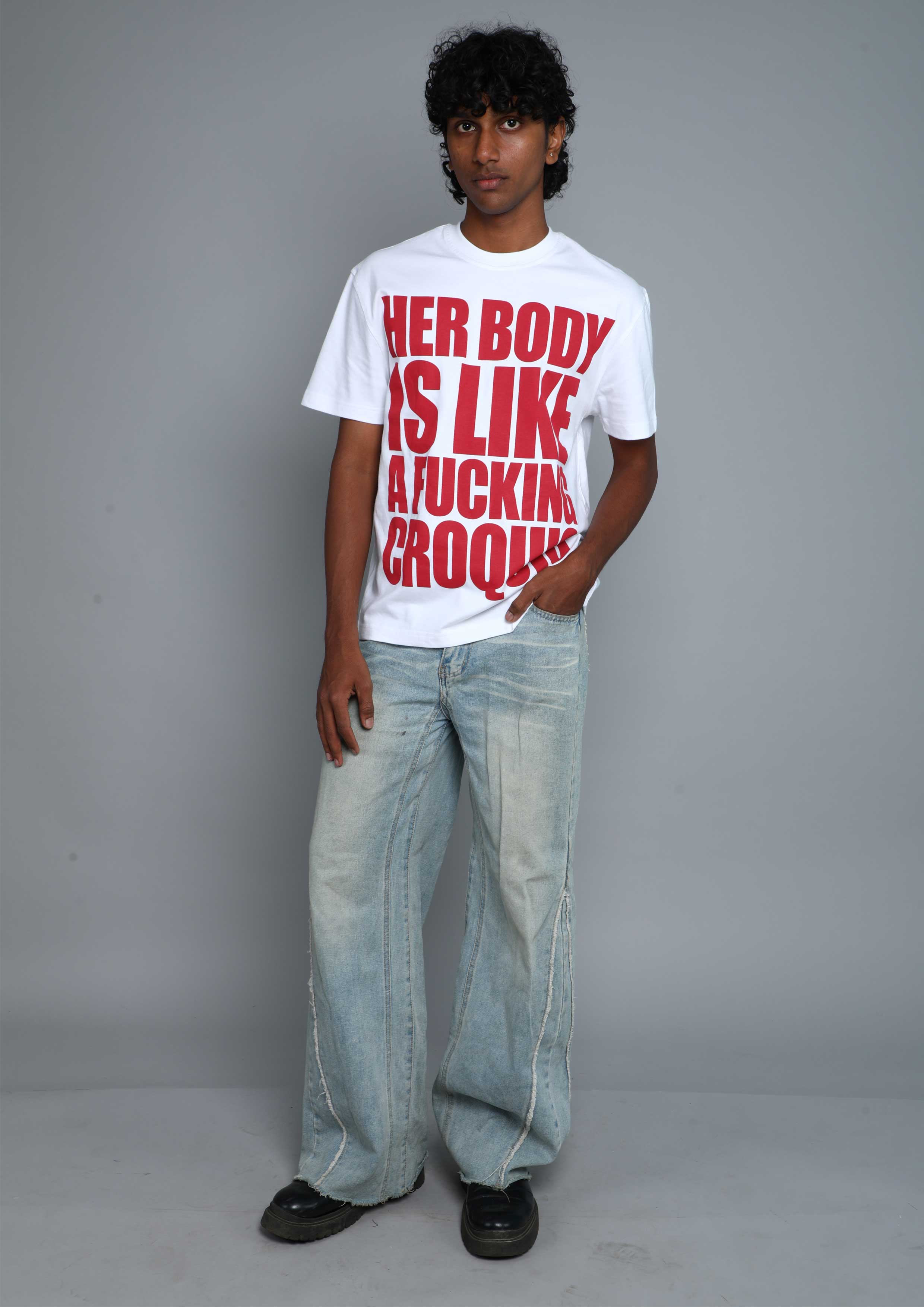 Premium stretch cotton for a sculpted fit, Clean crew neck with reinforced stitching. Subtle grey “Croquis” print across the chest.