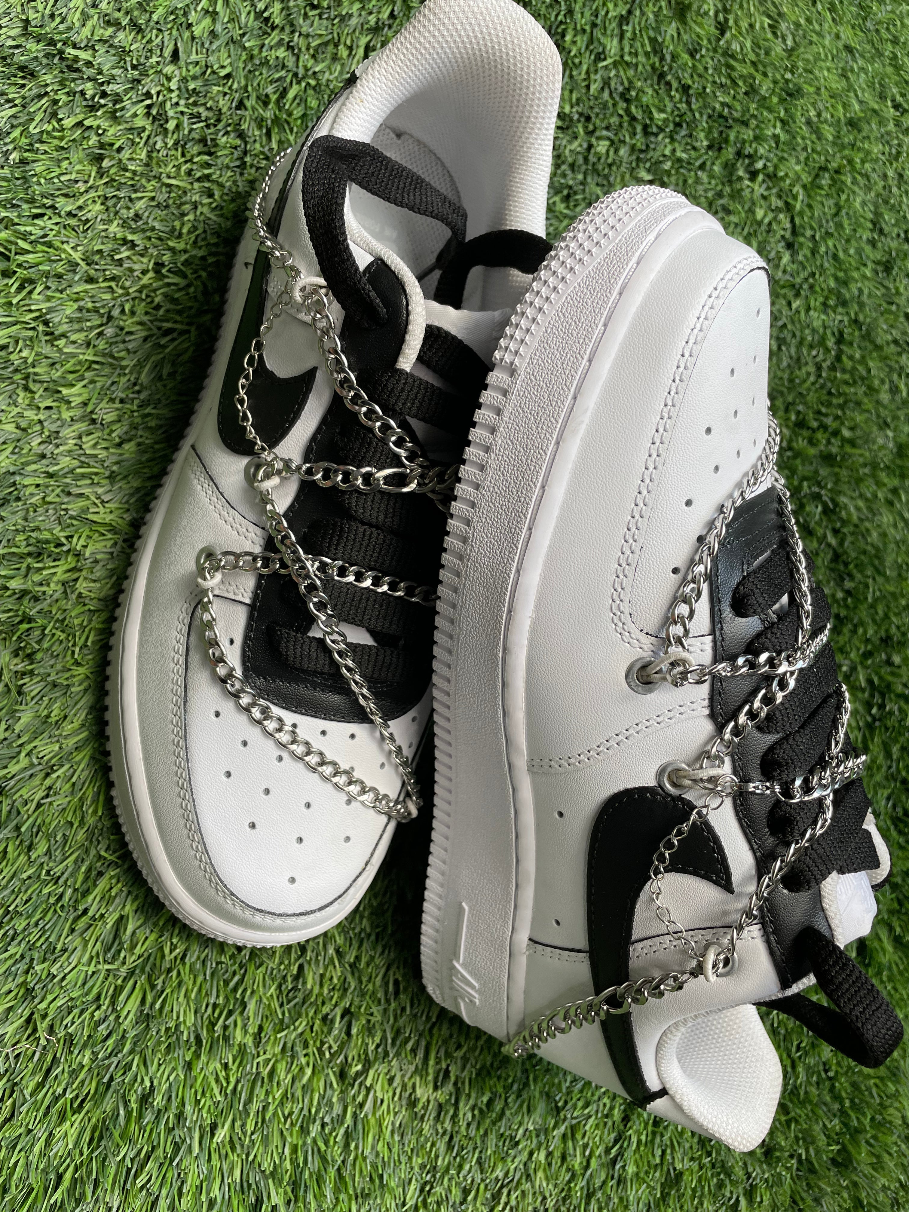 Set out on a stylish journey with the CROSS CHAIN AF1 WHITE/BLACK! This Nike AF1 stands ready for any adventure with its black highlights and a daring cross silver chain. Make a strong statement and let your style fly!