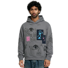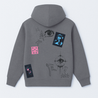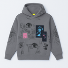 The Cryptic Canvas Hoodie in grey is a wearable masterpiece of chaos and creativity. Adorned with scribble art, cryptic symbols like eyes, demons, flames, leaves, and teeth, it’s a visual rebellion that screams individuality.