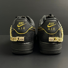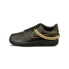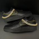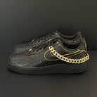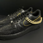 Classic black Air Force 1 covered in tuxedo black glitter and accented by gold borders on the iconic swoosh with an elegant gold pave cuban chain for a touch of opulence.