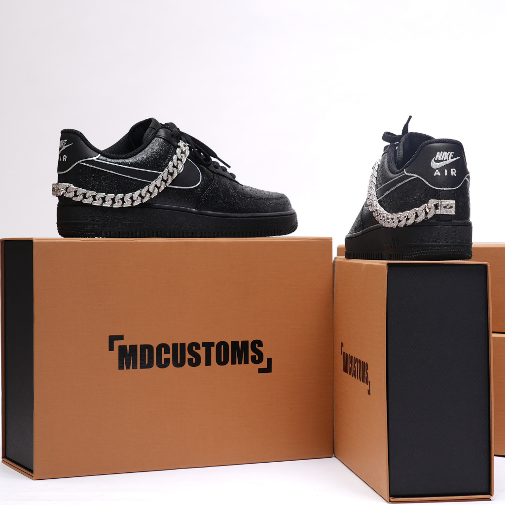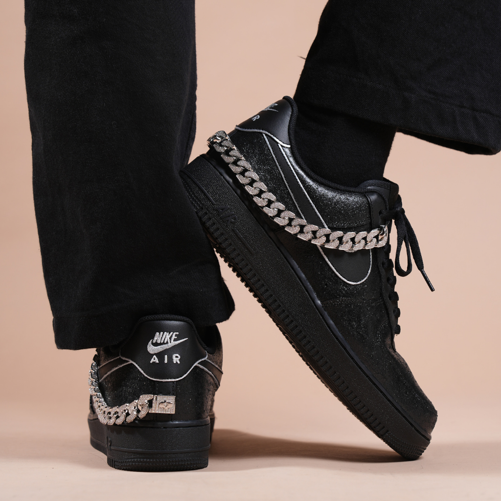 Classic black Air Force 1 covered in tuxedo black glitter and accented by silver borders on the iconic swoosh with an elegant silver pave cuban chain for a touch of opulence.