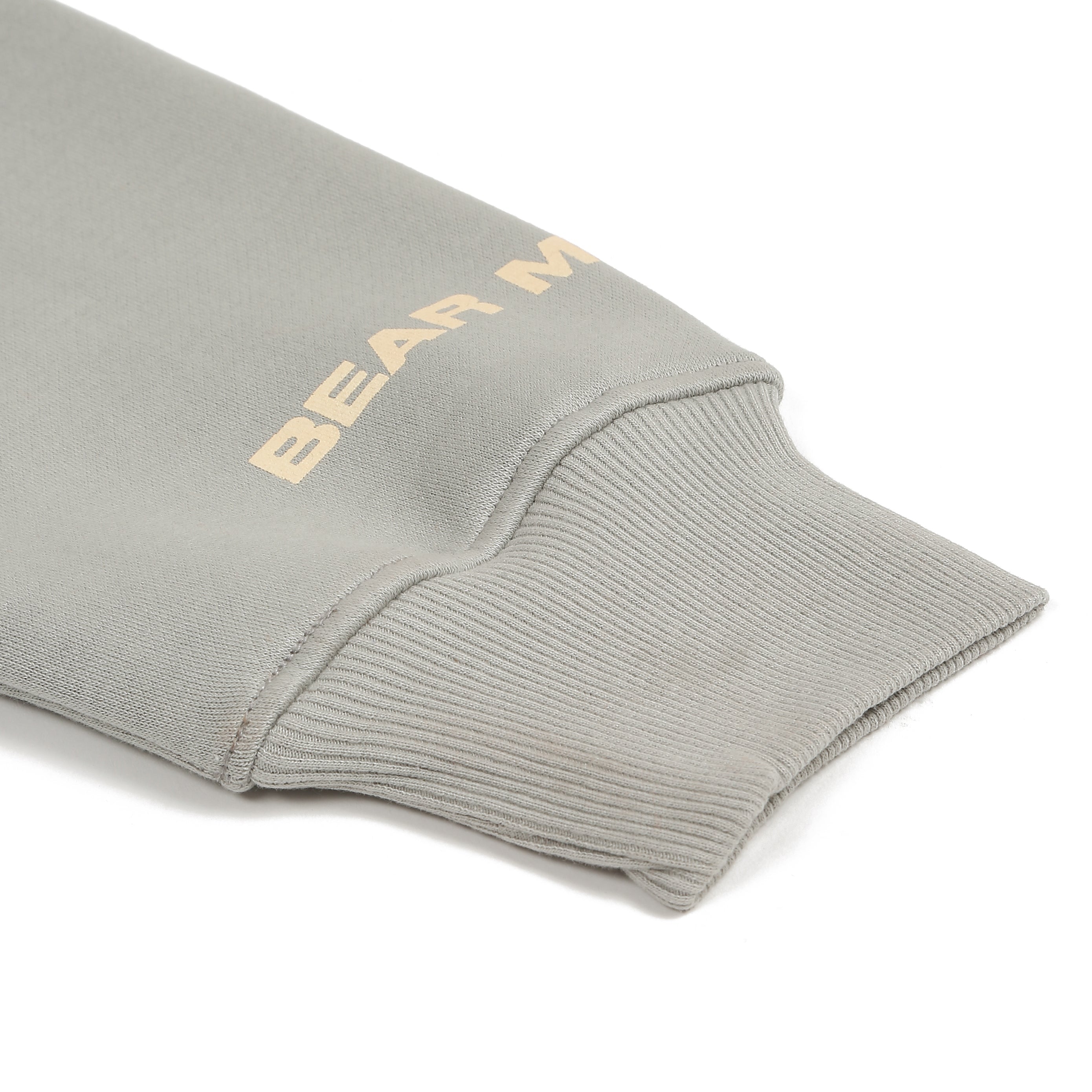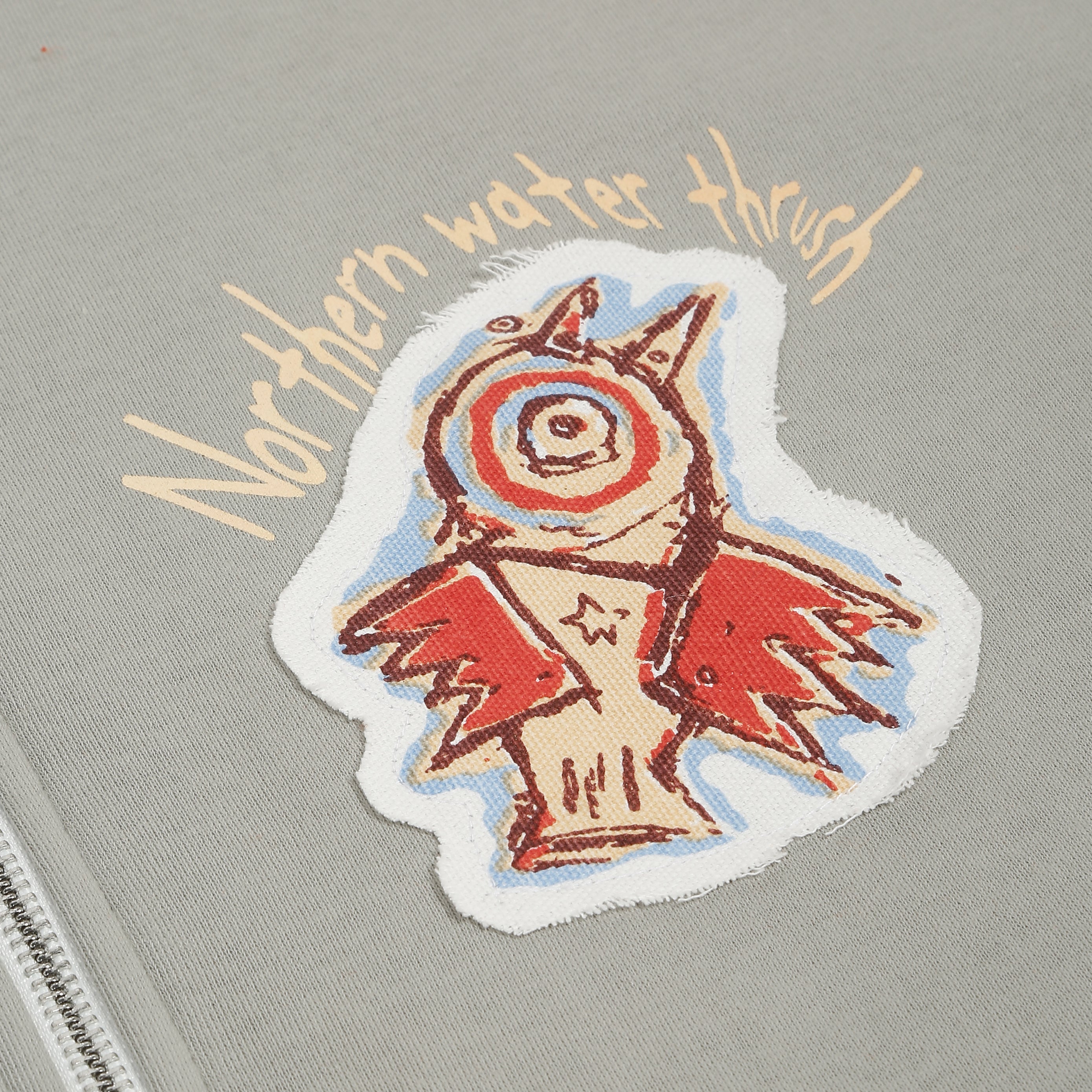 A silver grey 100% cotton fleece zipper hoodie featuring intricate patch work for a bold, storytelling design. The front patch depicts a cuckoo bird with the text “laying northern water thrush” and a cleverly integrated “if not now then when.” On the back, two patches showcase a man riding a cuckoo and a disfigured human image, accompanied by the cheeky text “my mom said I am special So fuck you,” tied together with the Bear Minimal logo.