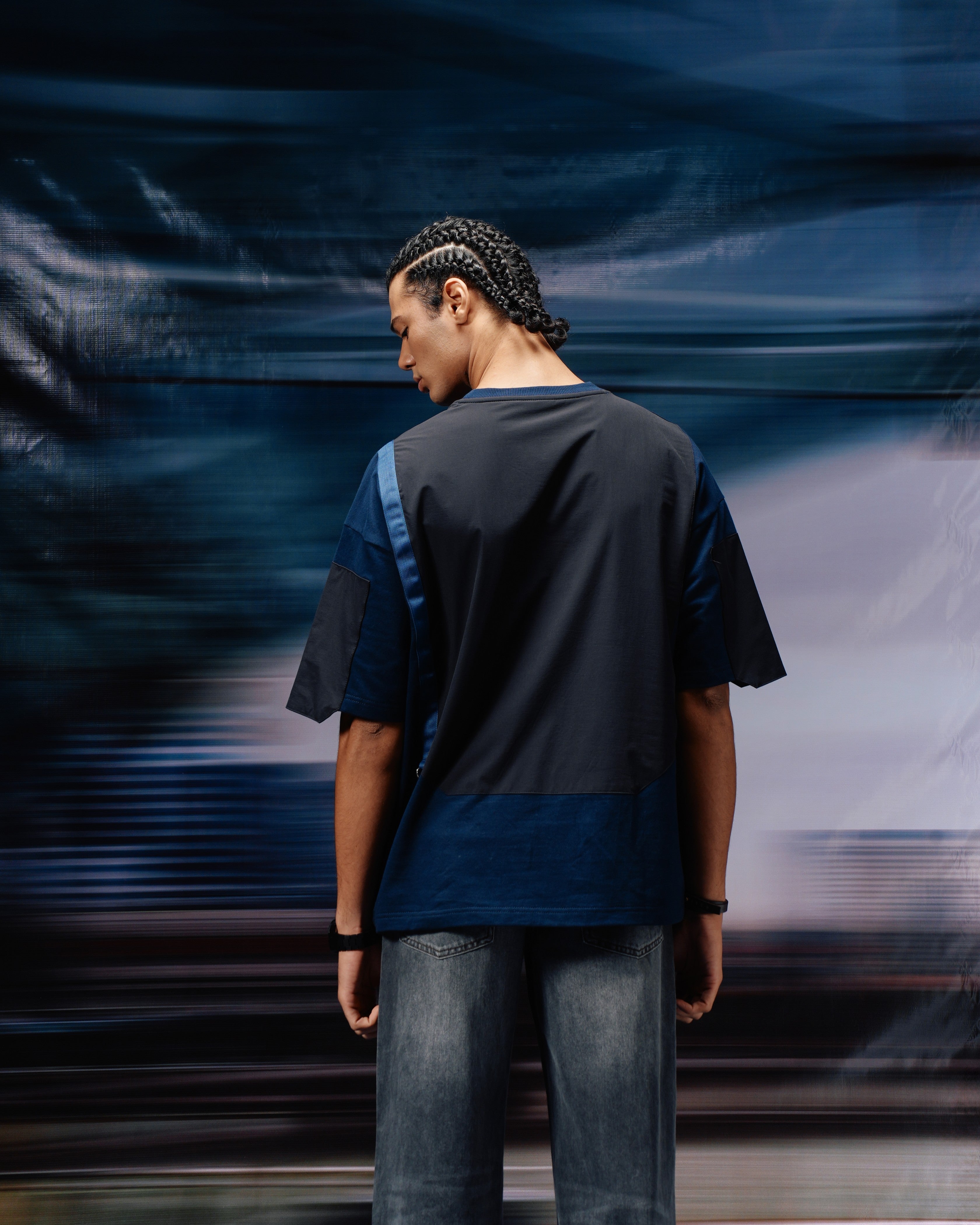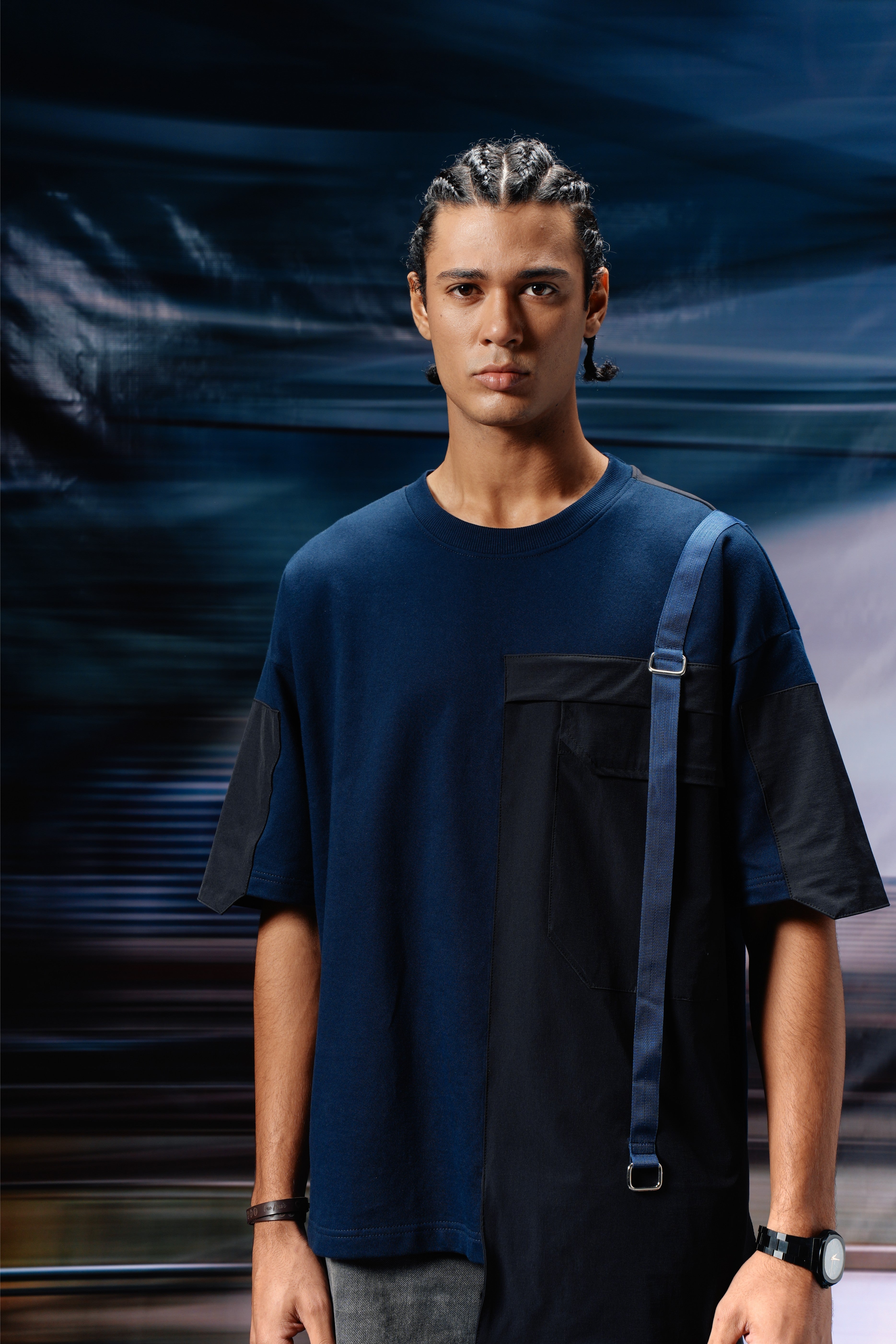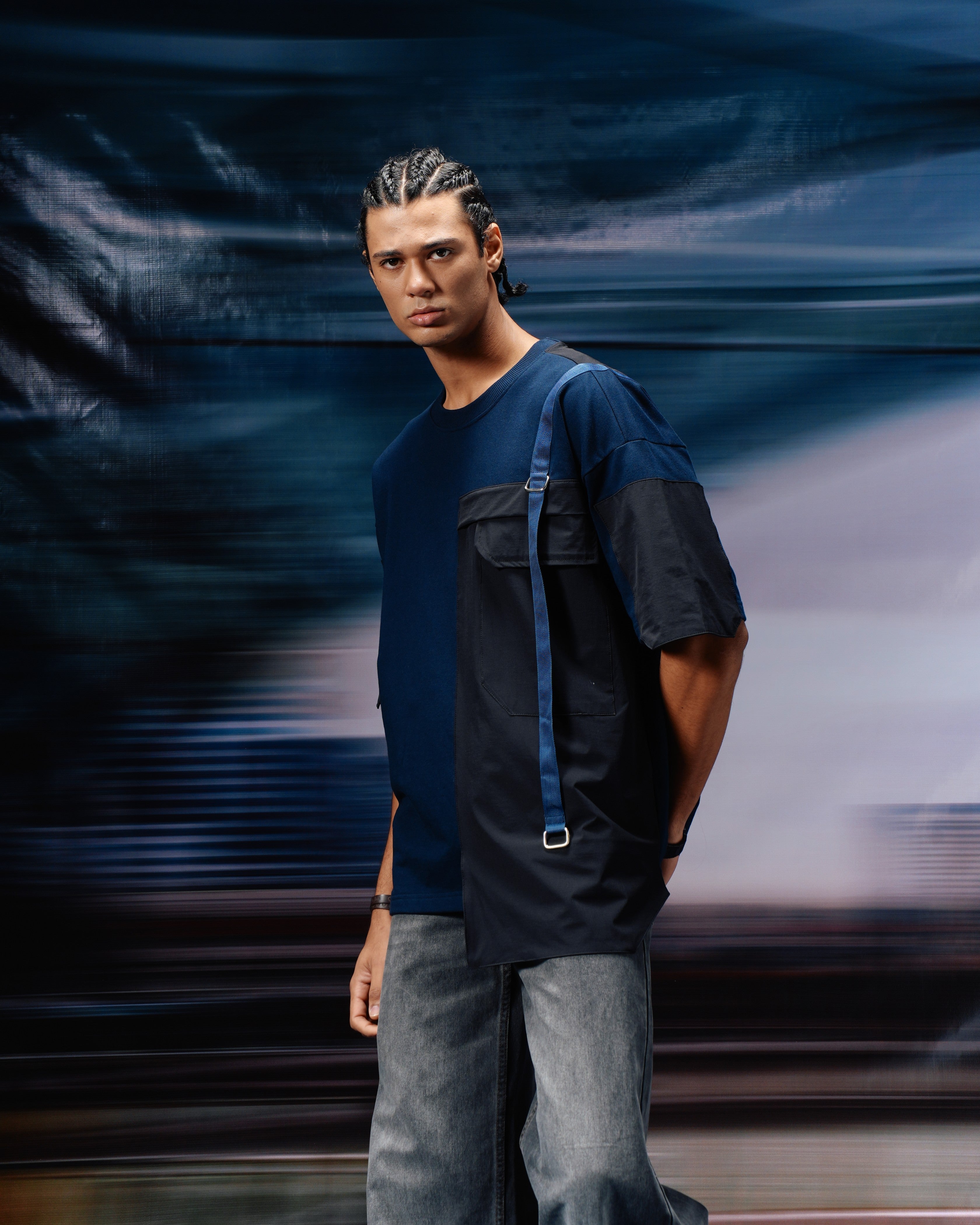 This multi fabric panelled tshirt in navy and black comes with hardware & twill tape detail in 100% cotton..The tshirt is a great pick for any cafe to party scenes you have. The fit is oversized and baggy.