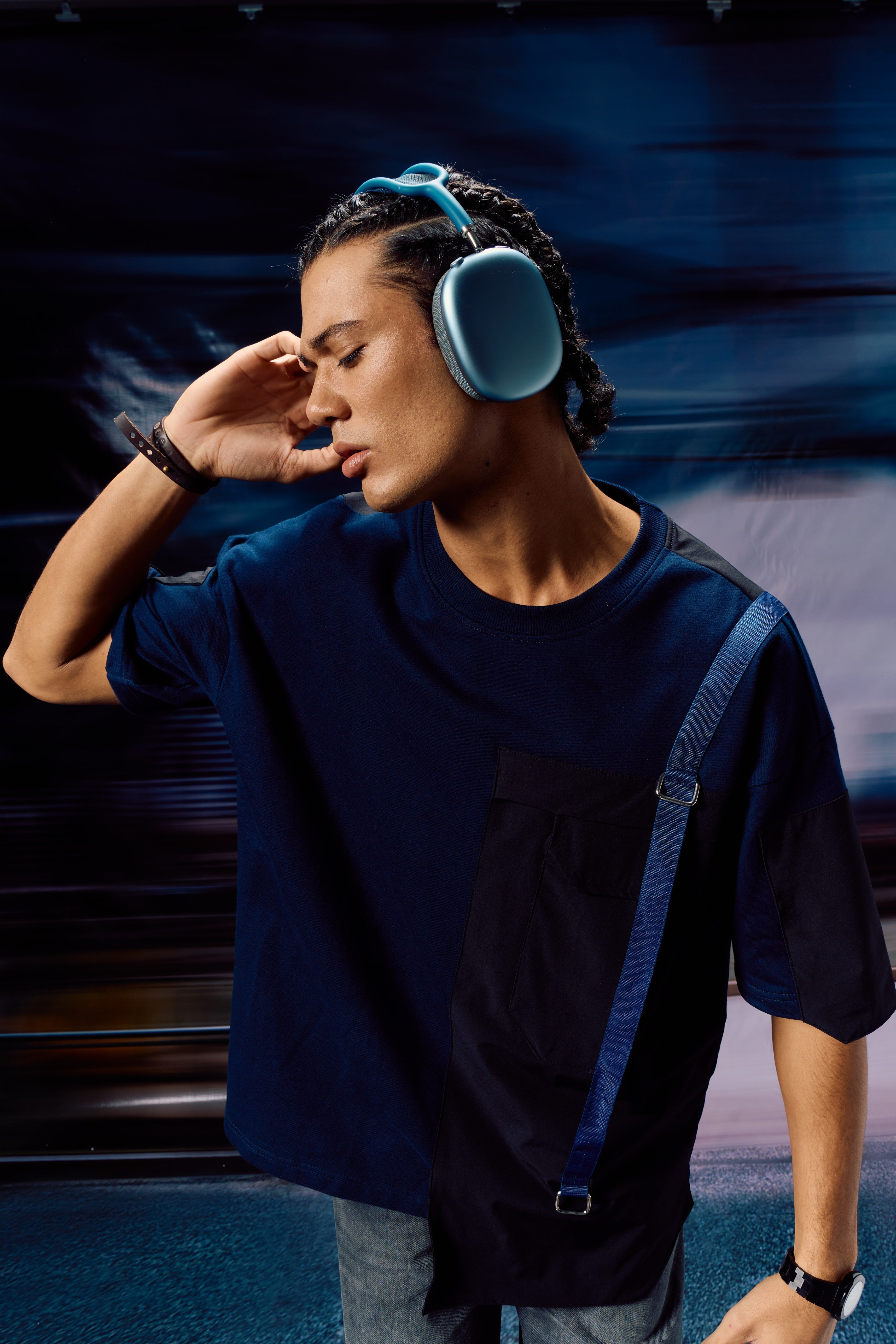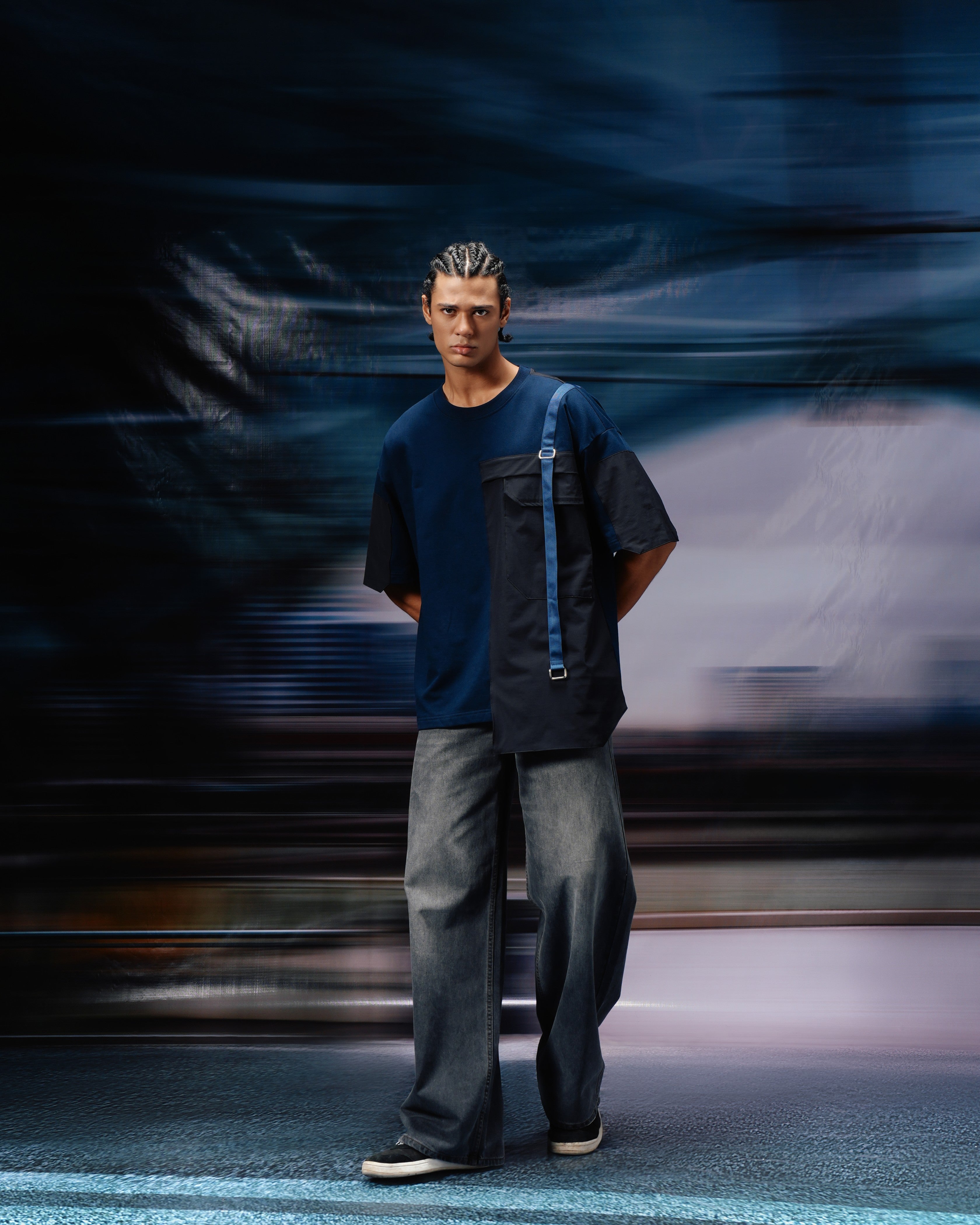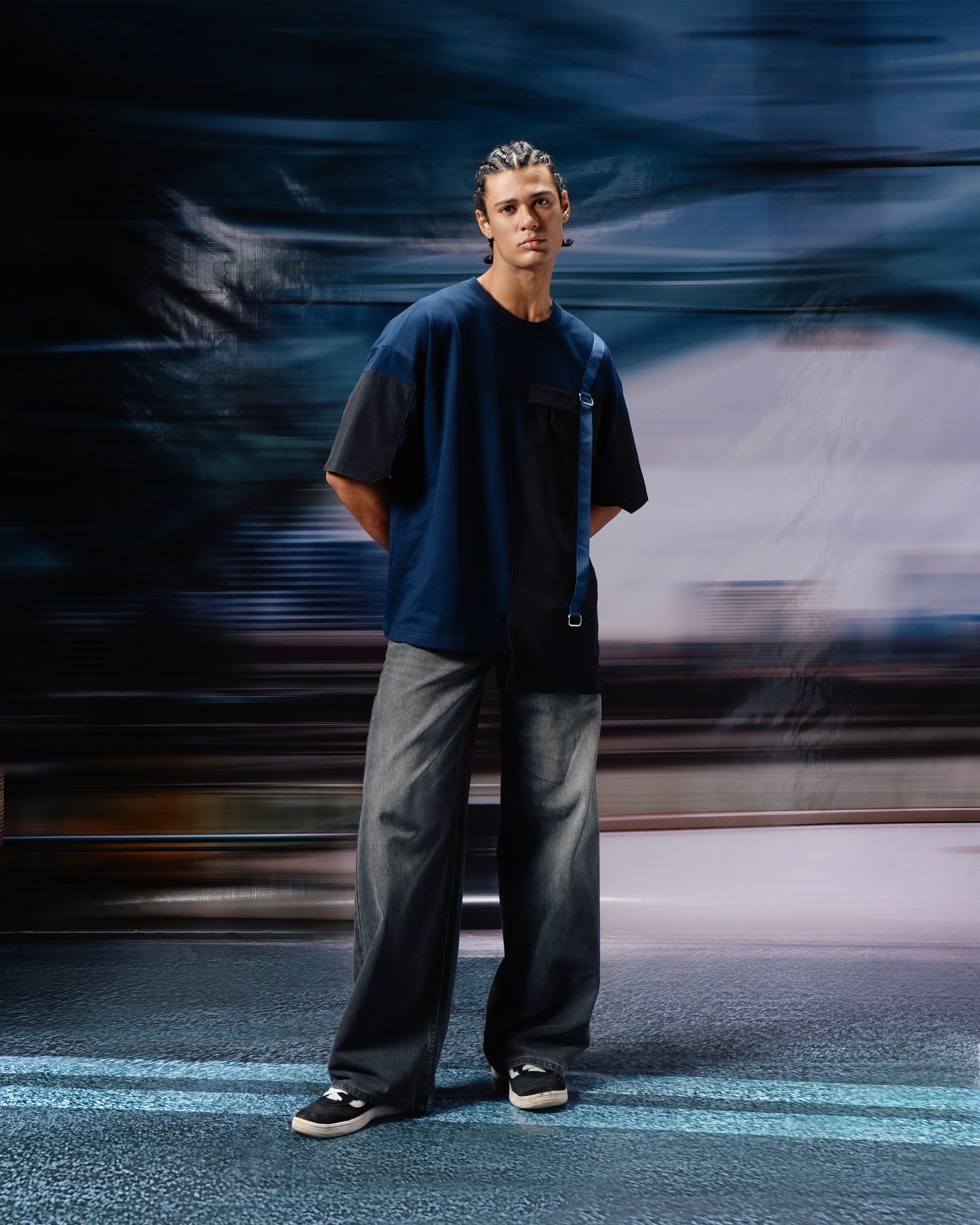 This multi fabric panelled tshirt in navy and black comes with hardware & twill tape detail in 100% cotton..The tshirt is a great pick for any cafe to party scenes you have. The fit is oversized and baggy.