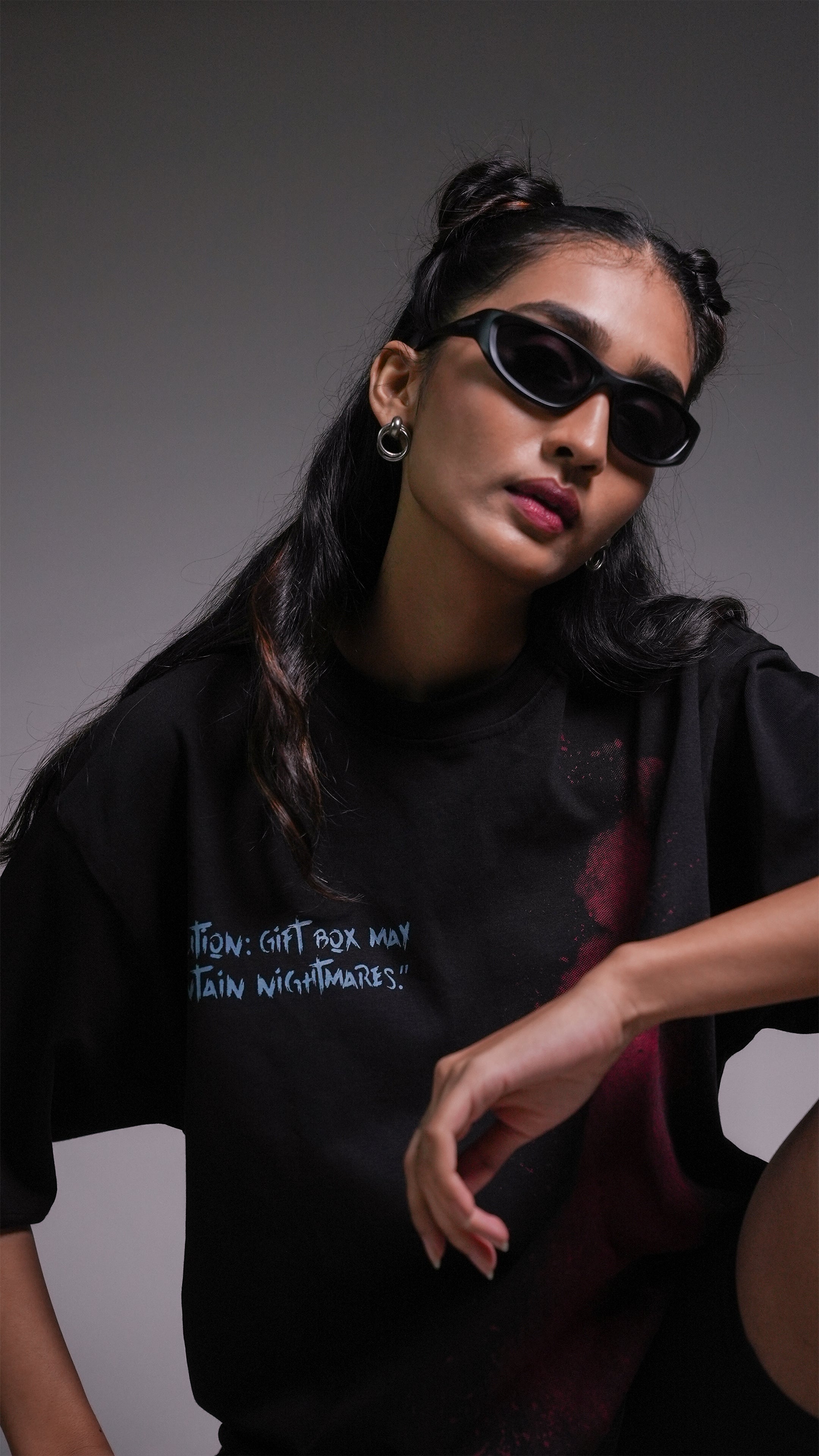 This 300 GSM single jersey cotton tee brings a cinematic twist to your wardrobe. Featuring a mysterious “gift box” graphic at the back and a subtle clue on the front, the design blends dark humour with thriller-inspired art. The red splash effect adds drama without trying too hard. Wear it like a secret only you know.
