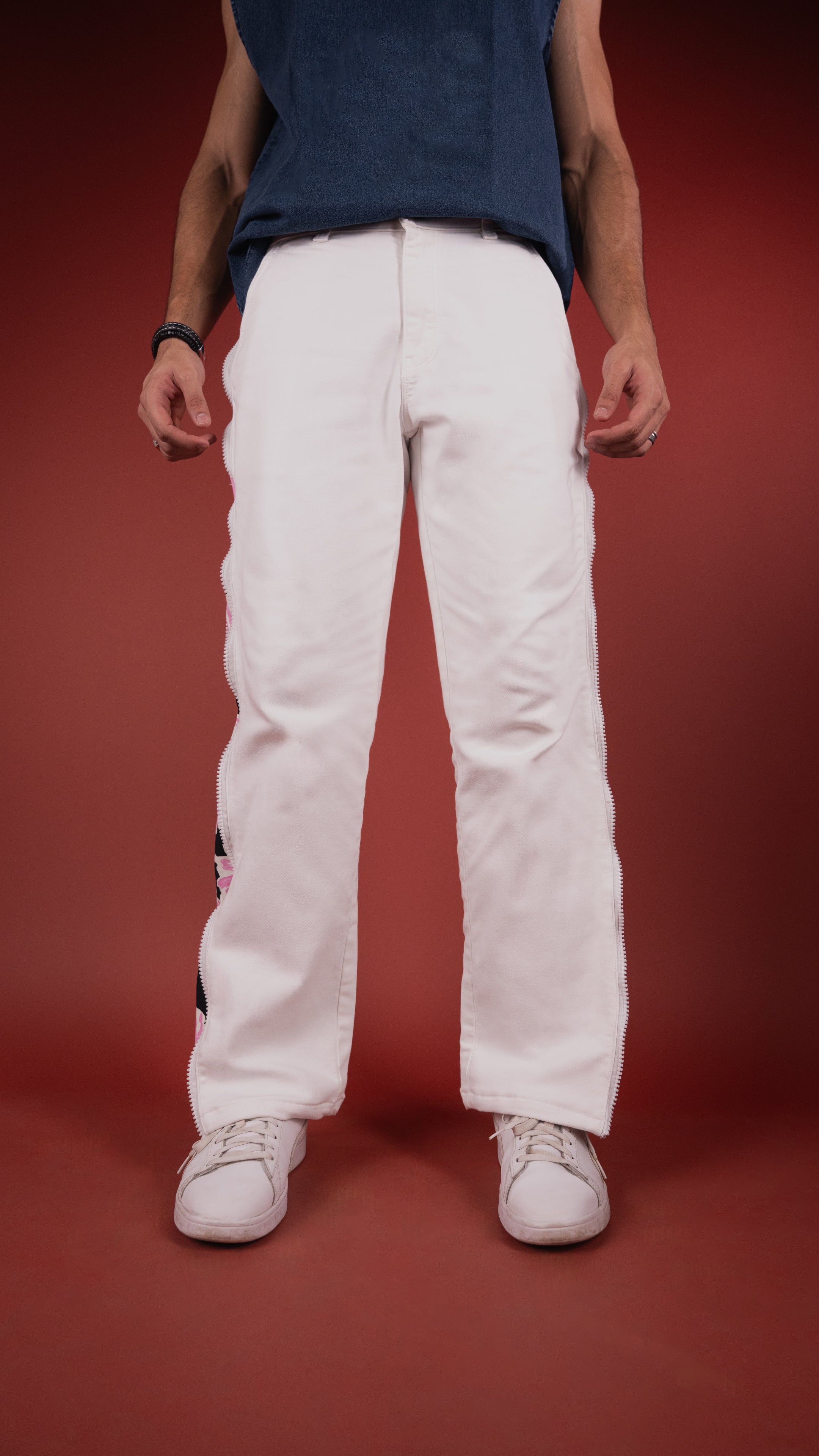 Crafted from stretch 12.5 oz white knitted denim with a standout printed cotton side panel, these pants feature a full-length fiber zipper that gives you complete control over your look. Zip it up or leave it open, you decide the vibe.