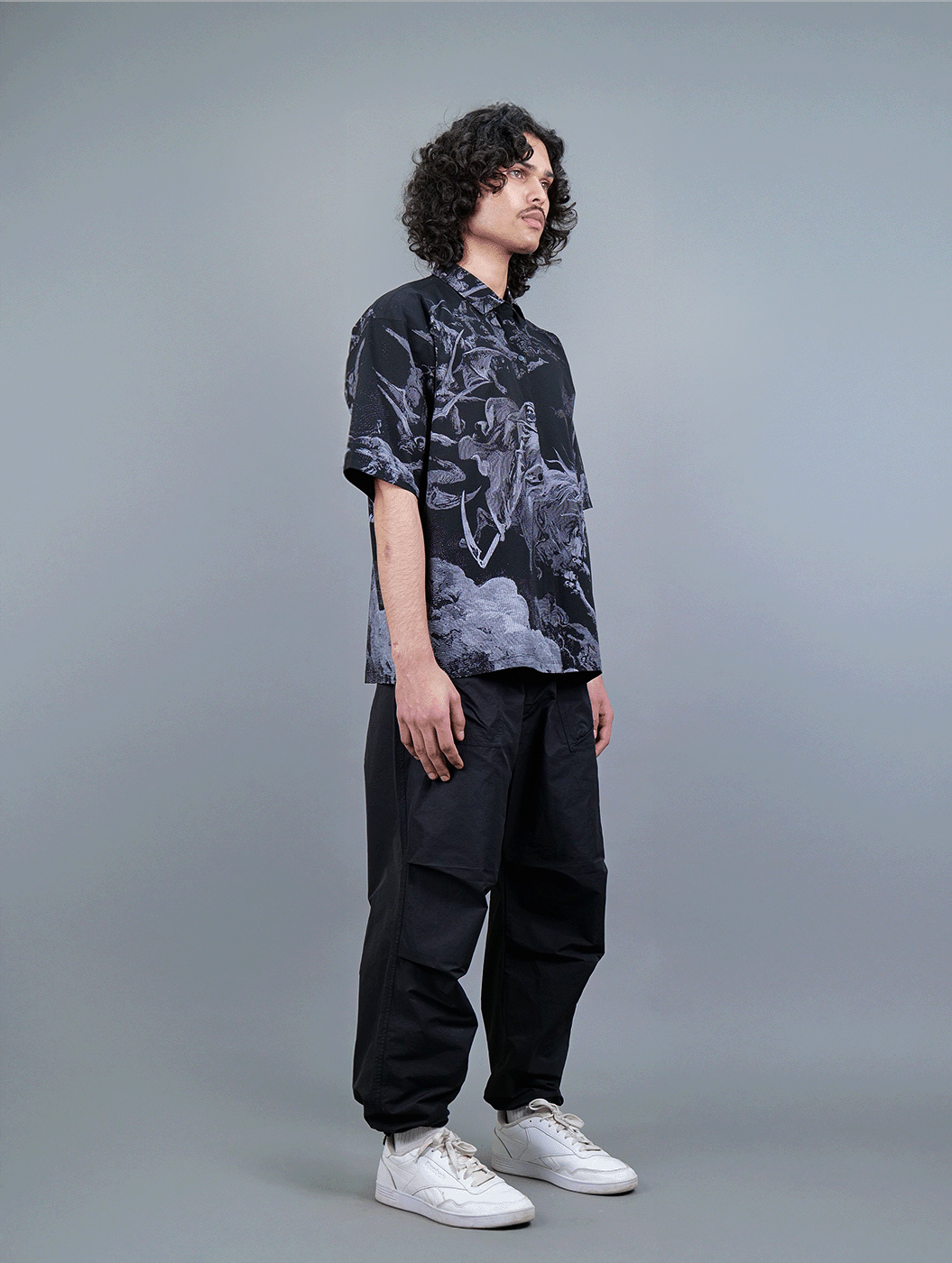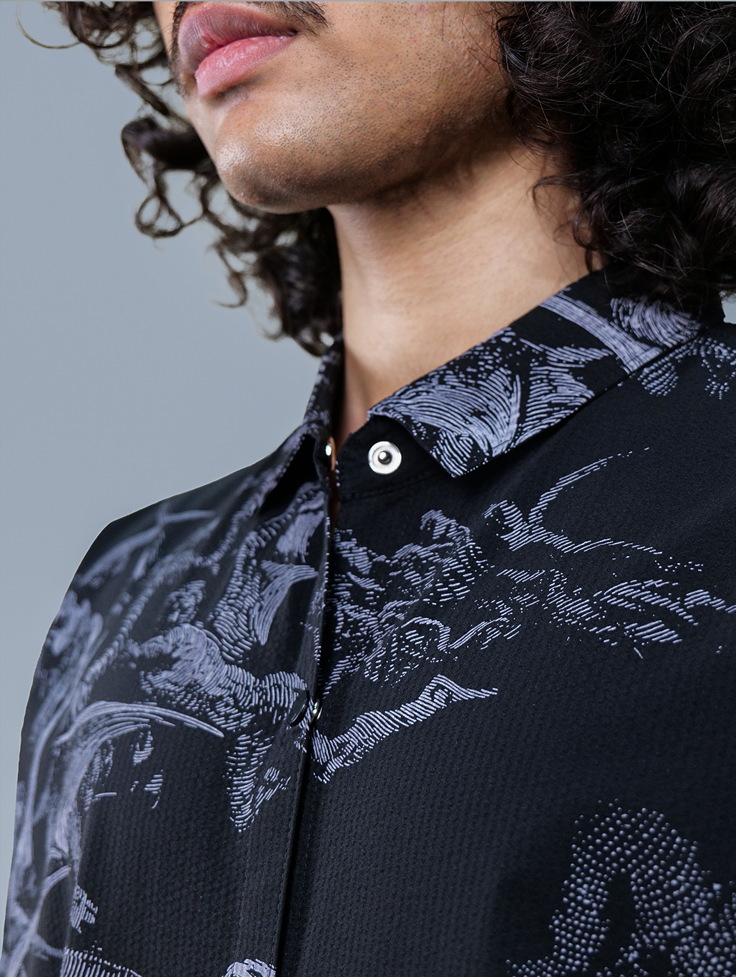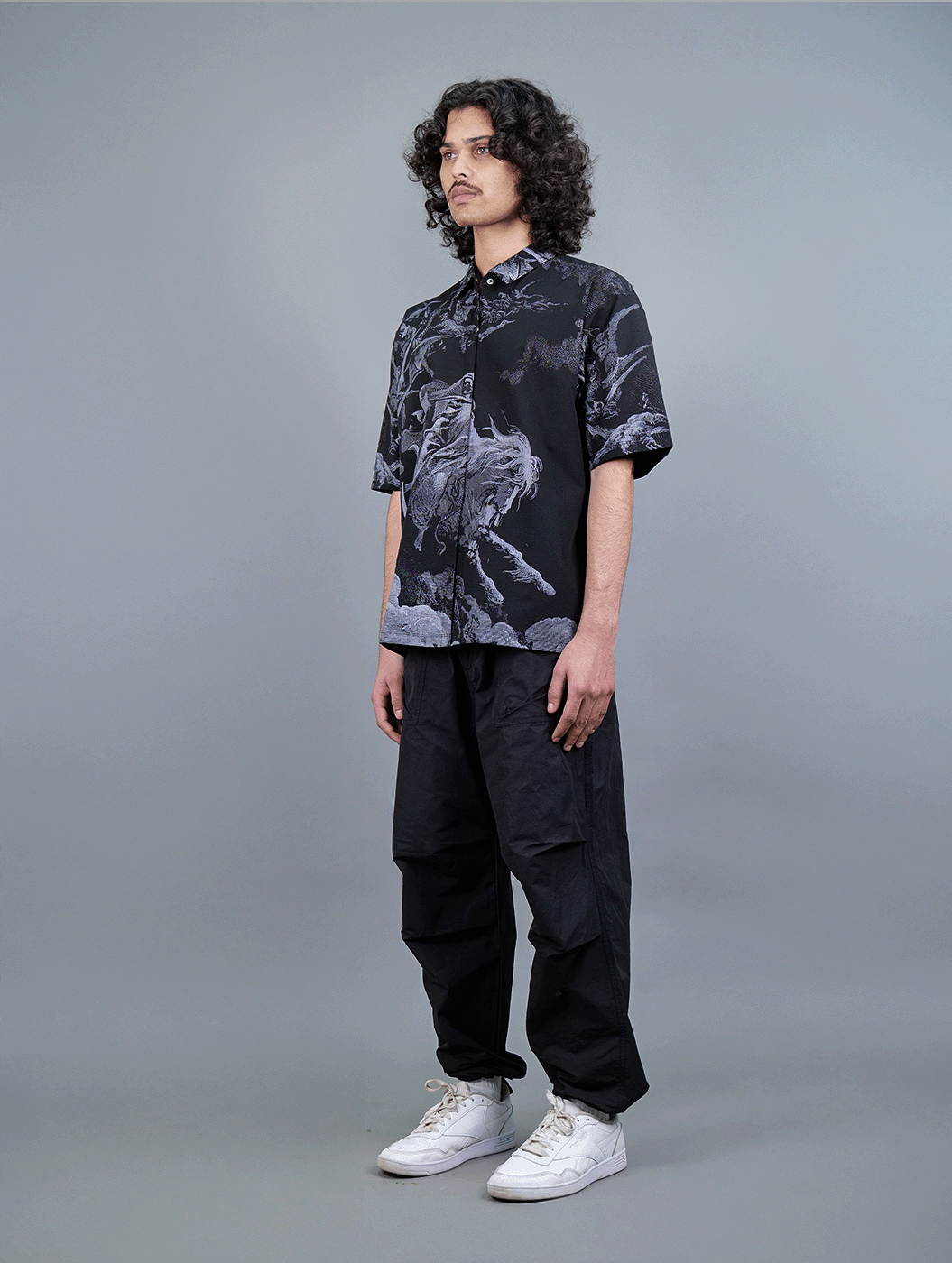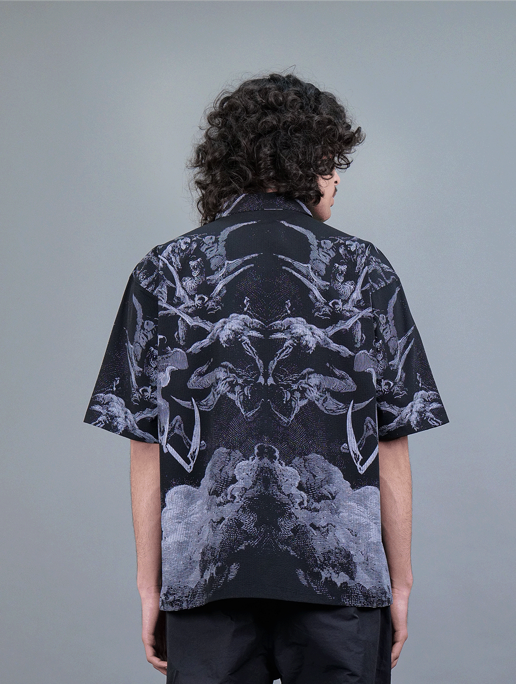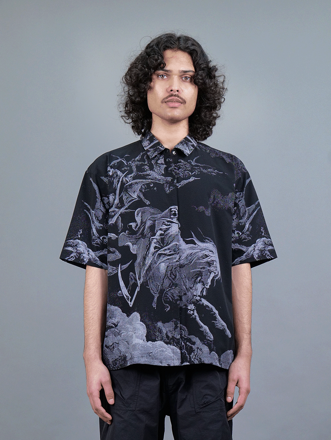 Featuring an oversized Black Shirt with all-over print of a knight resembling the Angel of Death, riding a majestic horse. Crafted from premium textured fabric, this statement piece merges luxury with comfort. The intricate artwork, rich in detail and depth, adds a striking, gothic edge to your wardrobe. Designed for all genders, its relaxed fit and breathable material ensure effortless style, whether worn casually or layered for a standout look.