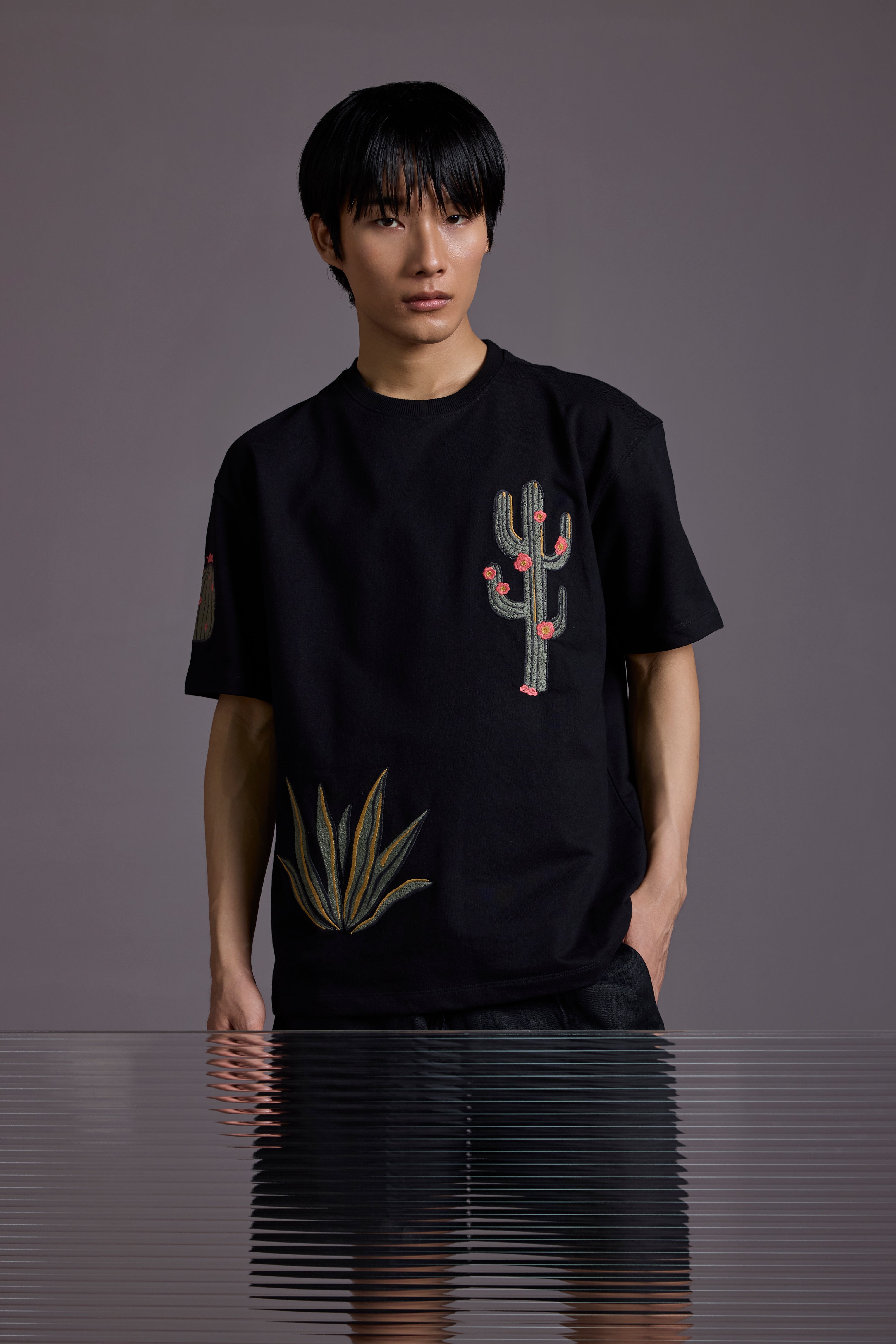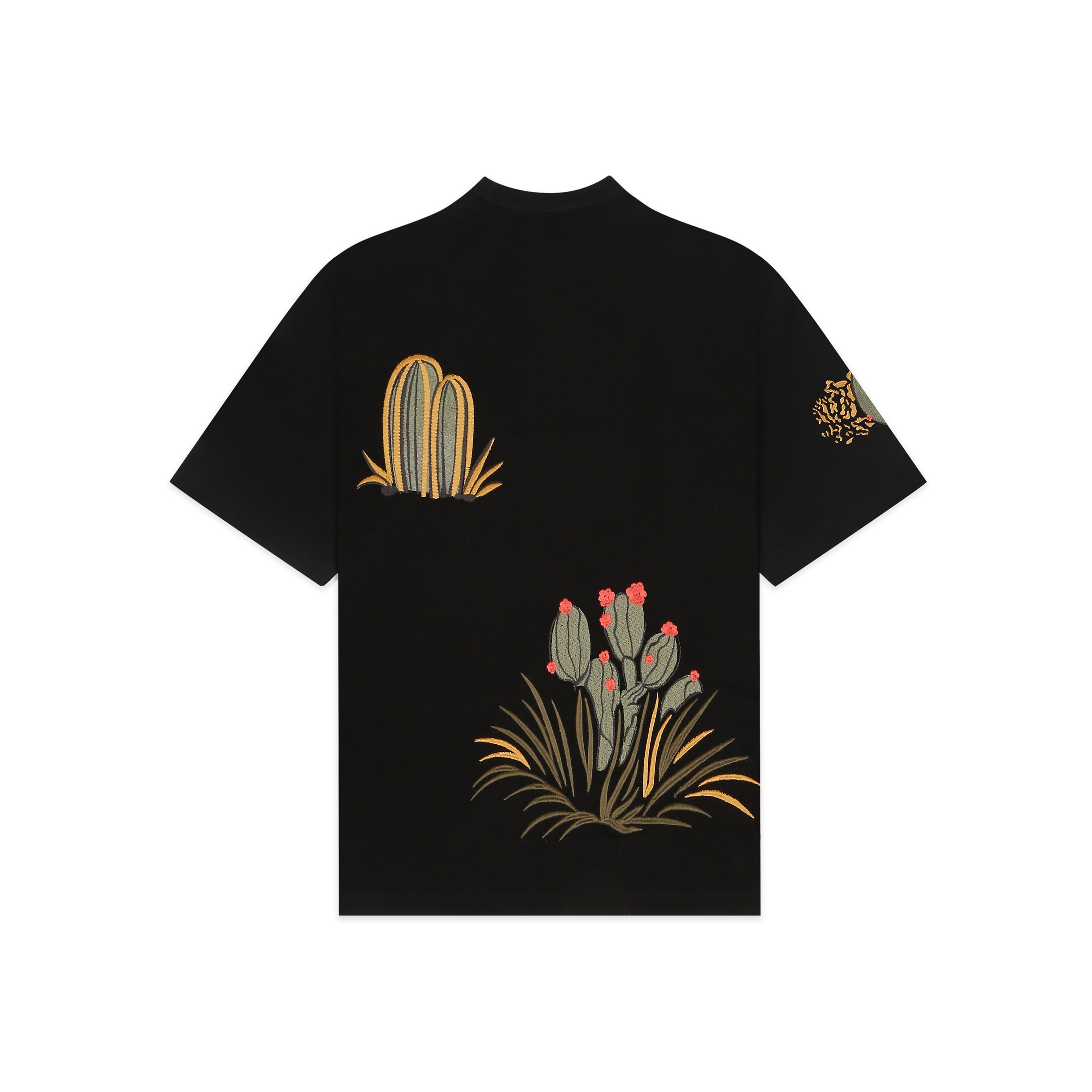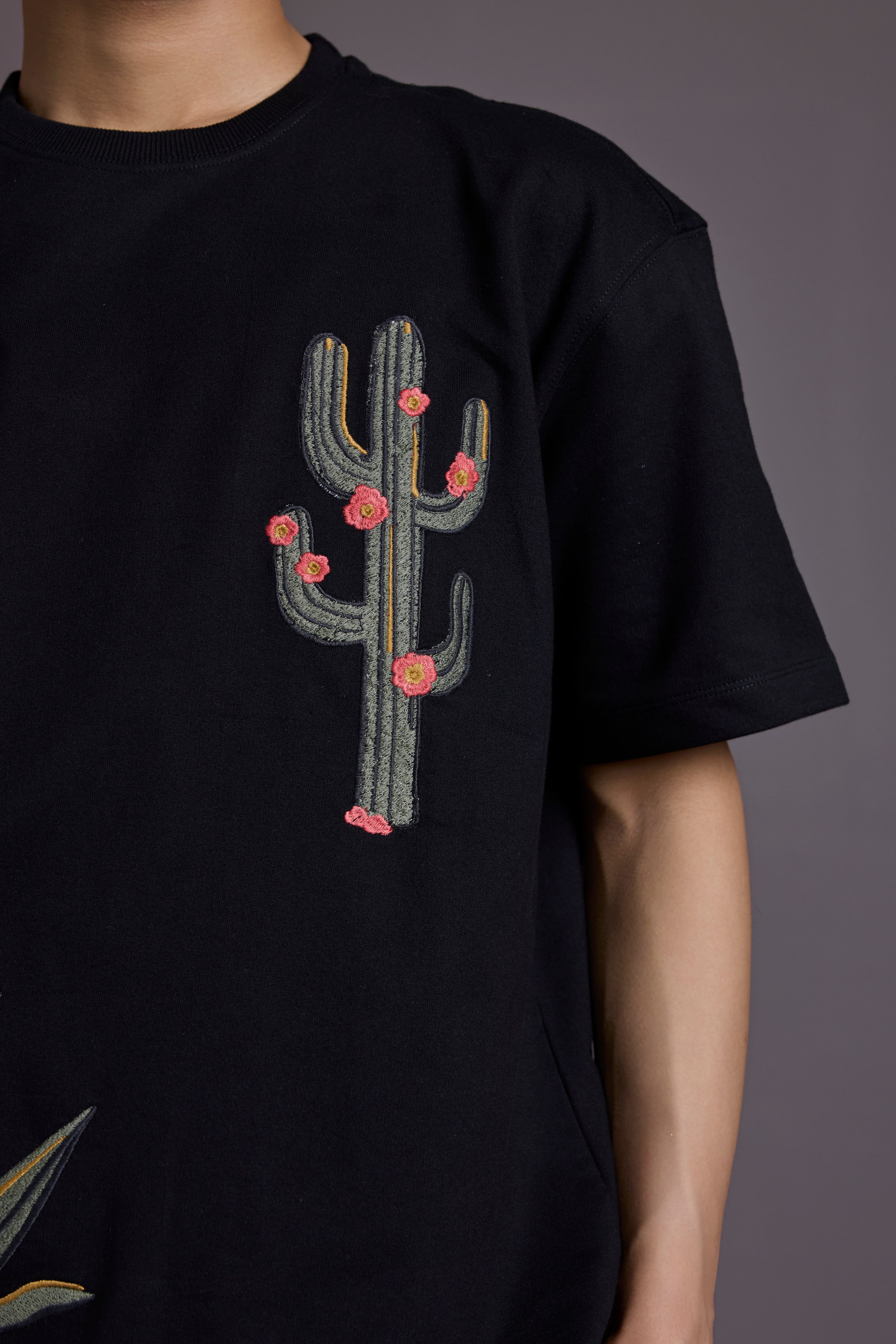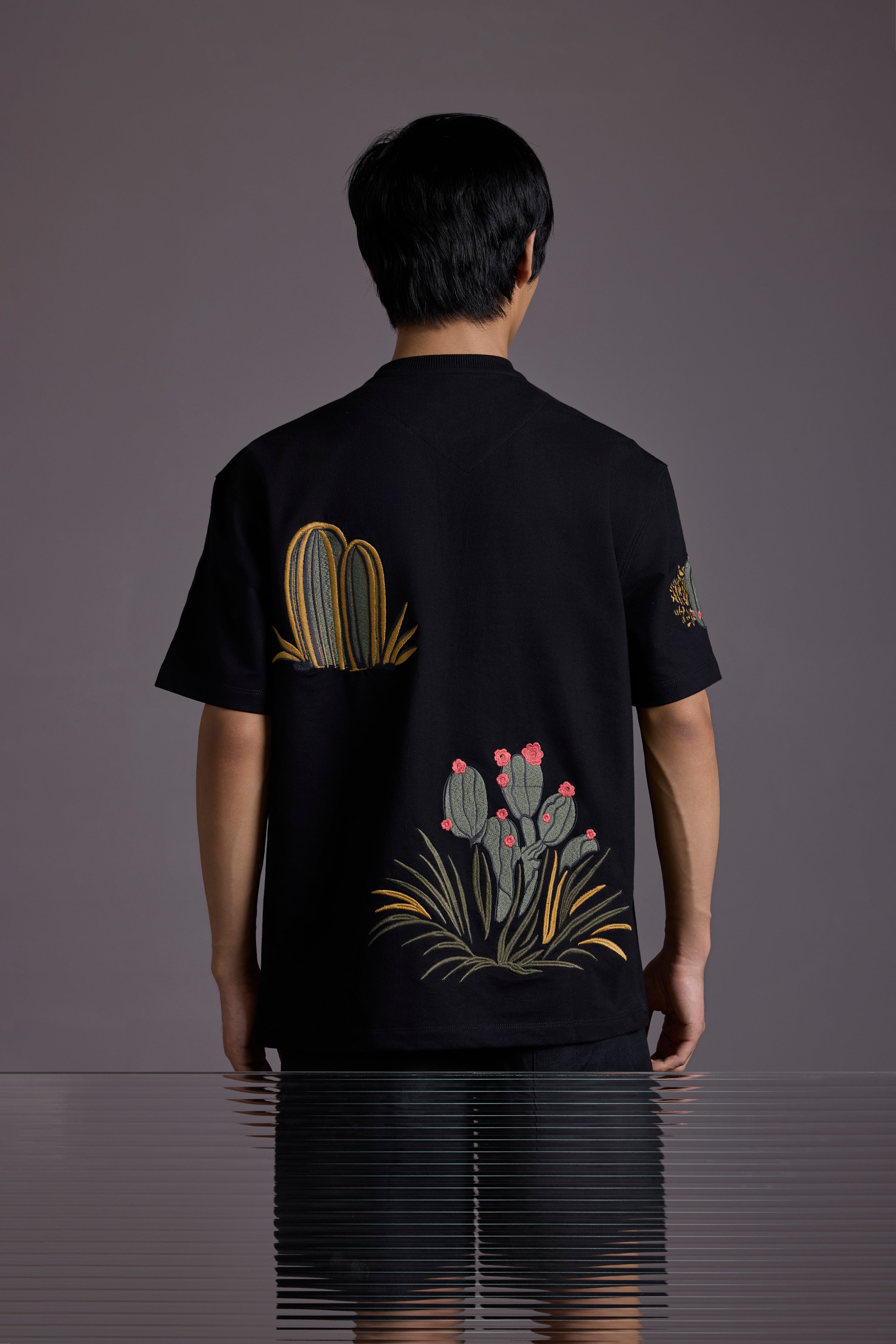 Crafted from 260 GSM French terry cotton, this heavyweight tee features intricate cactus-themed embroidery sprawled across the front, back, and sleeves.