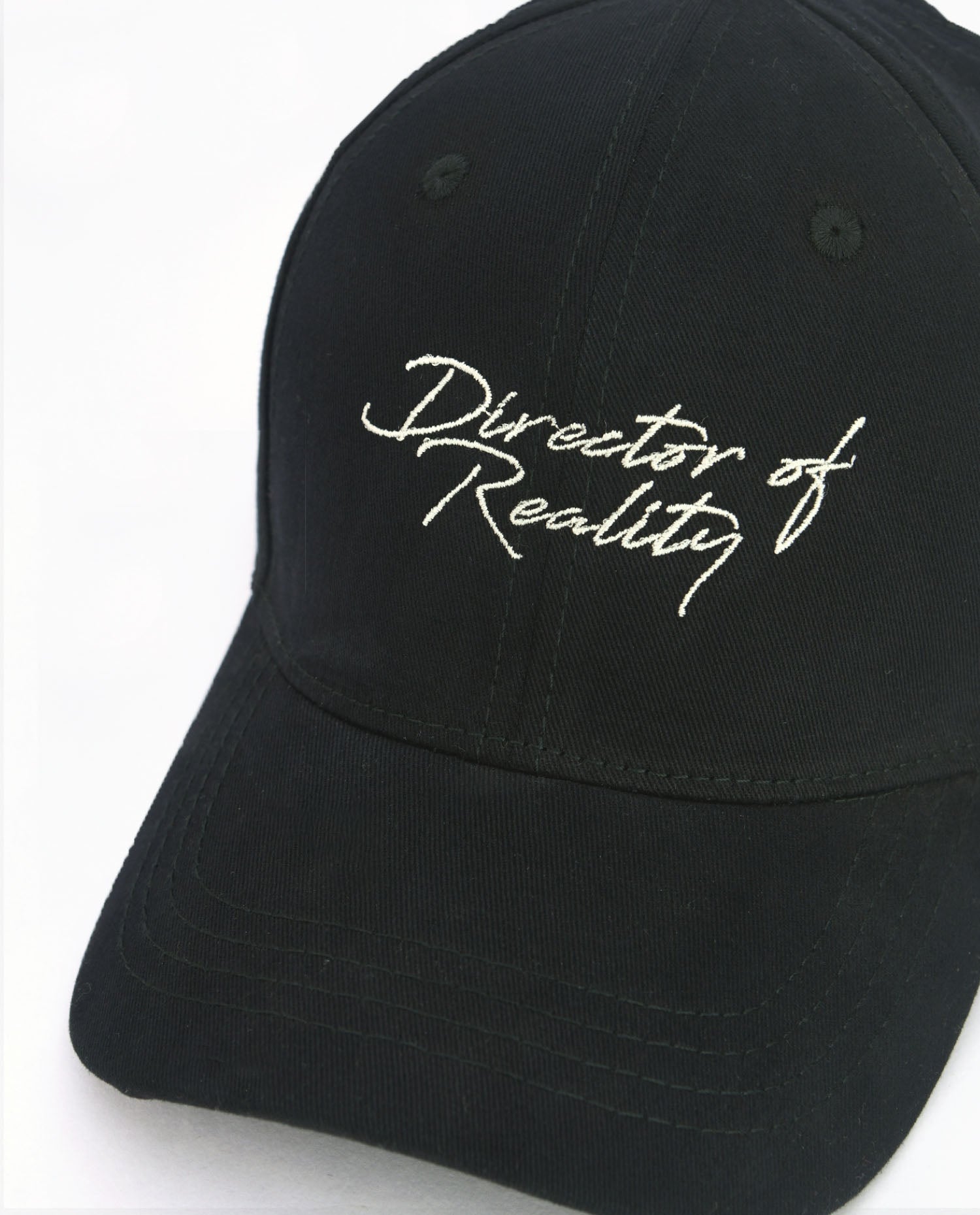 The classic Black Baseball Cap silhouette is elevated by the central embroidery: "Director of Reality." Stitched in a refined, continuous white script, this phrase serves as a minimalist yet profound mantra, a reminder that consciousness and intentionality are the ultimate forms of craftsmanship.