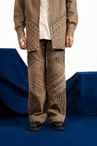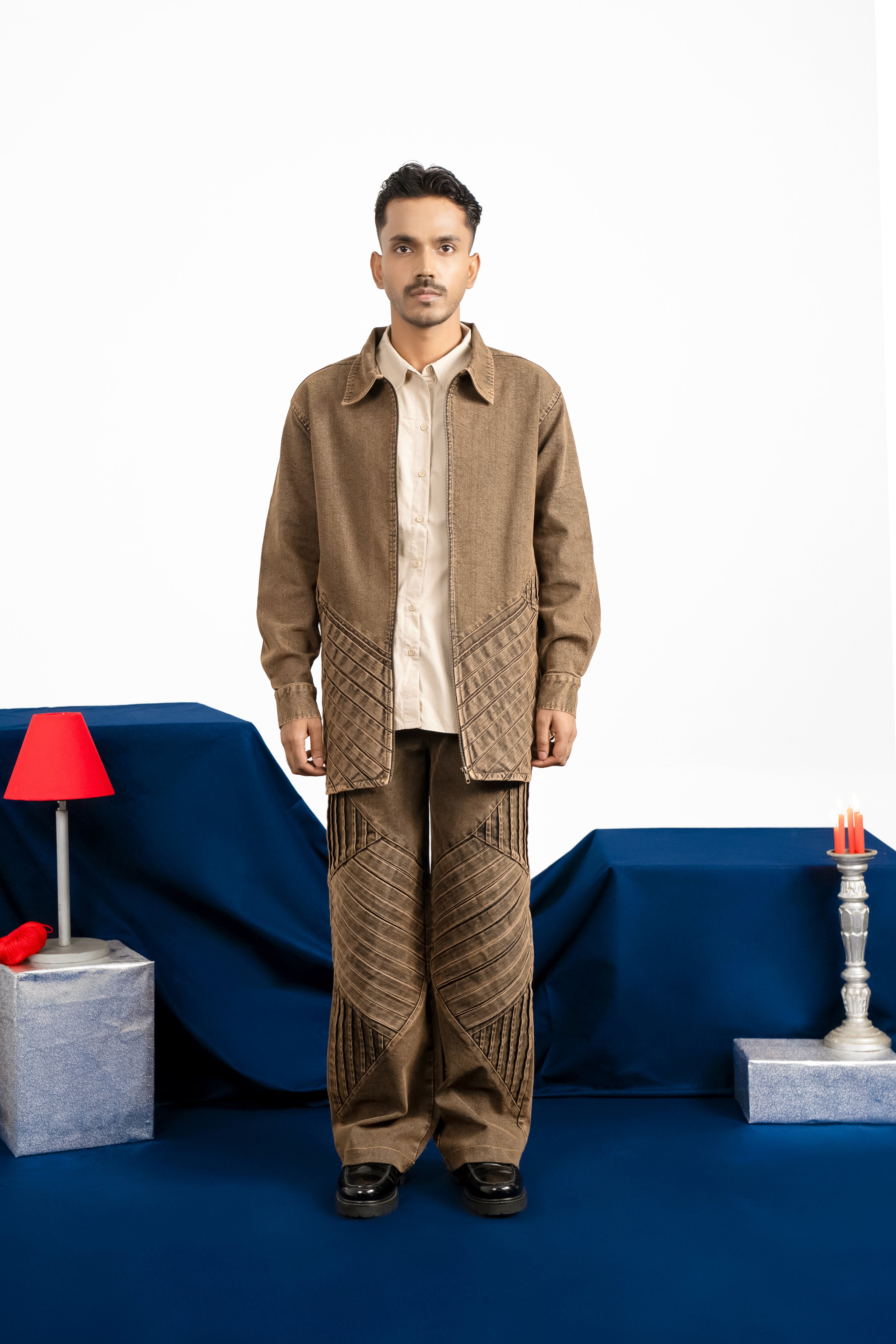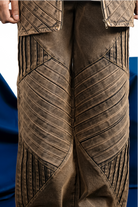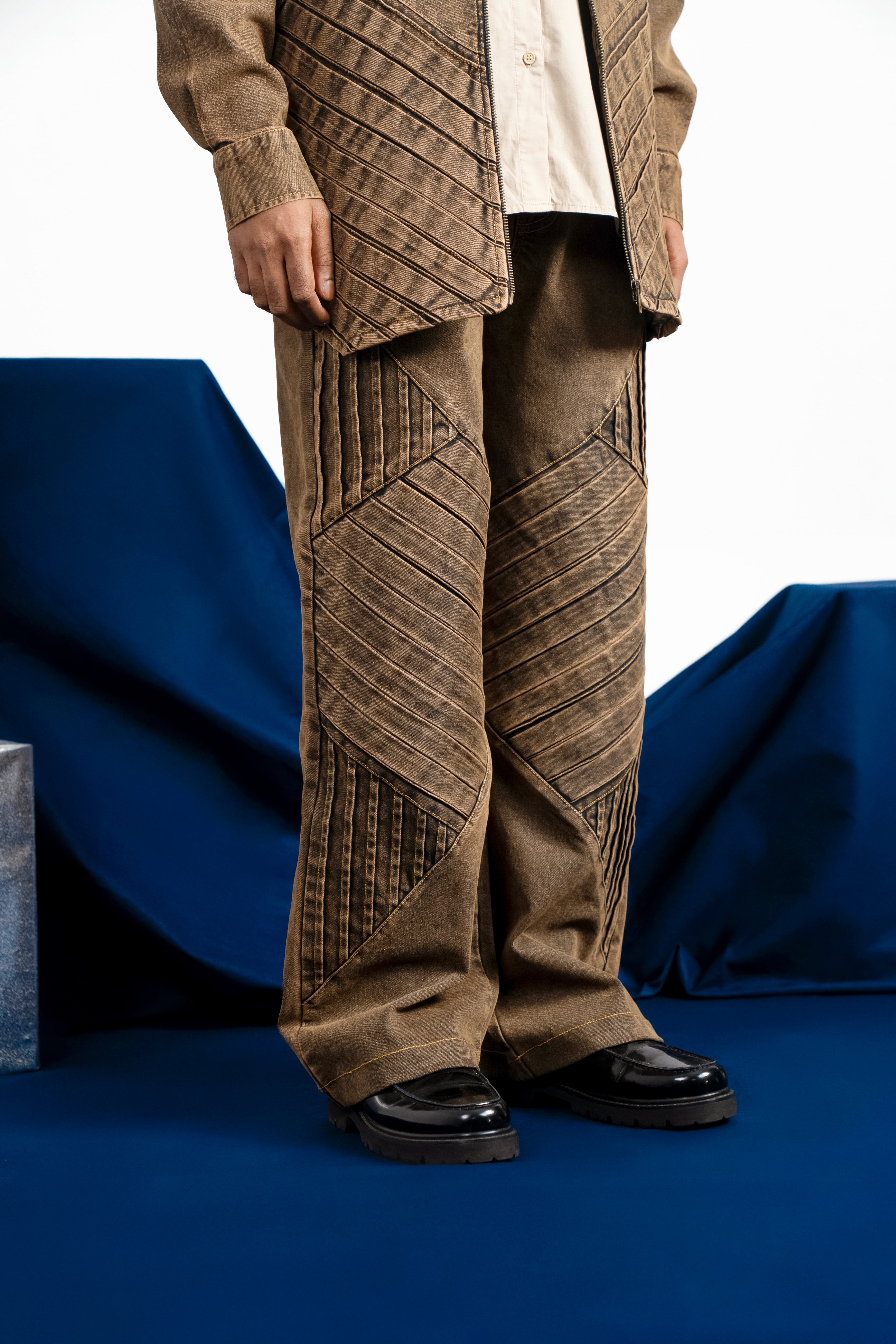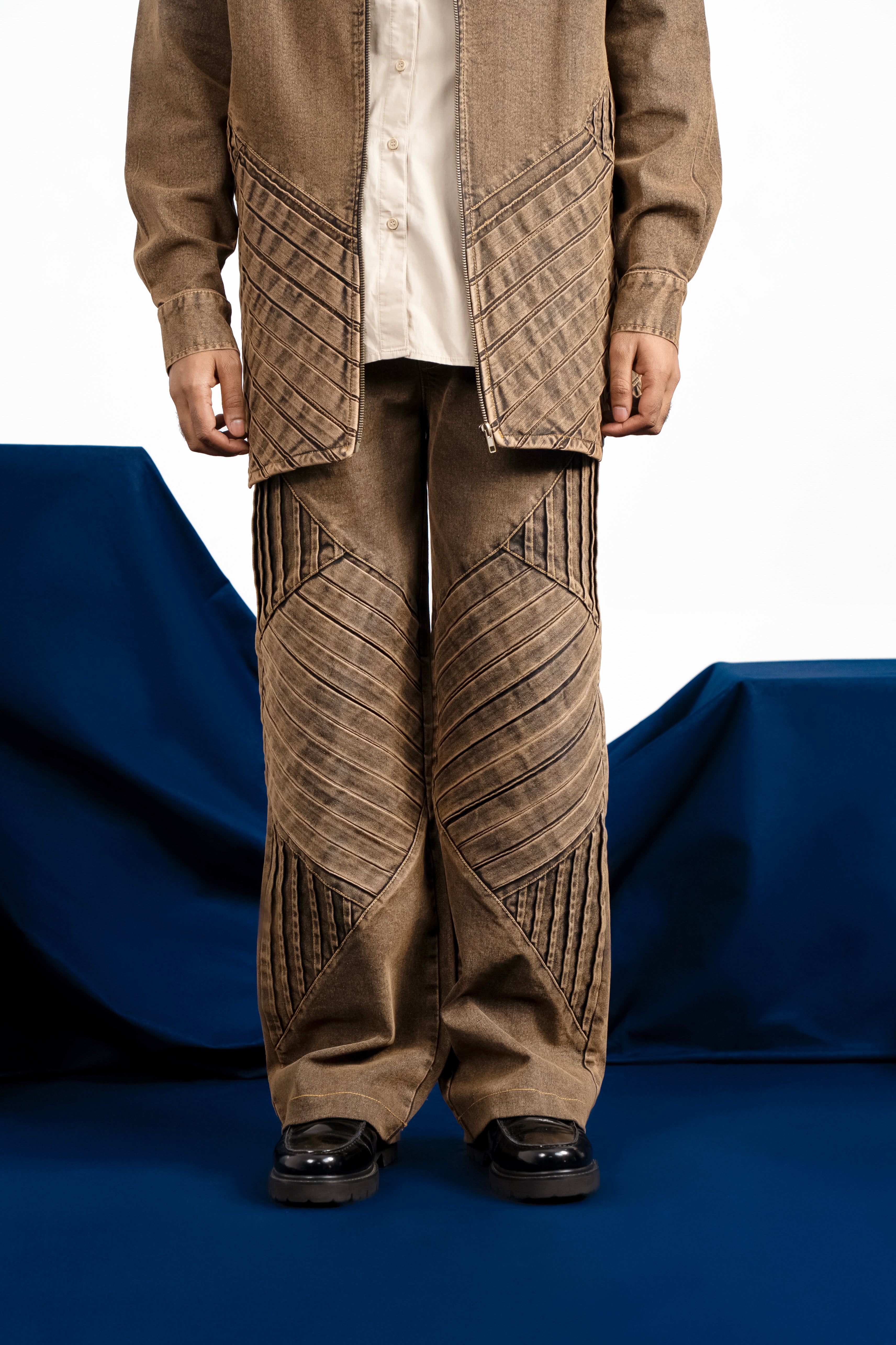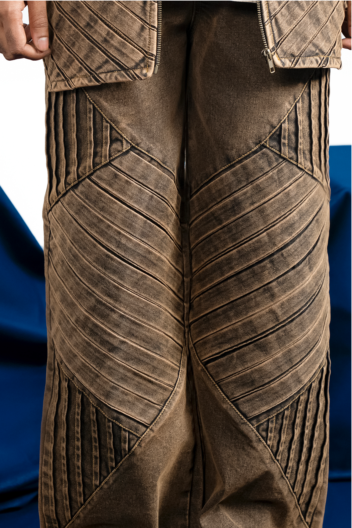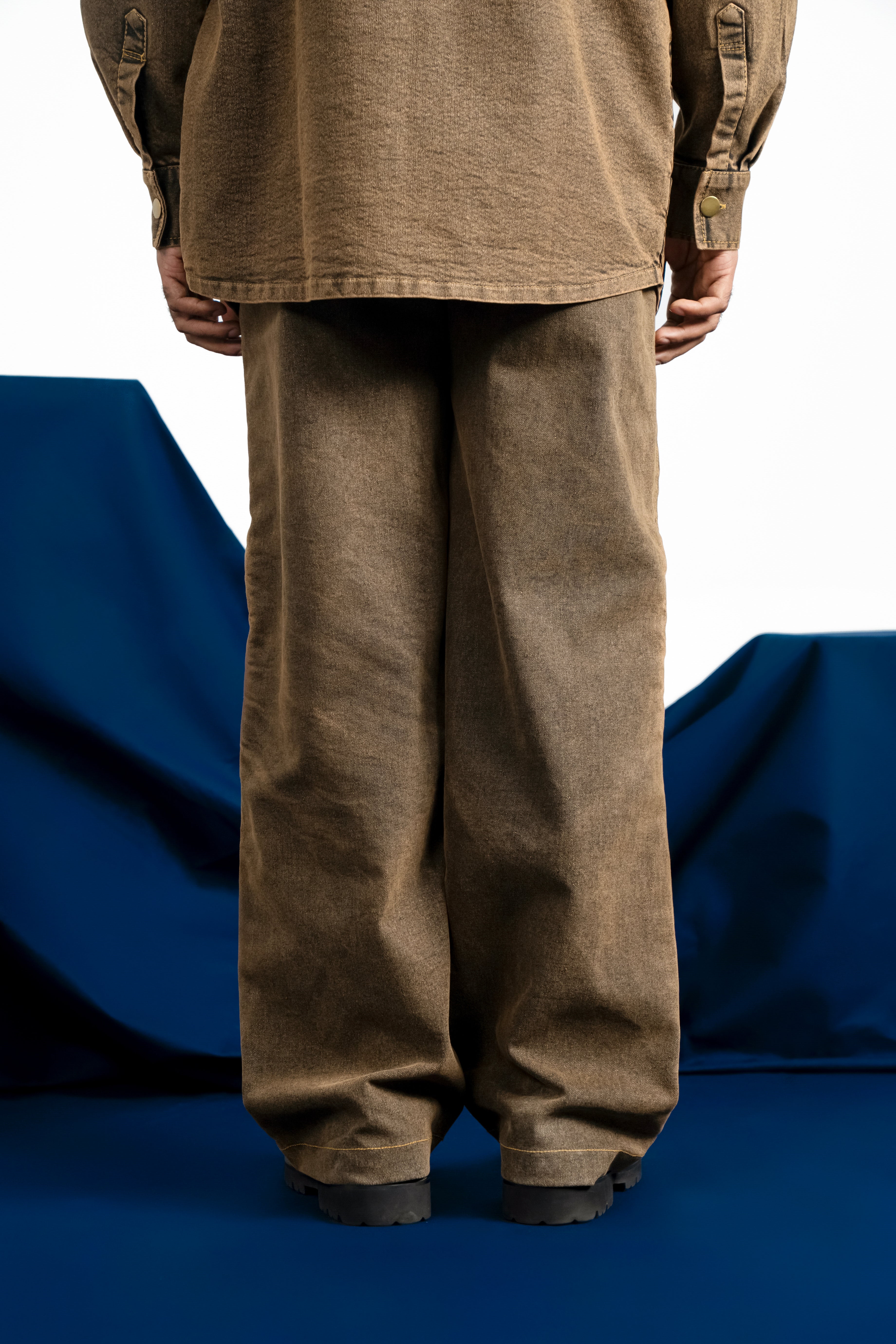 Symbolising a post-apocalyptic world, with panelling inspired from strength of an armour and our signature pleats and pintucks detail within, this style is made to bring out the power from within you. This wide leg pant is made in black denim fabric, washed and over-dyed in an orange-brown shade. The complimentary gold thread to elevate the minute details. It has two front and two back pockets for basic utility and is finished with a metallic button and zip on the front.