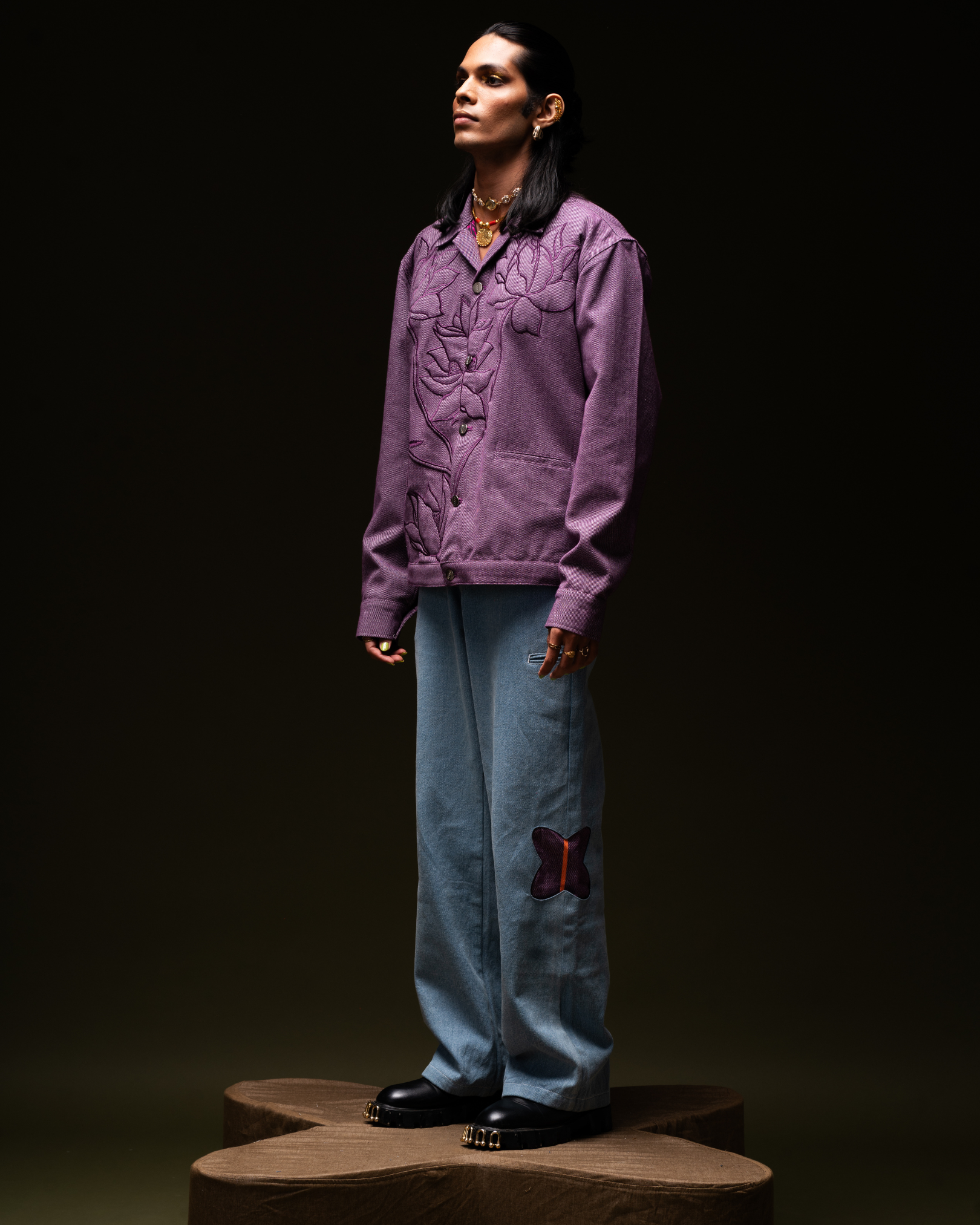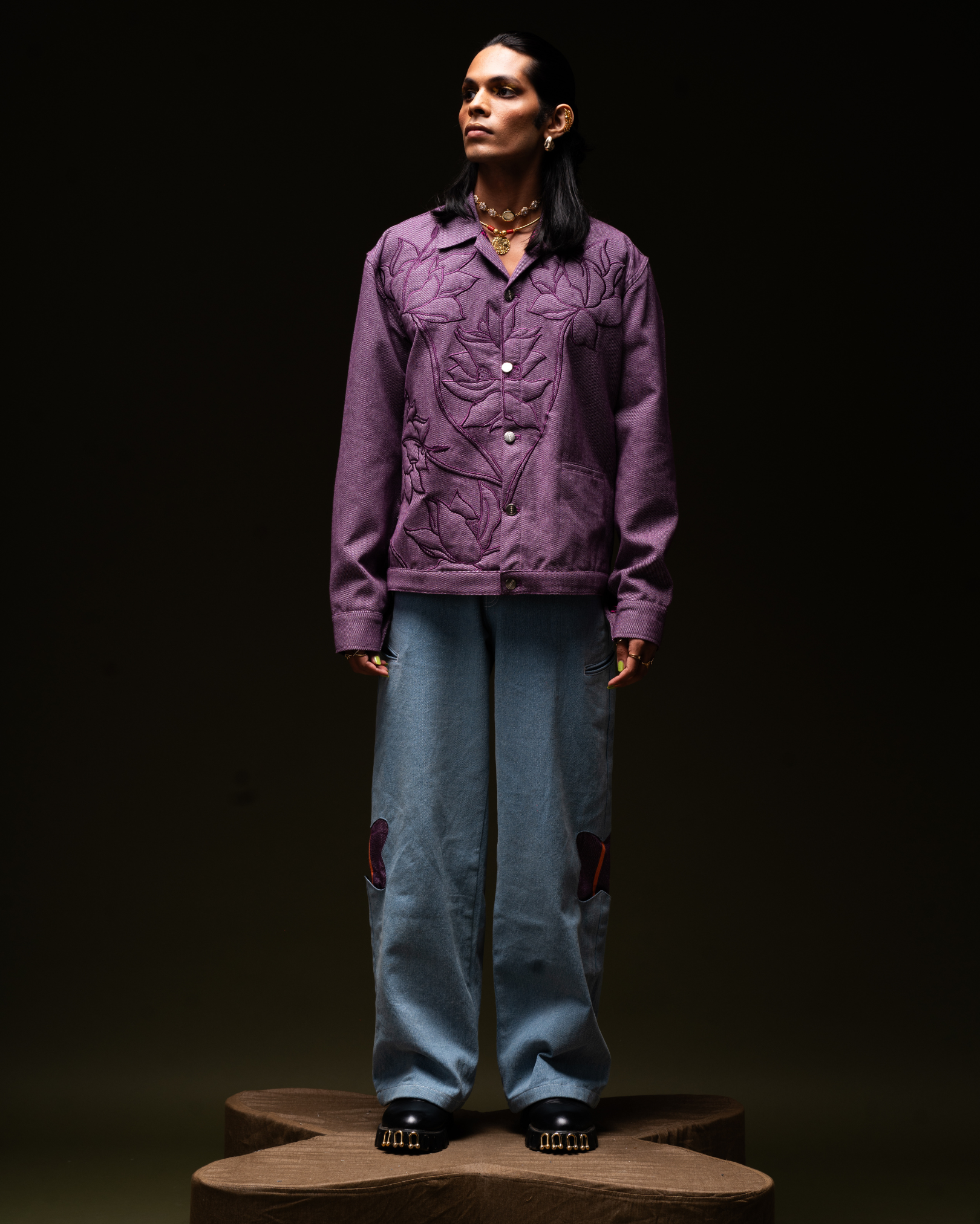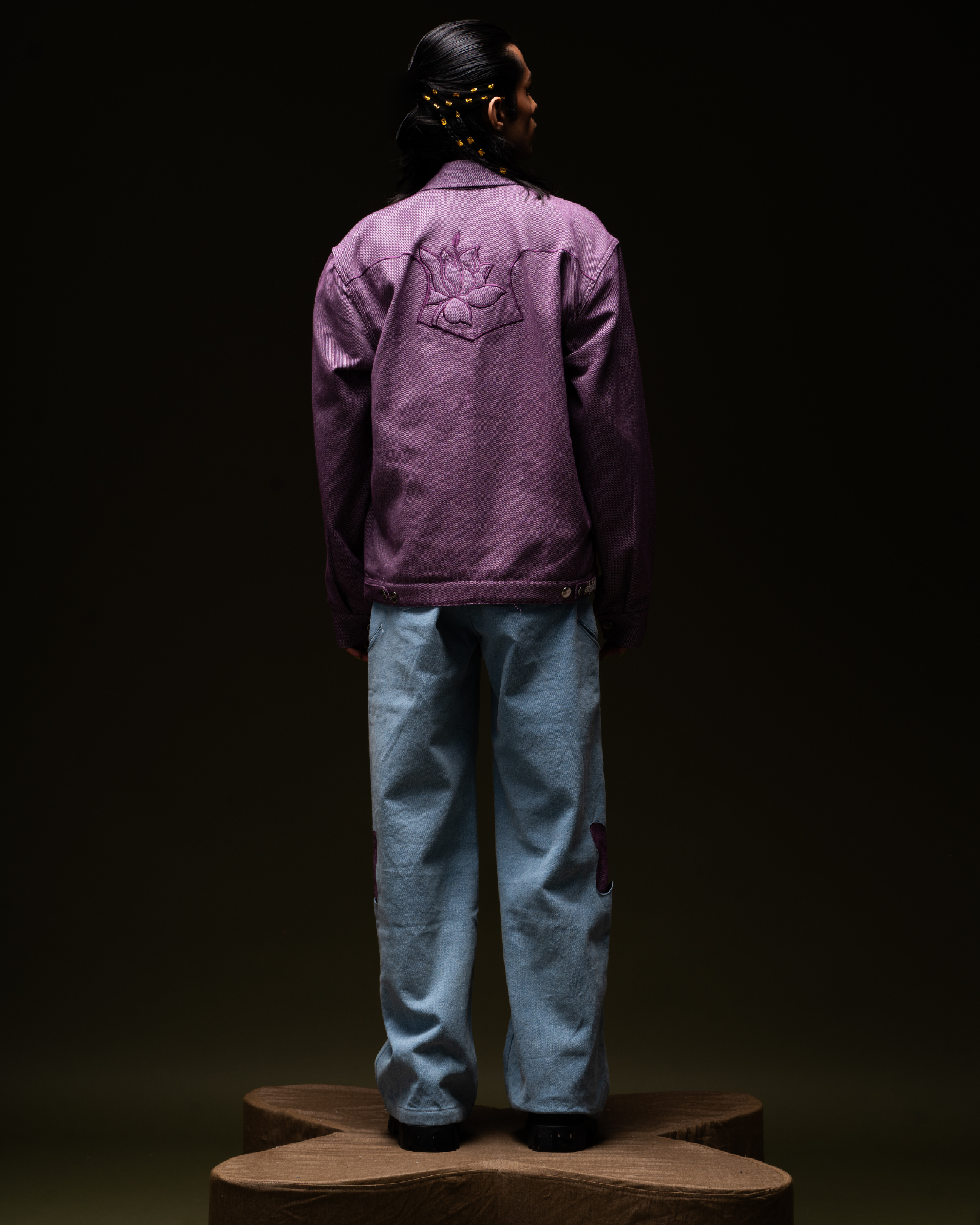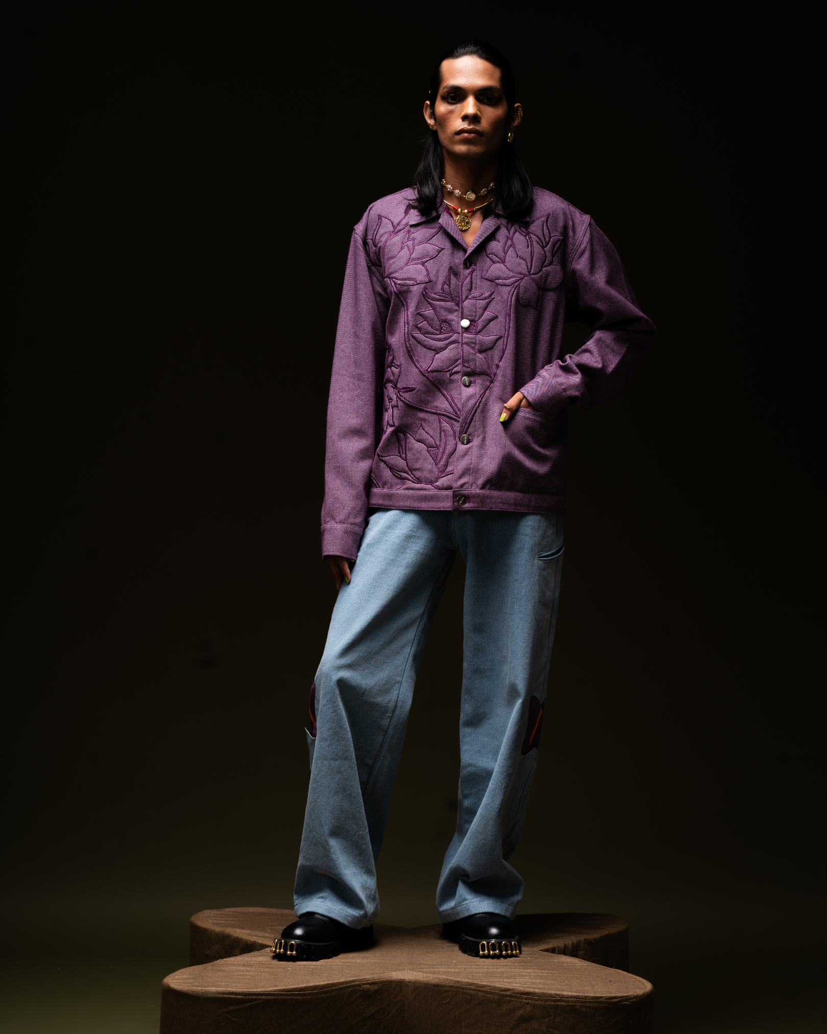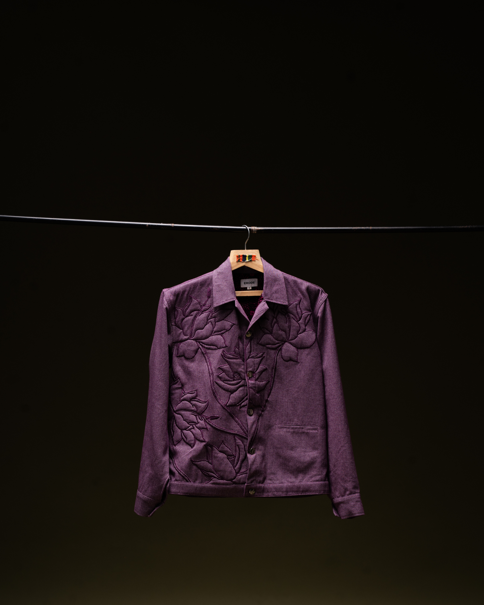 "DON'T GO AWAY" is our Purple Jamakaalam jacket. This version adds flower embroidery for a playful mood on a classic. Finished with authentic details like front welt pockets, and metal buttons throughout. Sure to be a favorite throughout the season, and in seasons to come. This jacket with pockets and a distinctive floral embroidery is a sassy way to get with the times. With full button placket, Patch Back Yoke, Drop Shoulders & button fastening.