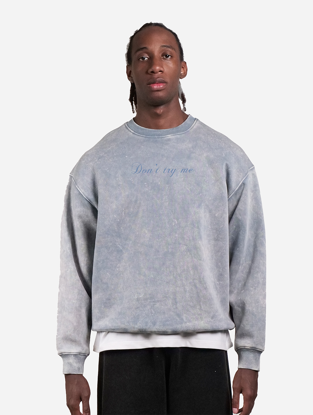 Don't Try Me! Blue Washed Printed Drop Shoulder Unisex Oversized Sweatshirt
