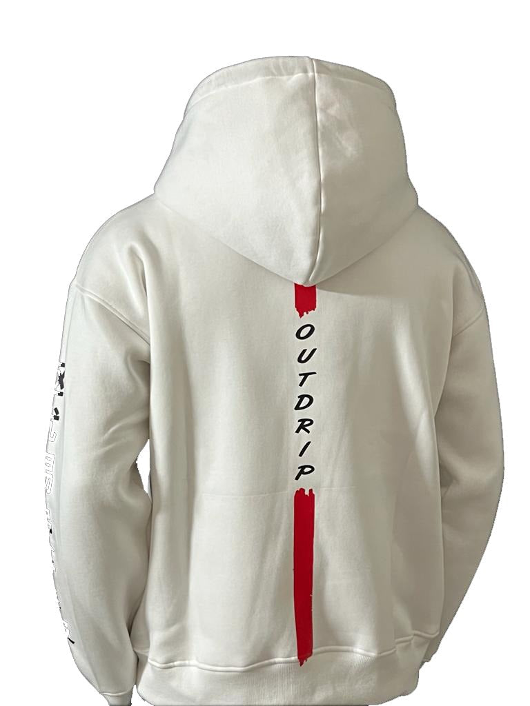 Ignite your style with the mythical energy of the Dragon Hoodie. Crafted in off-white, this hoodie features a fierce dragon graphic and "OUTDRIP" printed in Chinese characters on the sleeves—perfect for those who combine street style with legendary power.