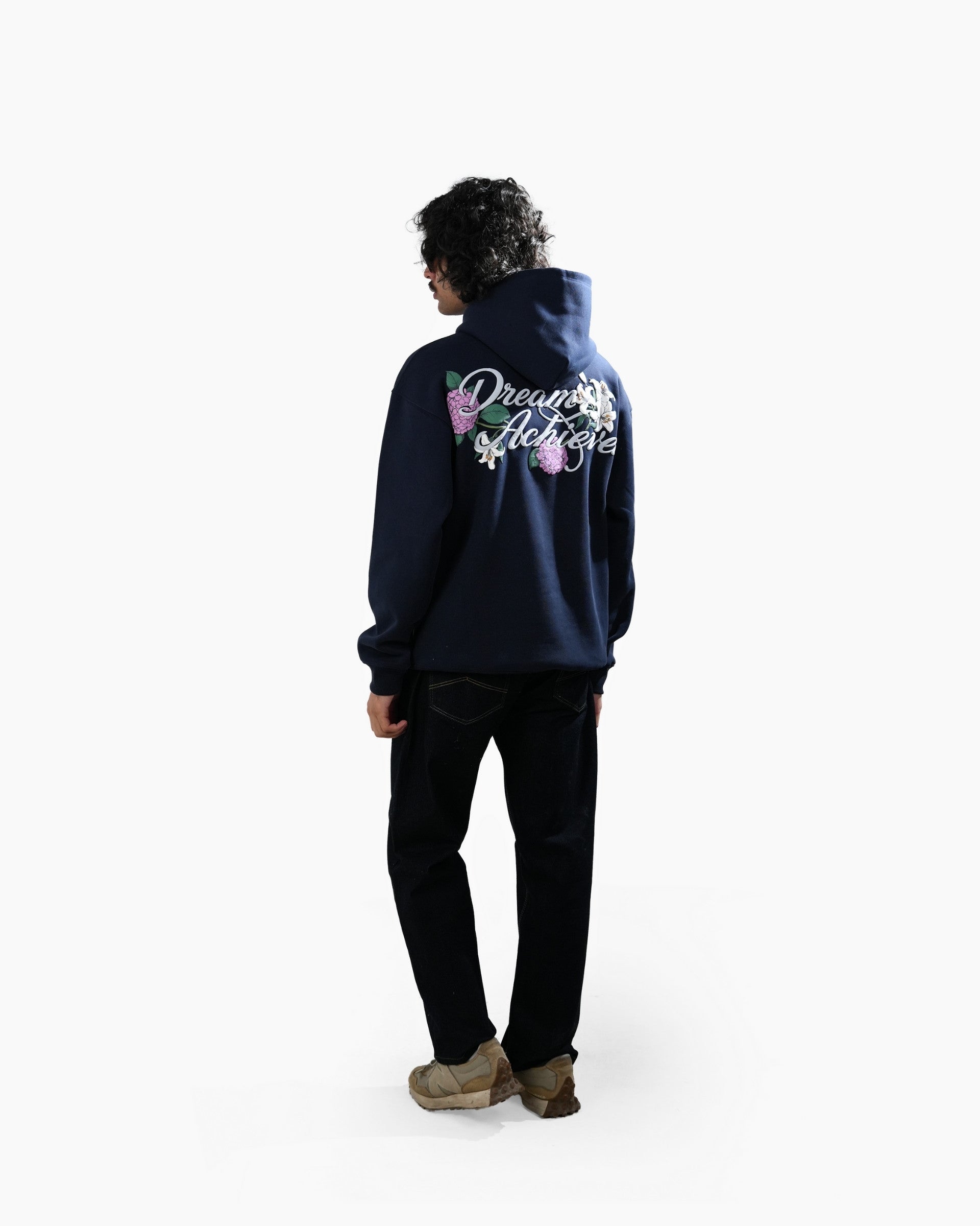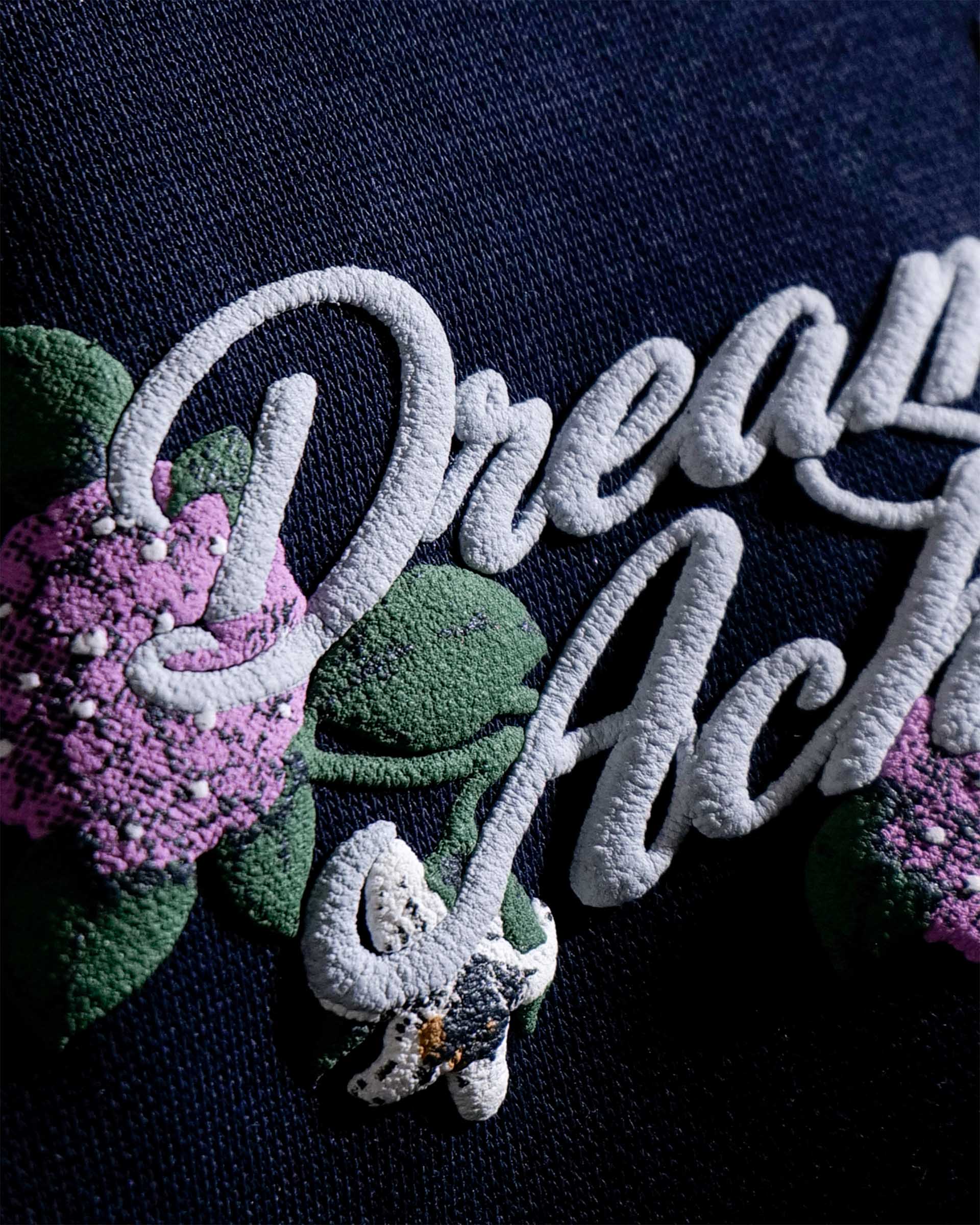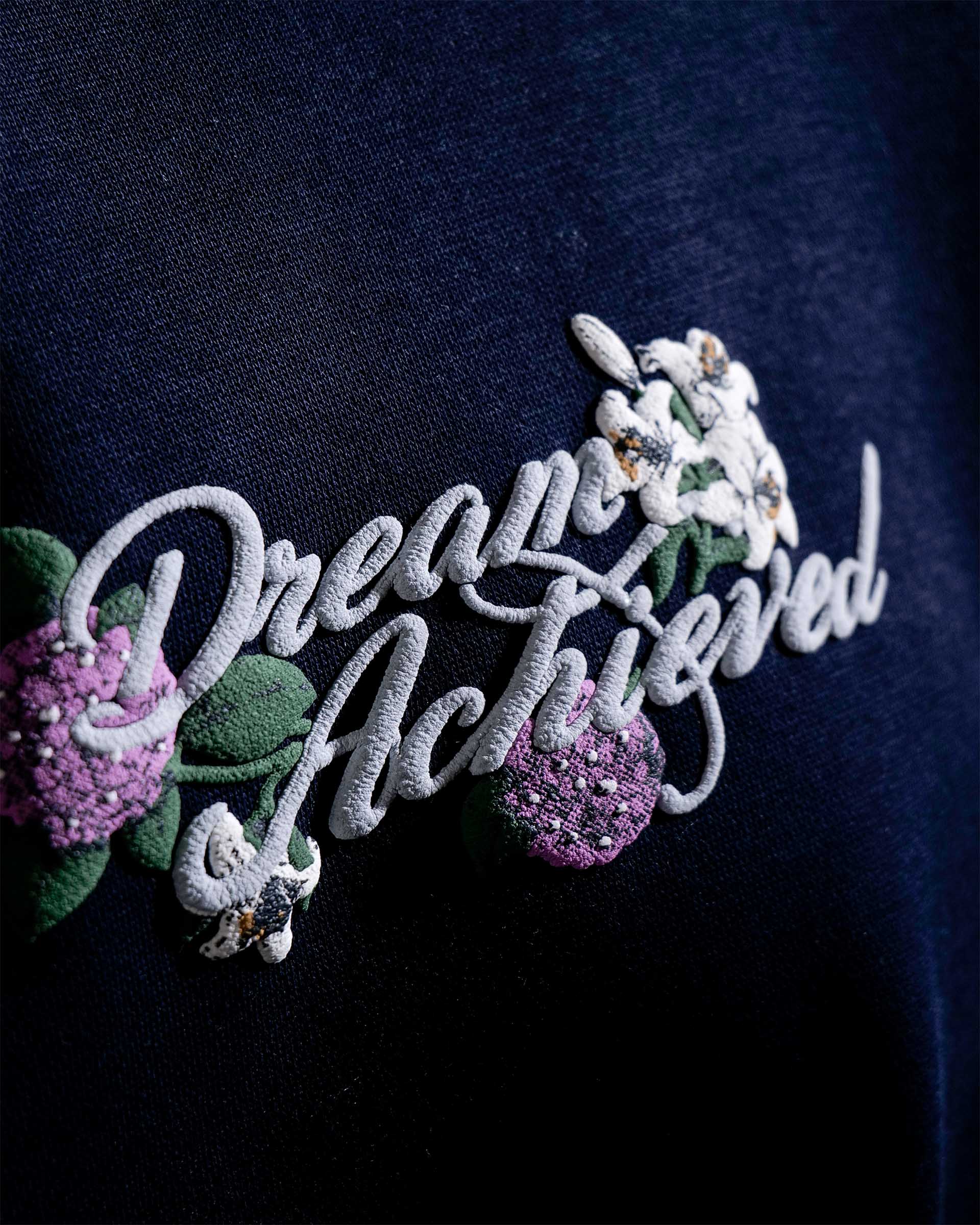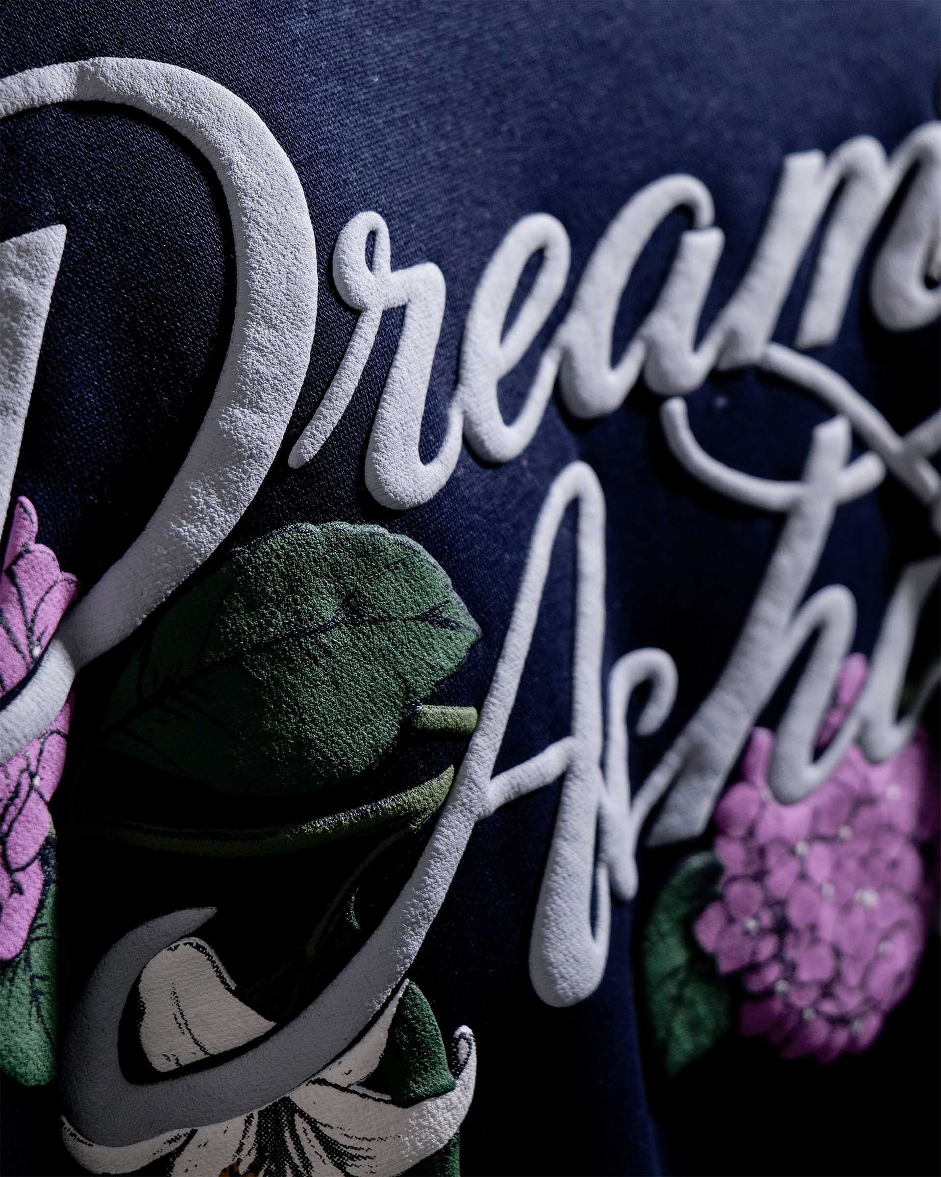 The Dream Achieved hoodie in navy is constructed from heavyweight 400 GSM three-thread cotton fleece, offering a structured yet comfortable feel. Designed with an oversized fit, it features detailed puff print artwork on both the front and back. A specialised screen-printing technique is used to achieve enhanced puff and depth, making the artwork stand out against the deep navy base. Finished with 2x2 ribbed hems on the sleeves and bottom for added durability and shape retention.