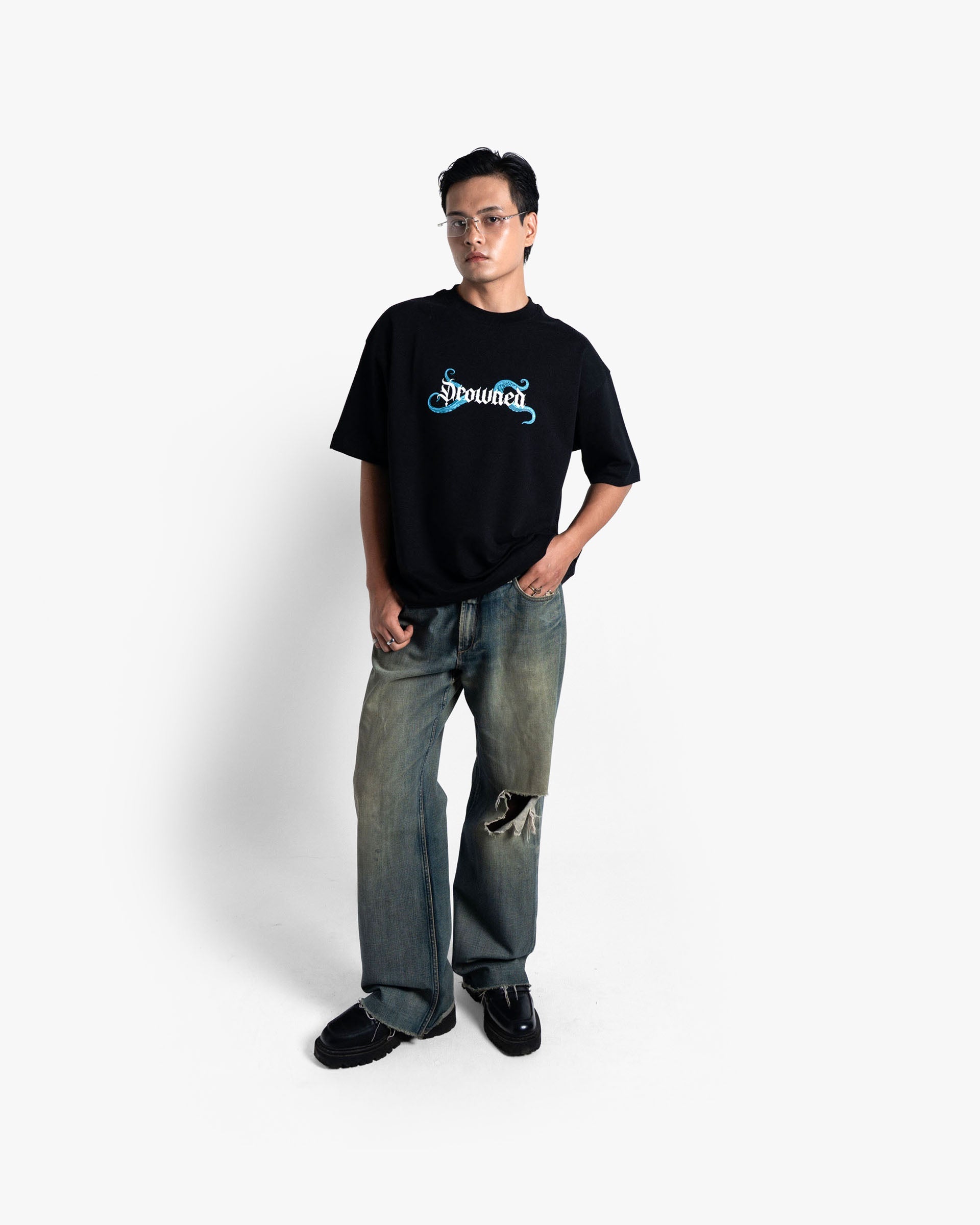 Drowned in Darkness t-shirt—a premium oversized unisex graphic tee made from 250 GSM Cotton Spandex Terry Looper, treated with a double-silicone wash for an ultra-smooth, luxury feel. The jet-black canvas is brought to life by a striking oceanic octopus design, rendered in electric blue, with the bold phrasing “Drowned in the Darkness” woven into the artwork for an edgy, modern touch.