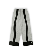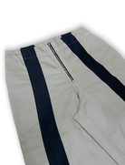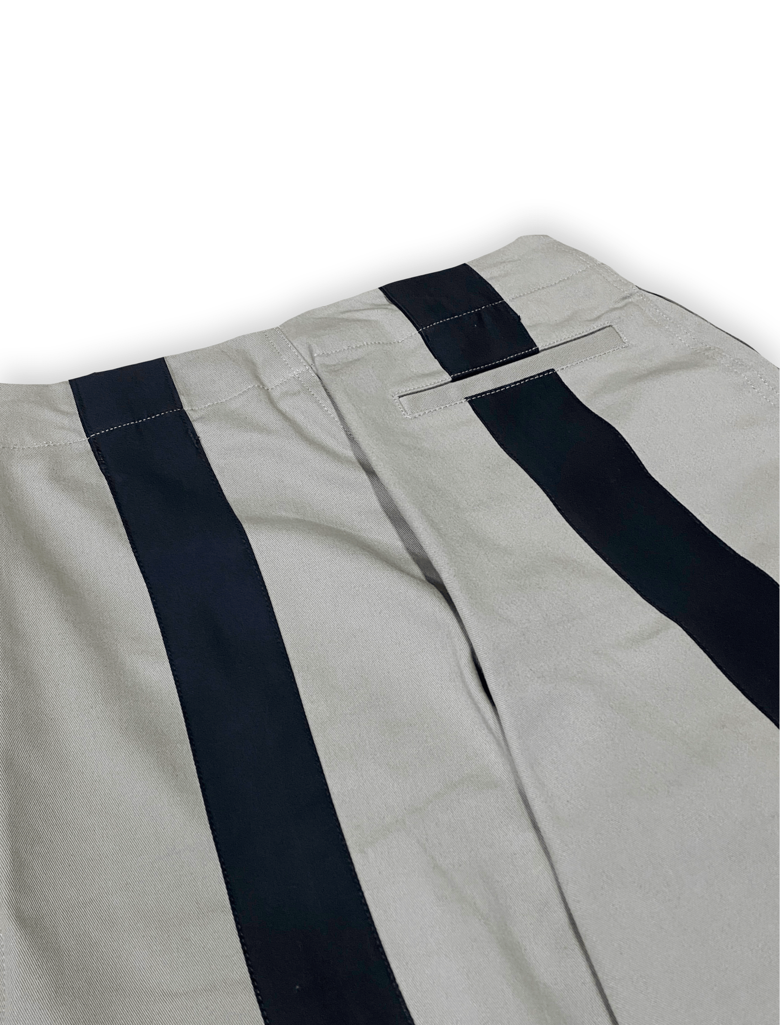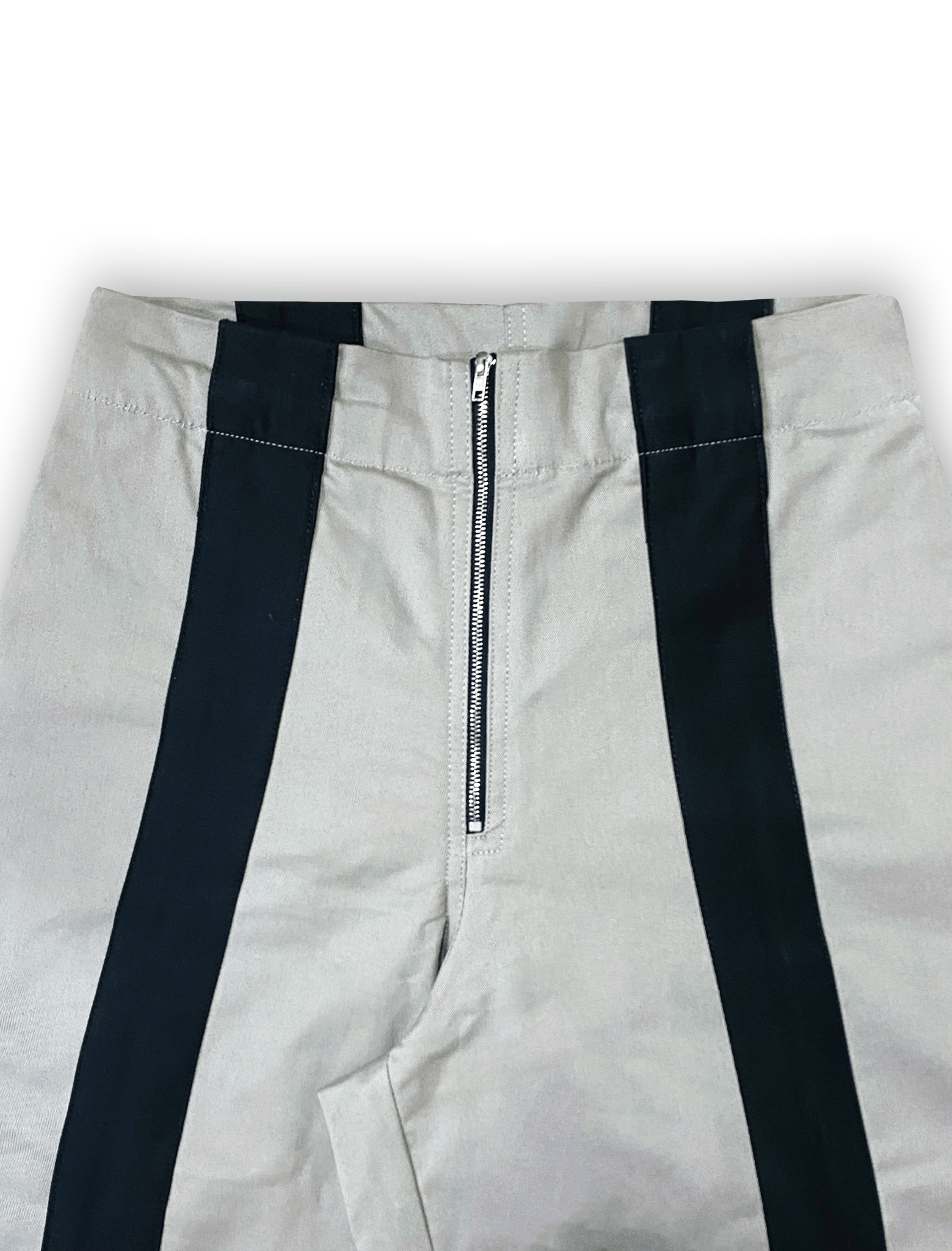 Dune Stripe Pants, crafted for a bold yet minimal look with black stripe patches adding a sharp contrast. The 4-inch fold at the bottom and visible zip waistband bring a rebellious twist to a clean silhouette. Designed for those who own their style with quiet confidence.