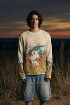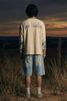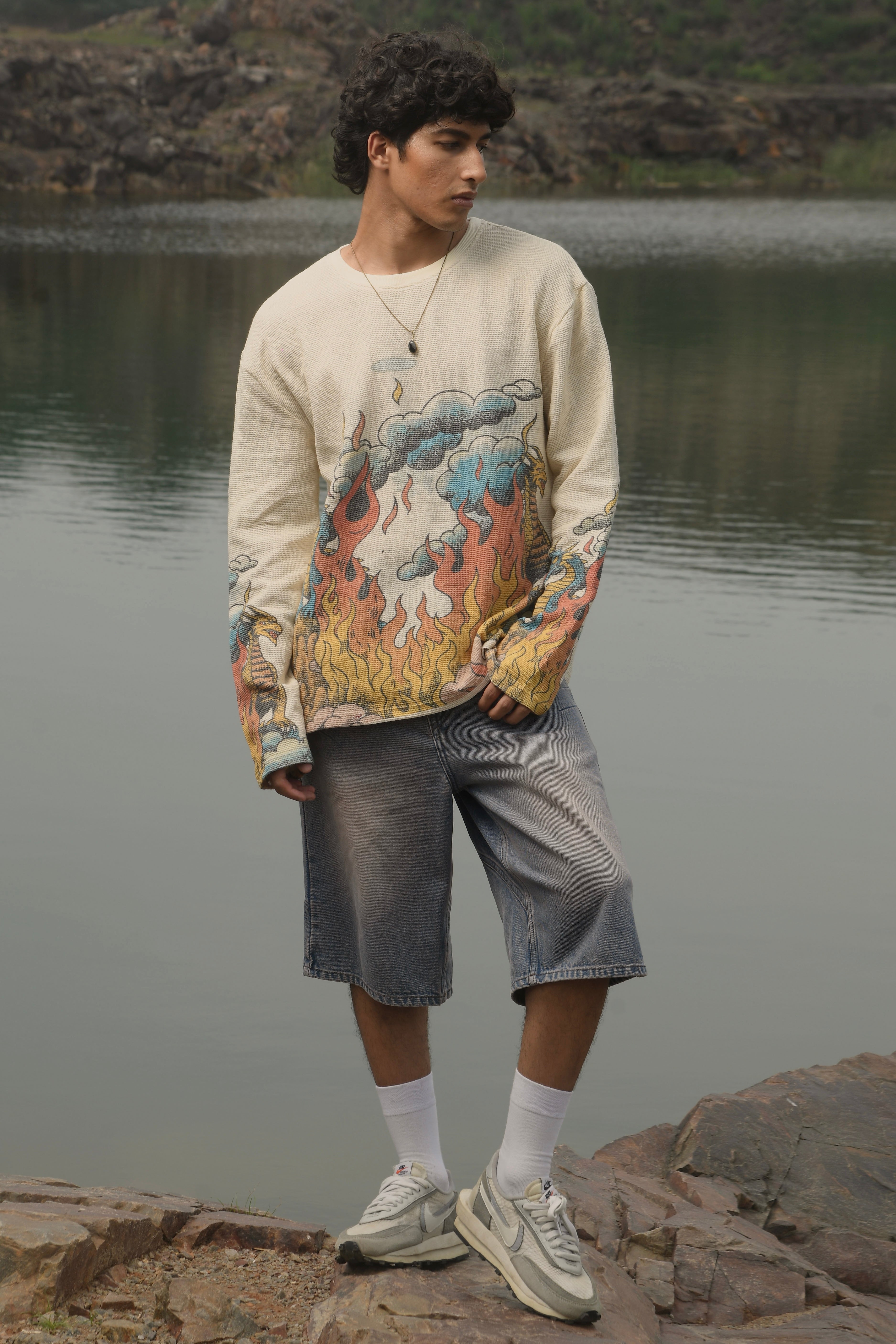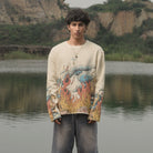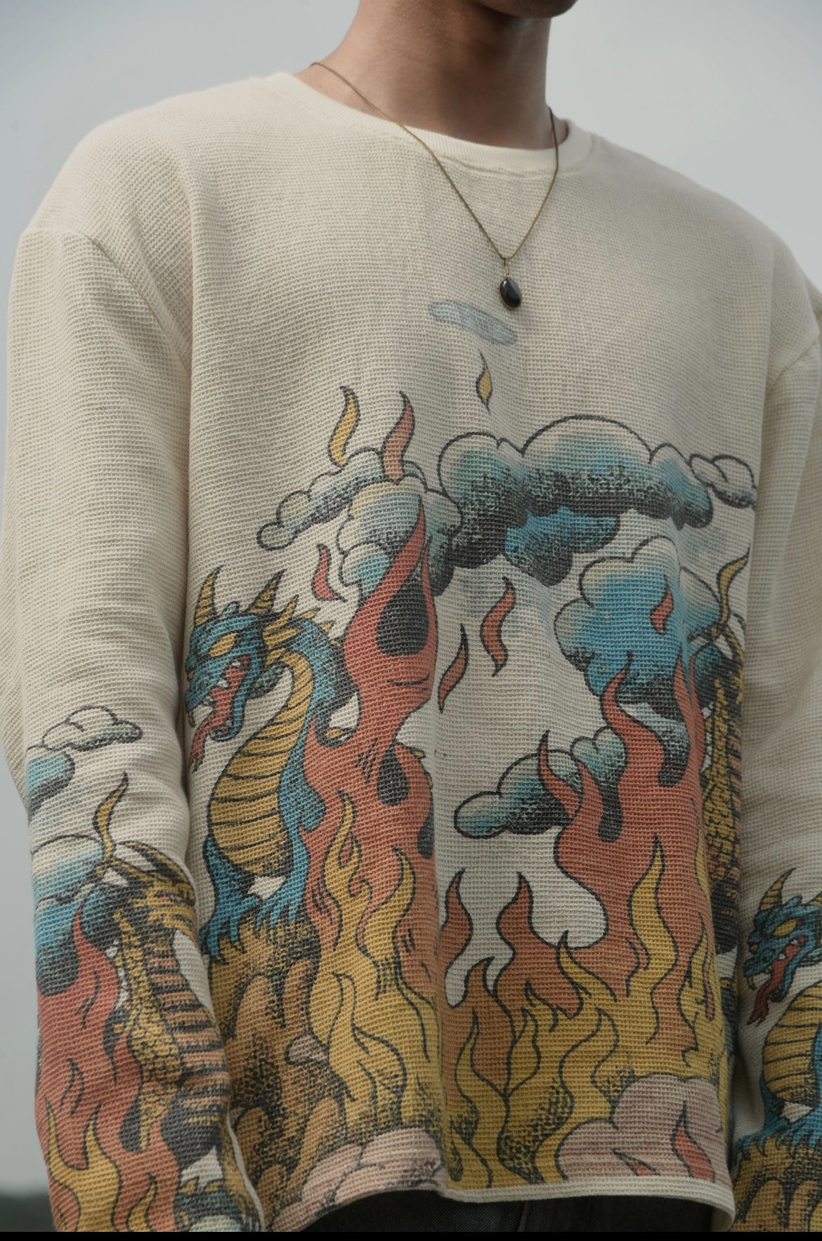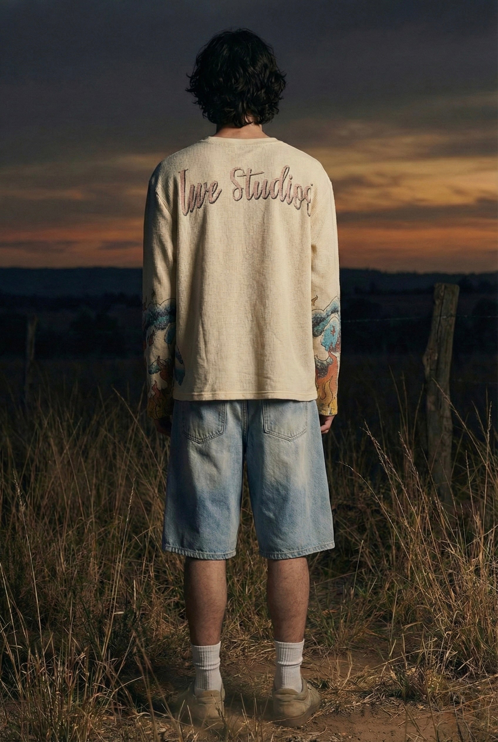 Vintage artwork waffle tee Crafted from soft, breathable waffle-textured fabric, this oversized unisex tee is designed for both comfort and impact.With its relaxed fit and luxurious texture, this t-shirt offers effortless style and versatility. The detailed artwork and embroidery on the sleeves create a unique vibe, making this shirt a must-have for anyone looking to make a statement. Perfect for layering or wearing solo, Whether you're lounging or stepping out, this shirt brings bold energy and unique flair to your wardrobe.