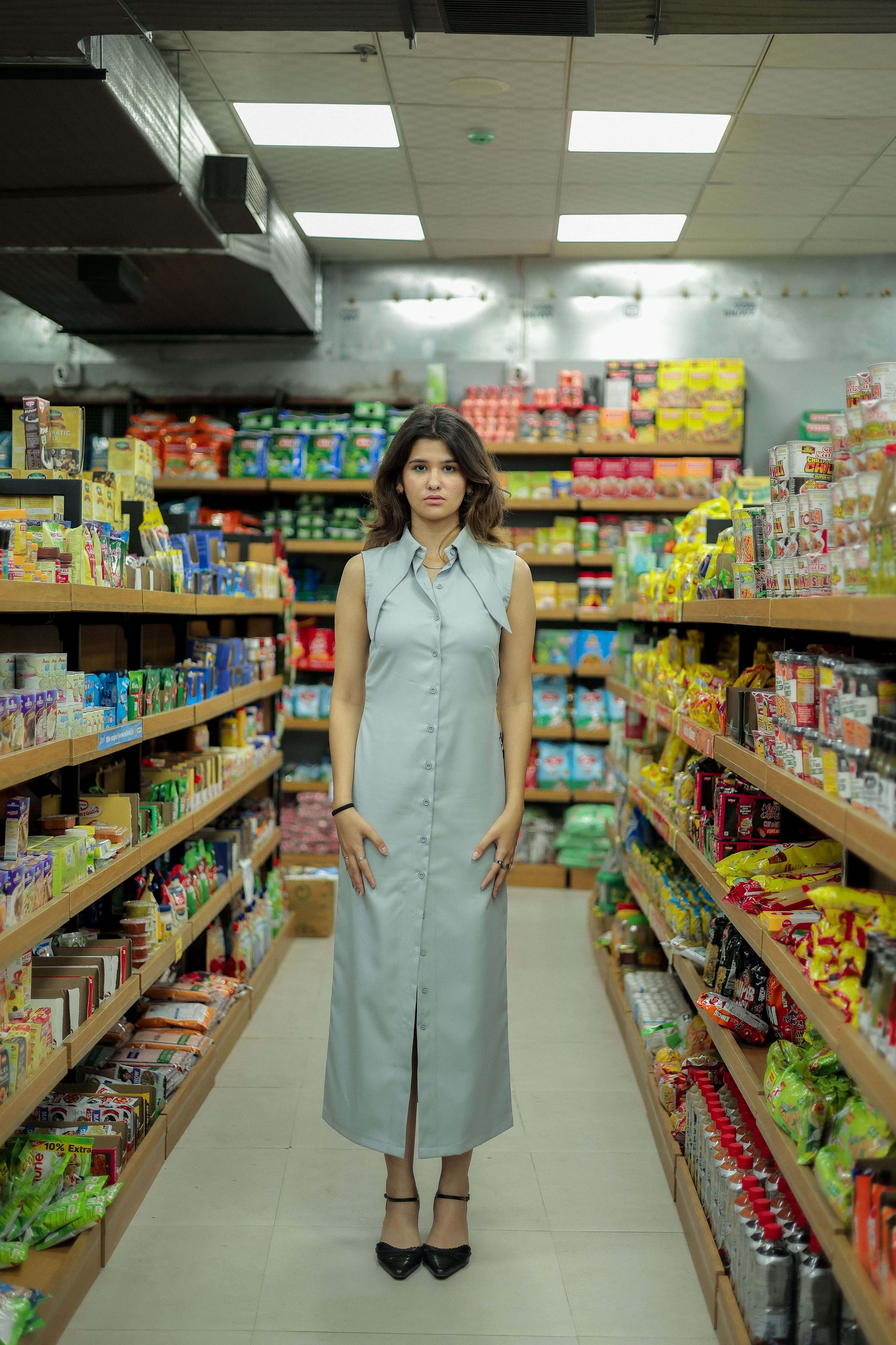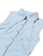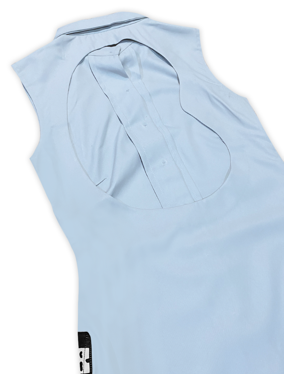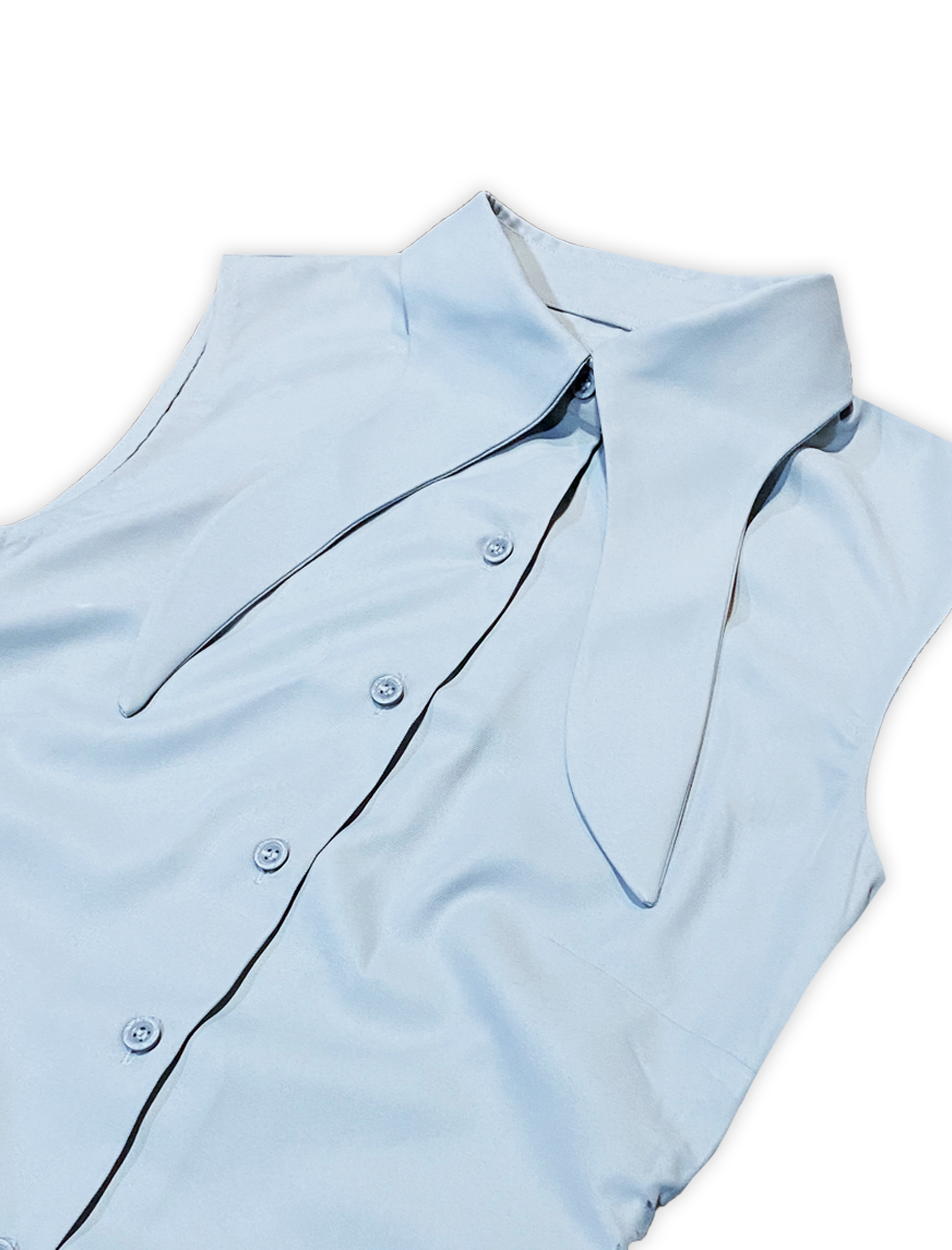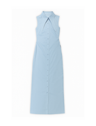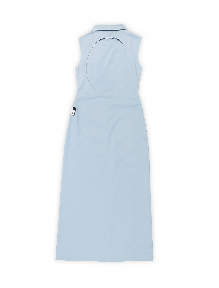 Escape Long Dress, a bold reimagination of the classic shirt dress, tailored for those who dare to stand out. Its sleek fitted silhouette is elevated with a curvy collar and a striking backless cut-out featuring the signature mascot face designed to turn escapes into statements.