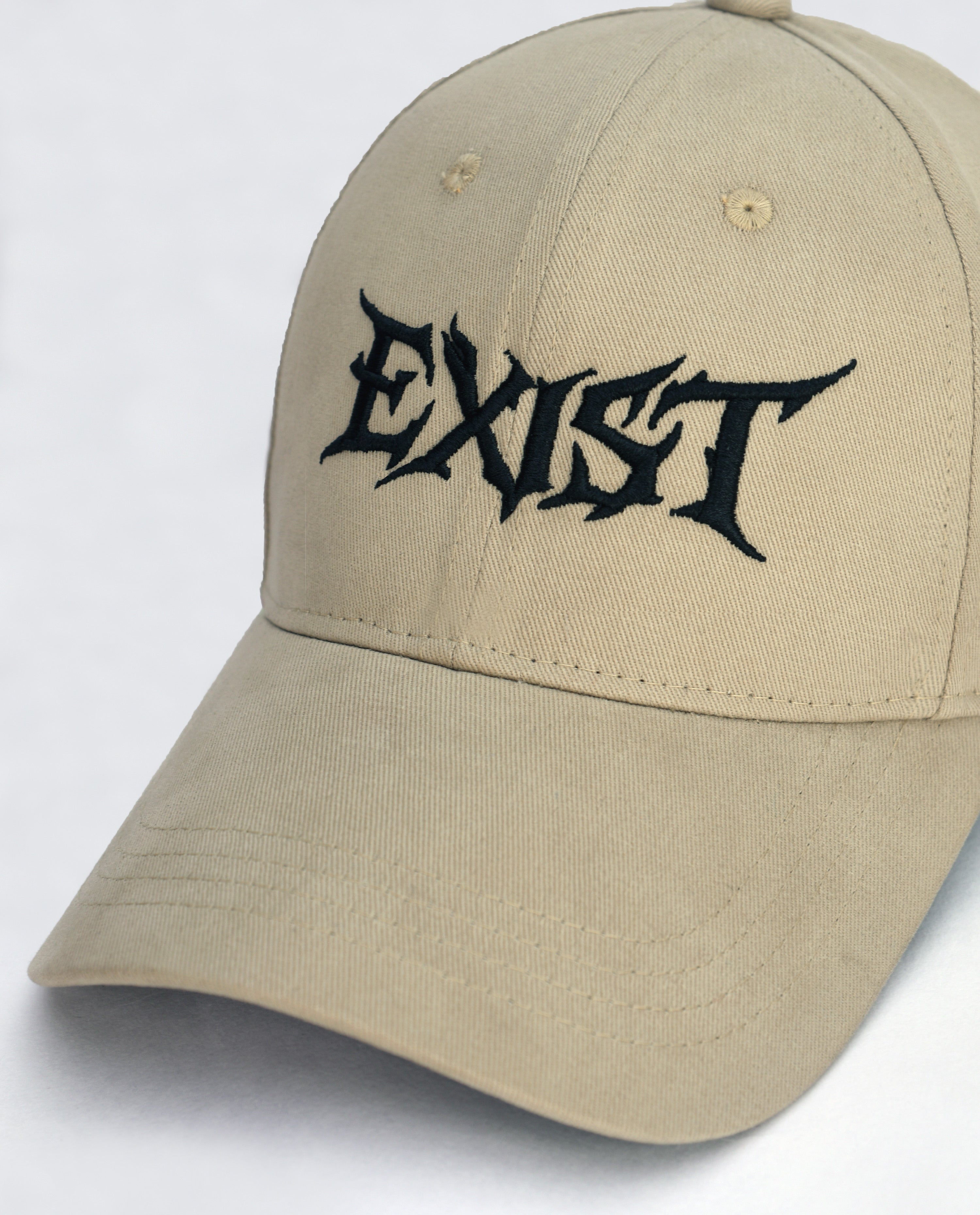 Crafted from premium, soft-yet-structured Khaki Cotton Twill, this cap offers a versatile and earthy foundation. The focal point is the bold, dark embroidery of the word "EXIST" in a striking, almost tribal or gothic script. This design choice isn't just about fashion; it's a philosophical anchor, a reminder of the fundamental truth of being.