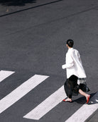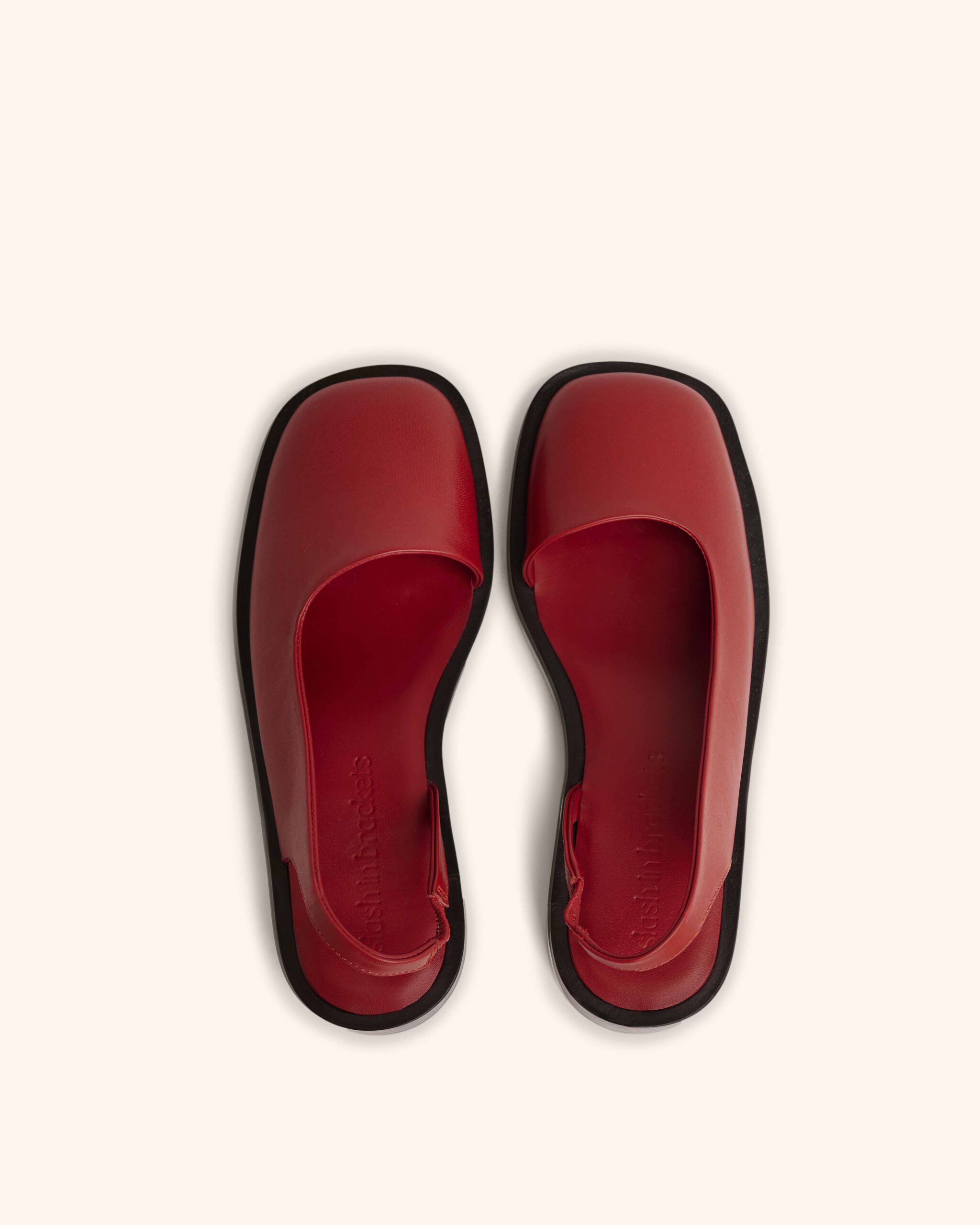 On closer look, the pair is intentionally asymmetrical. When placed together, the shoes create a diagonal slash.