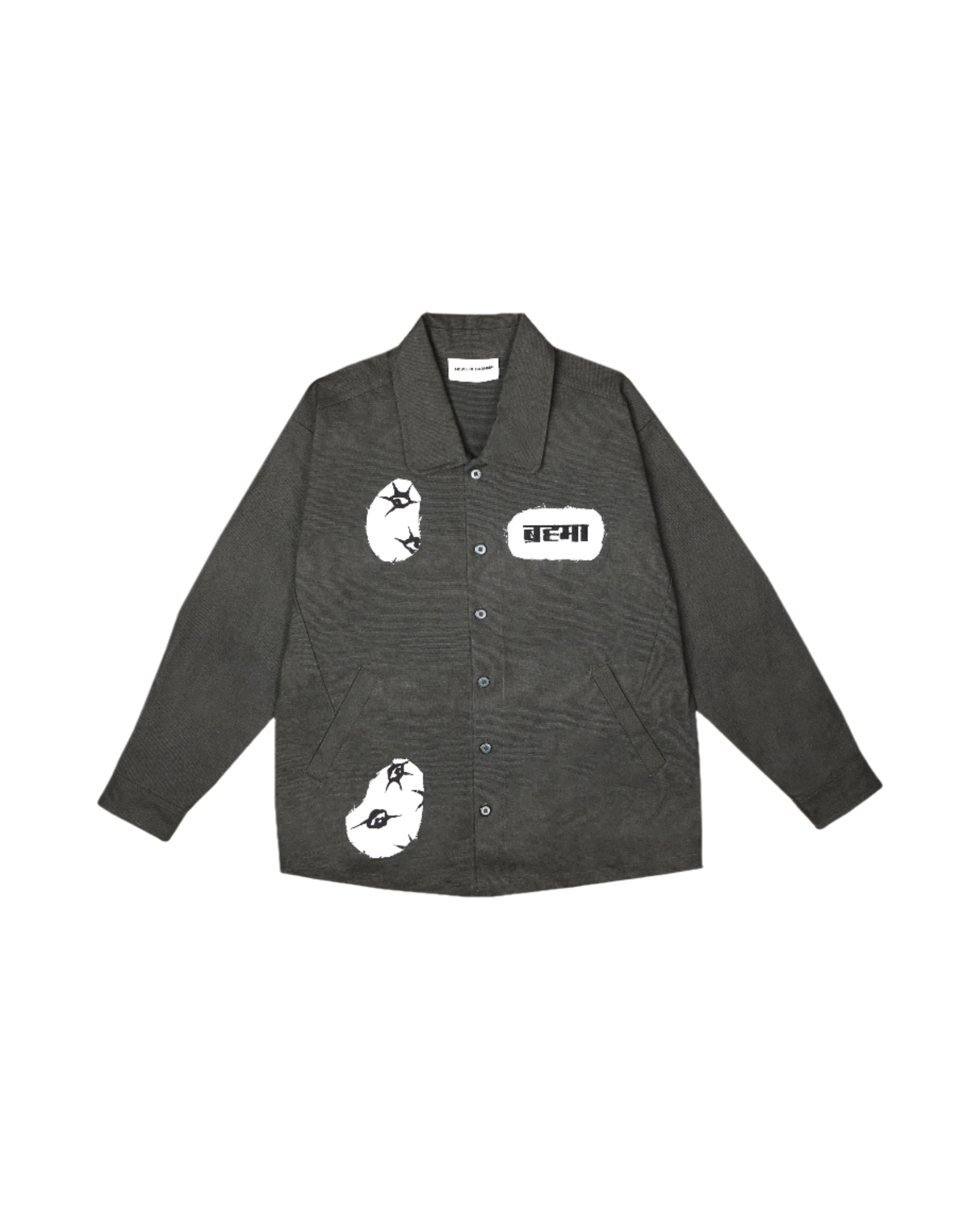 The patches are intentionally distressed, adding depth and texture to the design. Featuring a button-up front, a sharp collar, and adjustable cuffs, this shacket combines both functionality and artistic expression, making it perfect for layering or wearing solo. A standout addition for those who seek minimalism with a twist of rebellion.