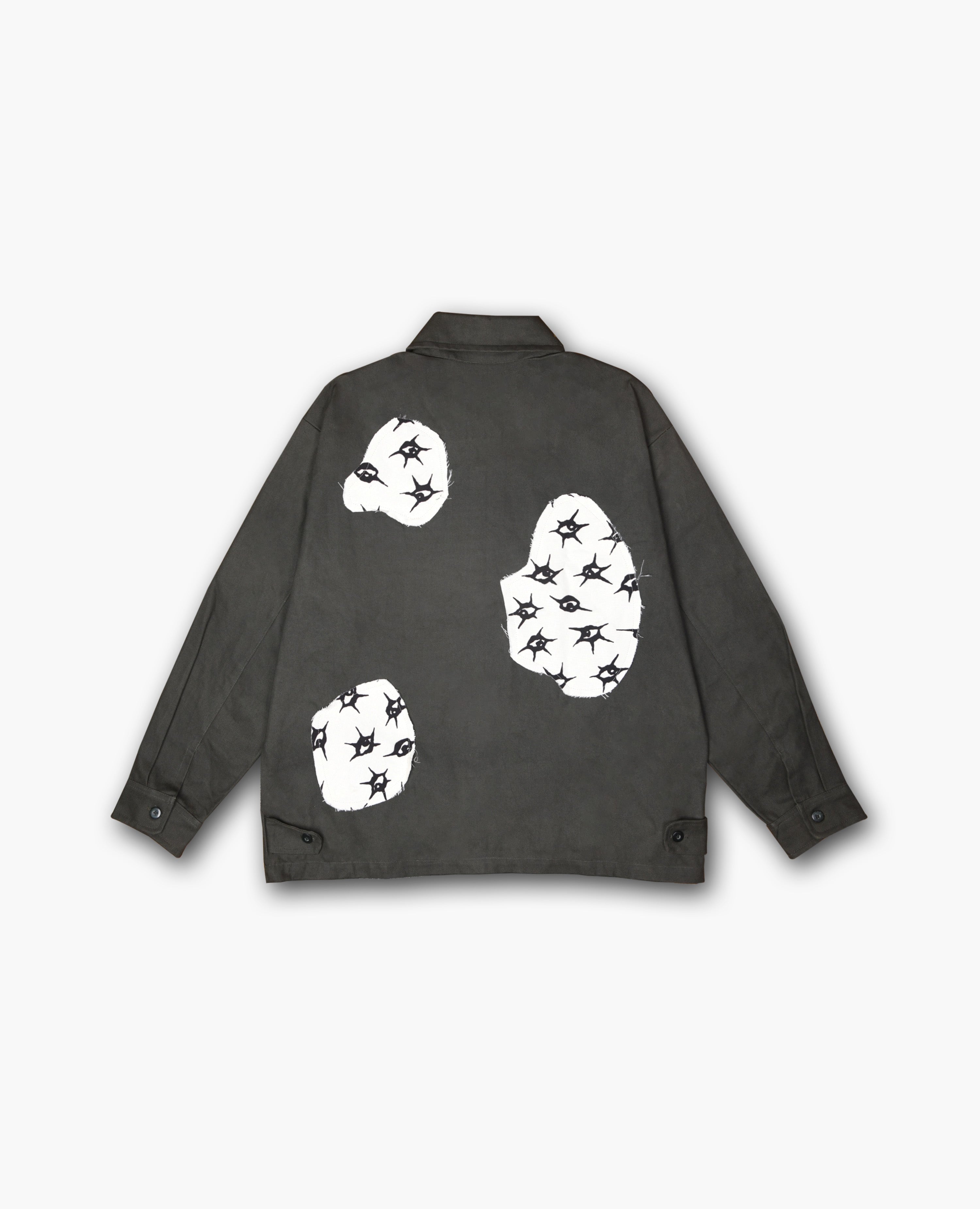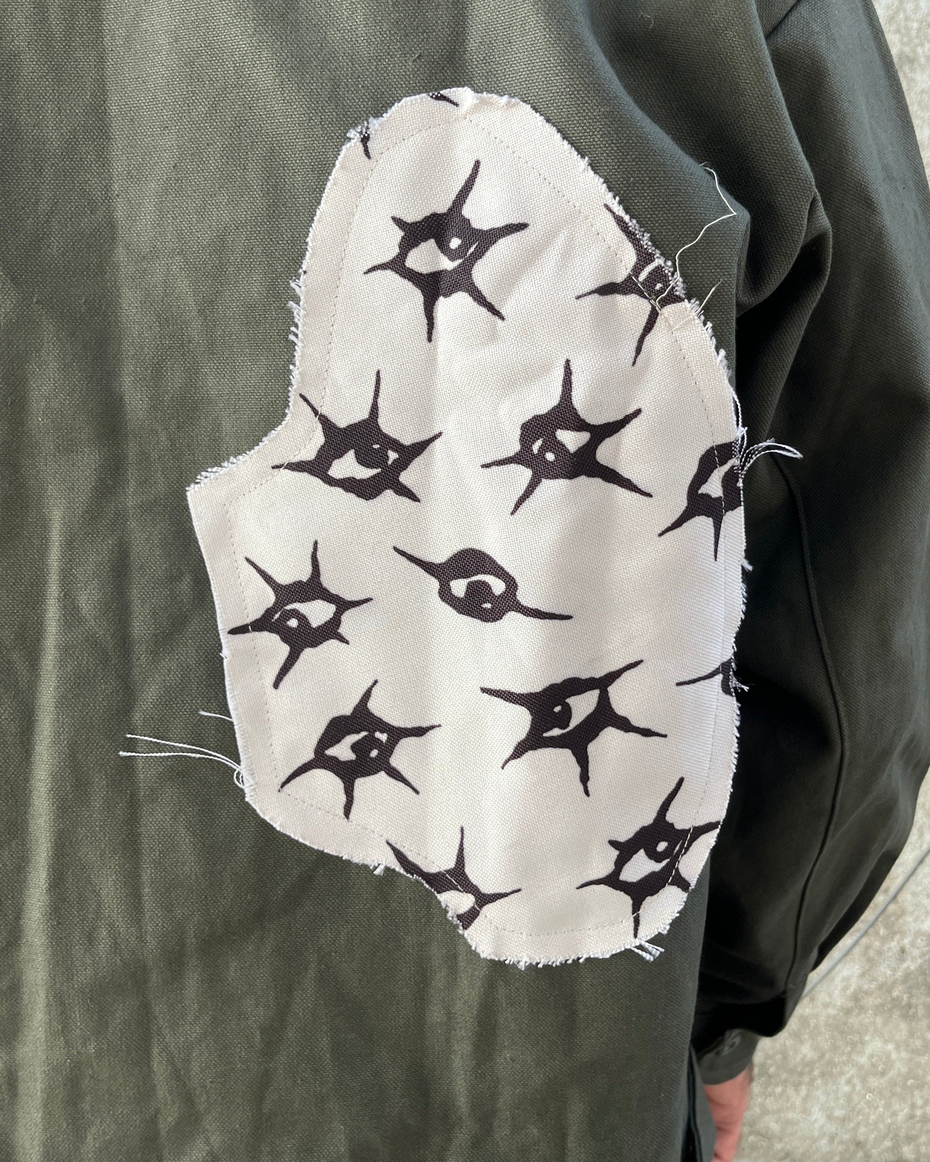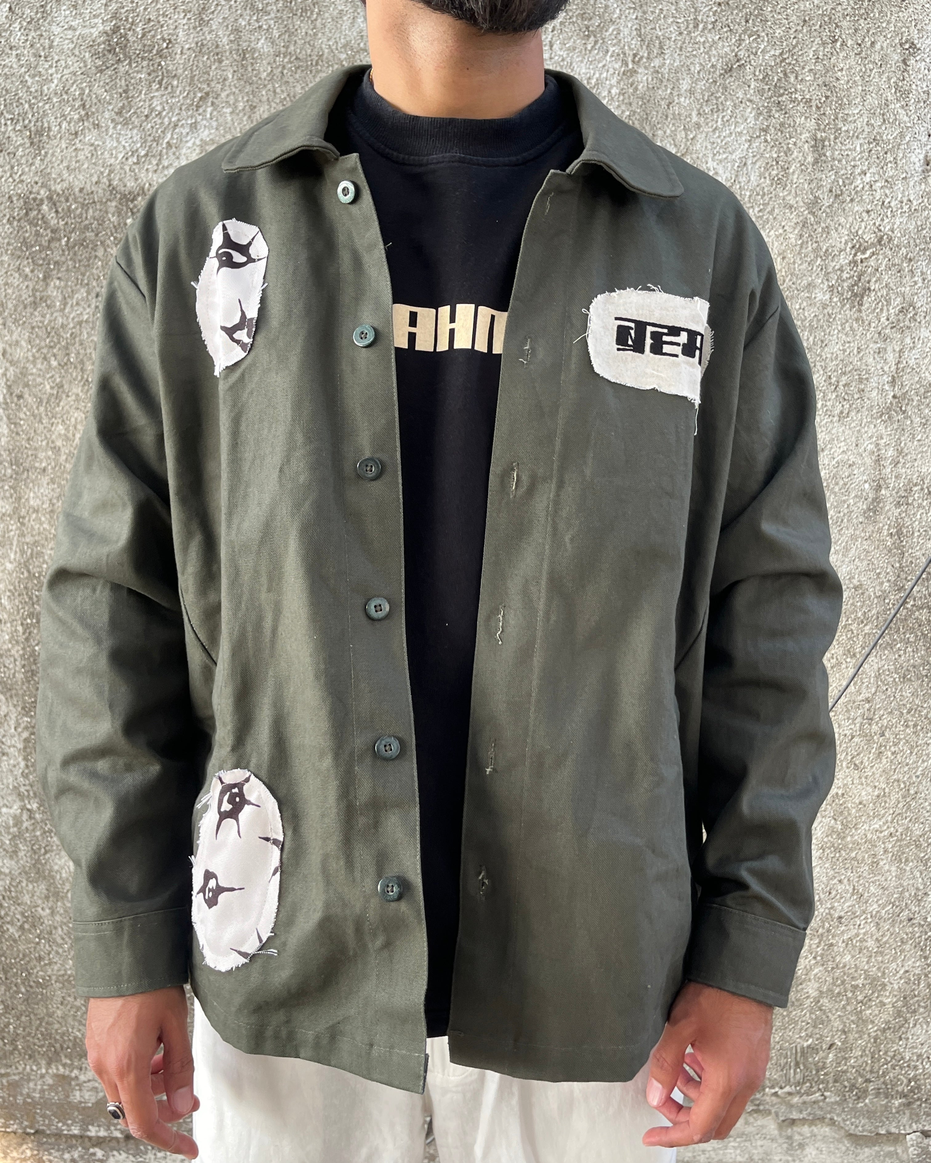Introducing a perfect blend of style and versatility. Crafted from premium cotton, this shacket offers a comfortable yet structured fit, ideal for light winter and summer wear. Its muted army green tone adds a rugged yet sophisticated vibe, while the unique eye-printed patchwork detailing across the front and back elevates it into a bold statement piece.