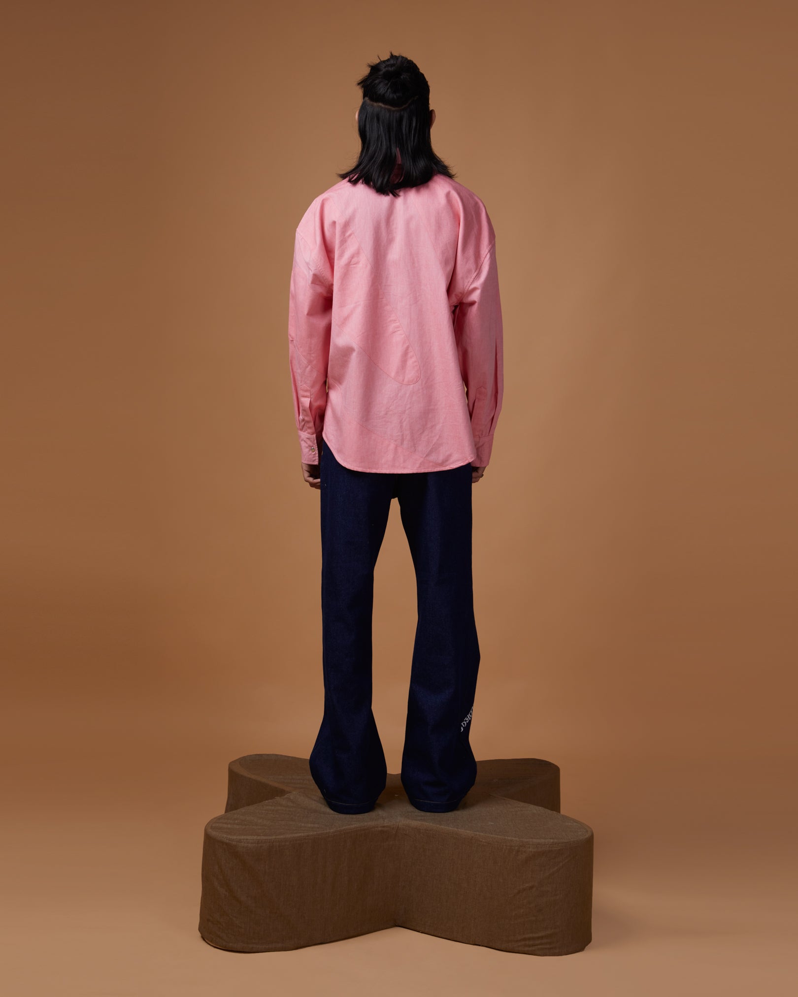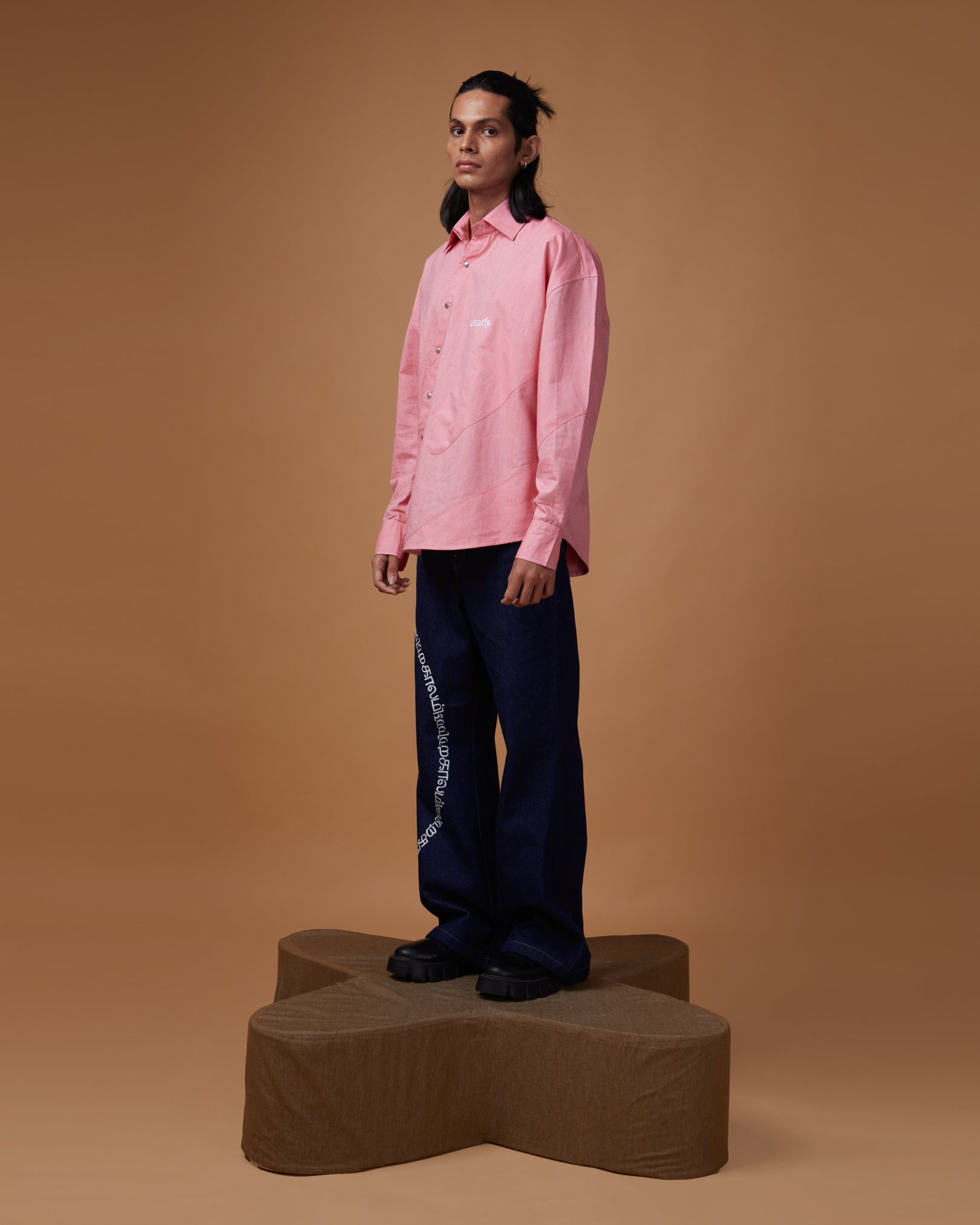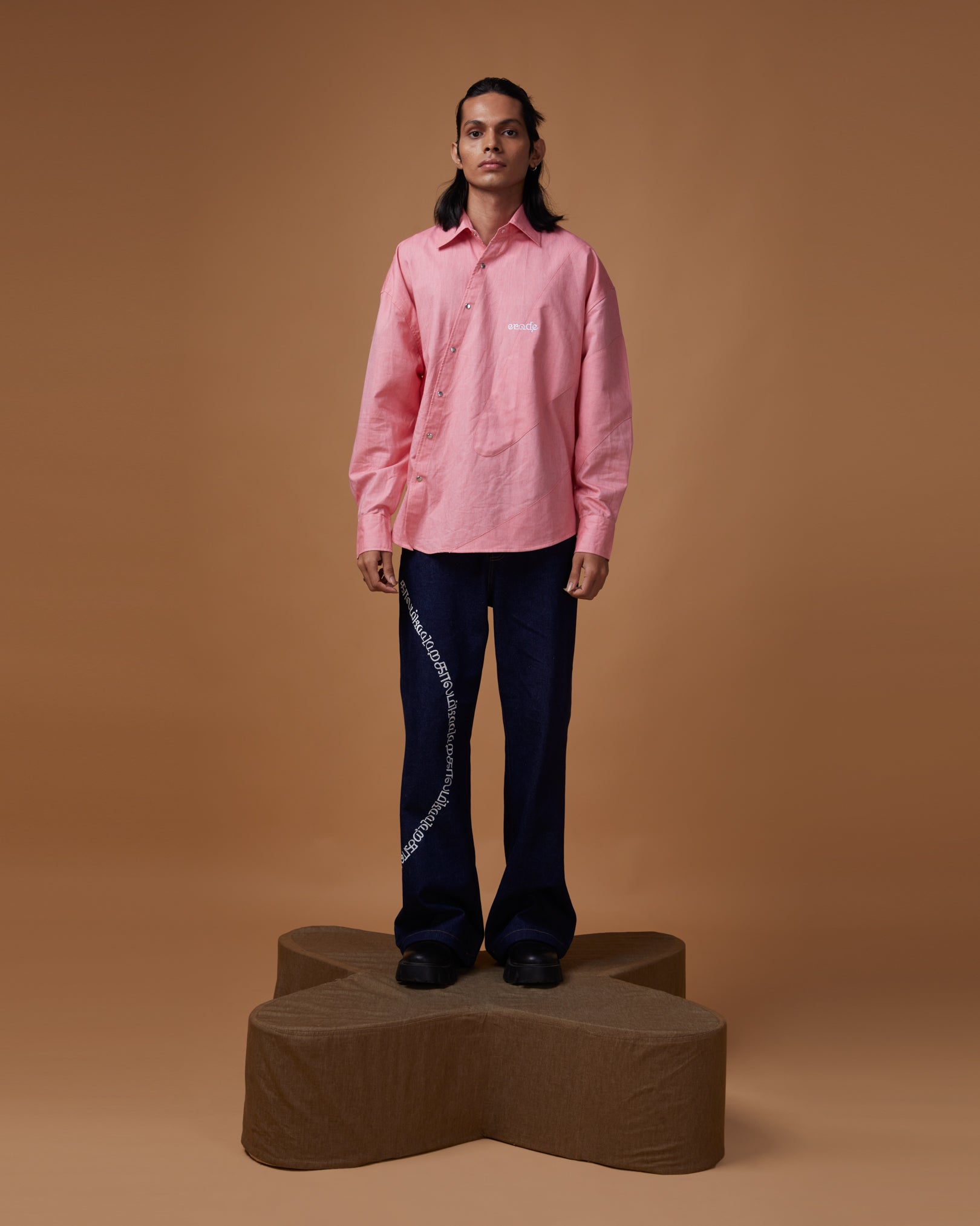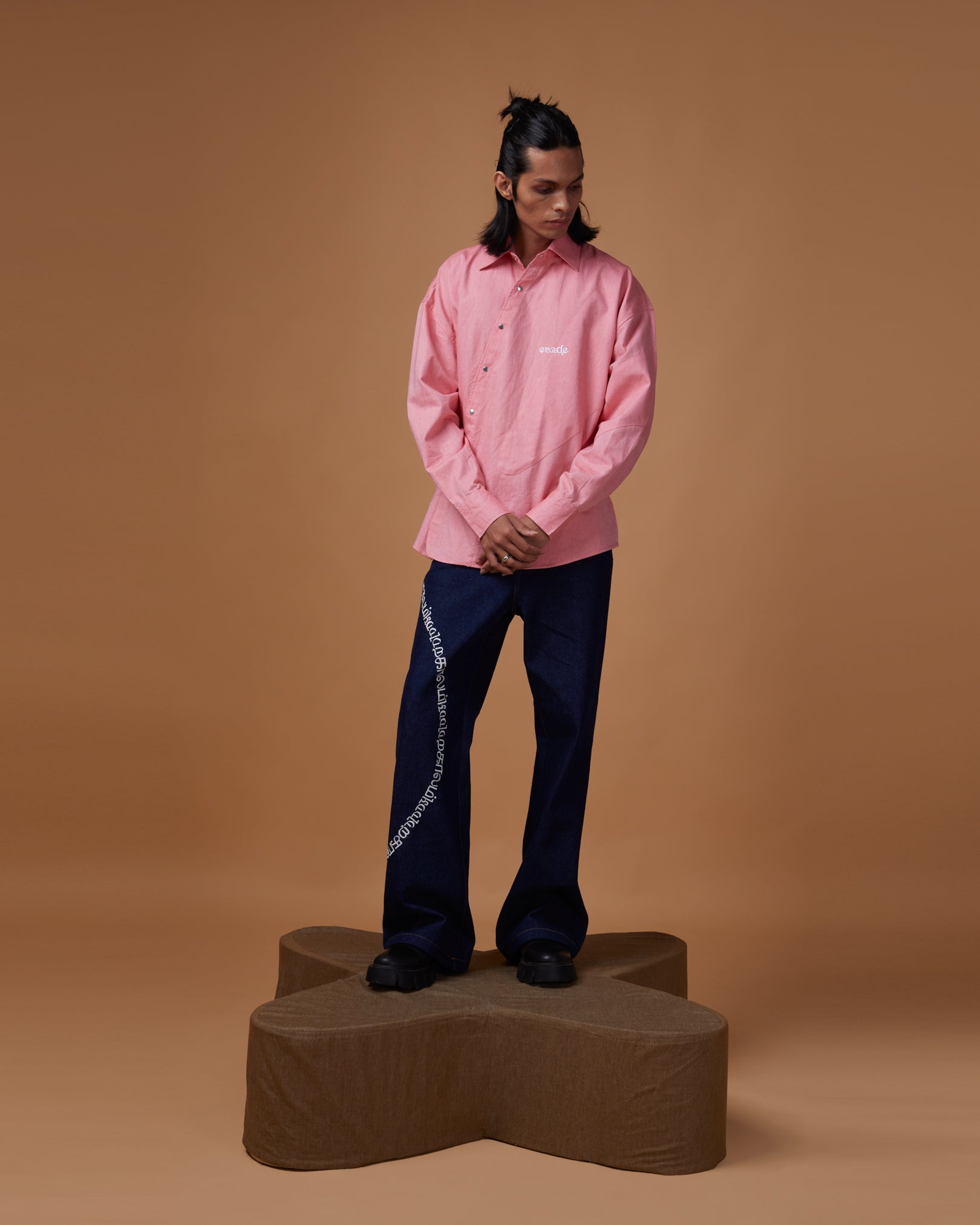 The "FADE INTO YOU" is our Pink-Pink Oxford cotton original shuttle shaped cutout. This shirt is Monochrome patched gracefully with ERODE logo embroidered. Big oversized, crisp collar, shuttle shaped buttoned placket and big full sleeves with silver snap closure.