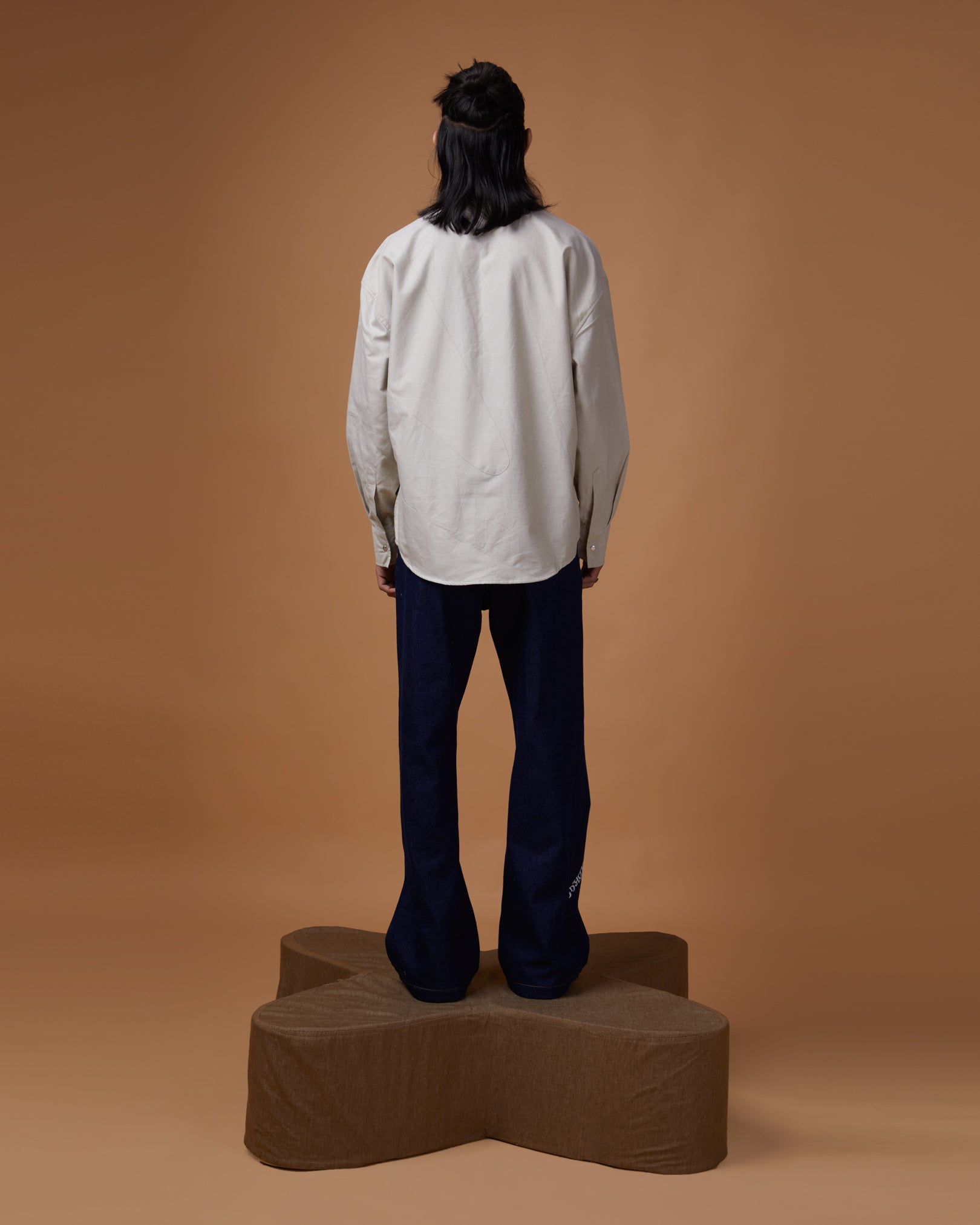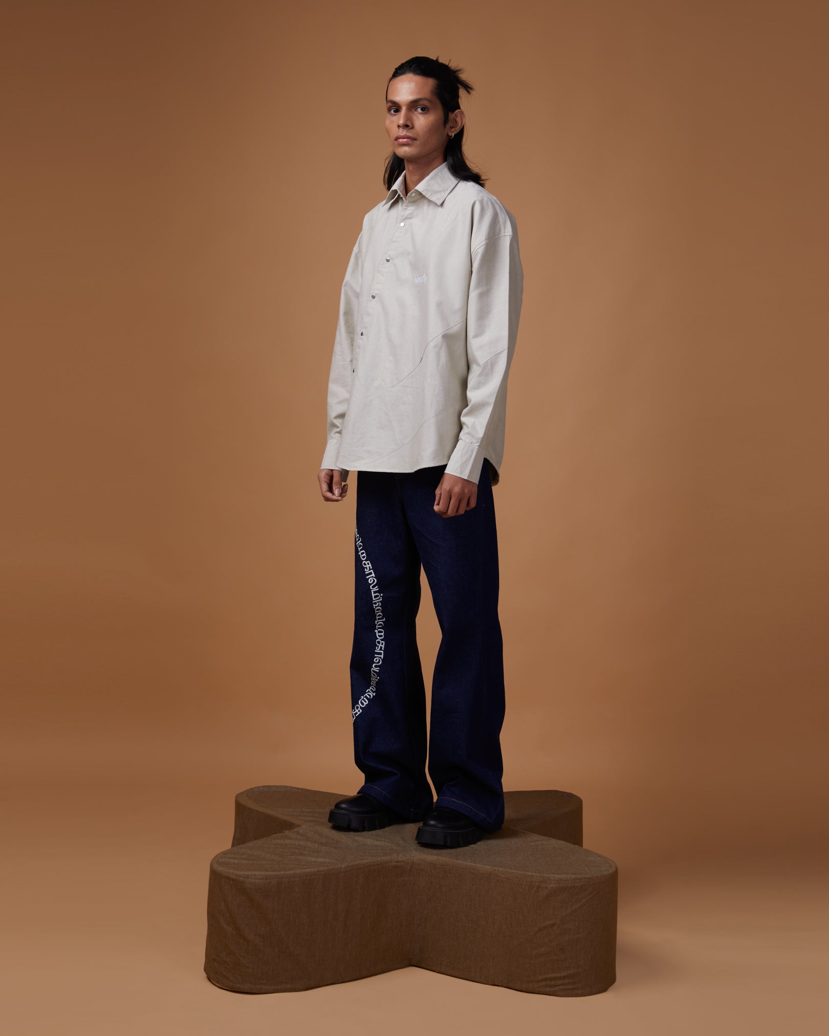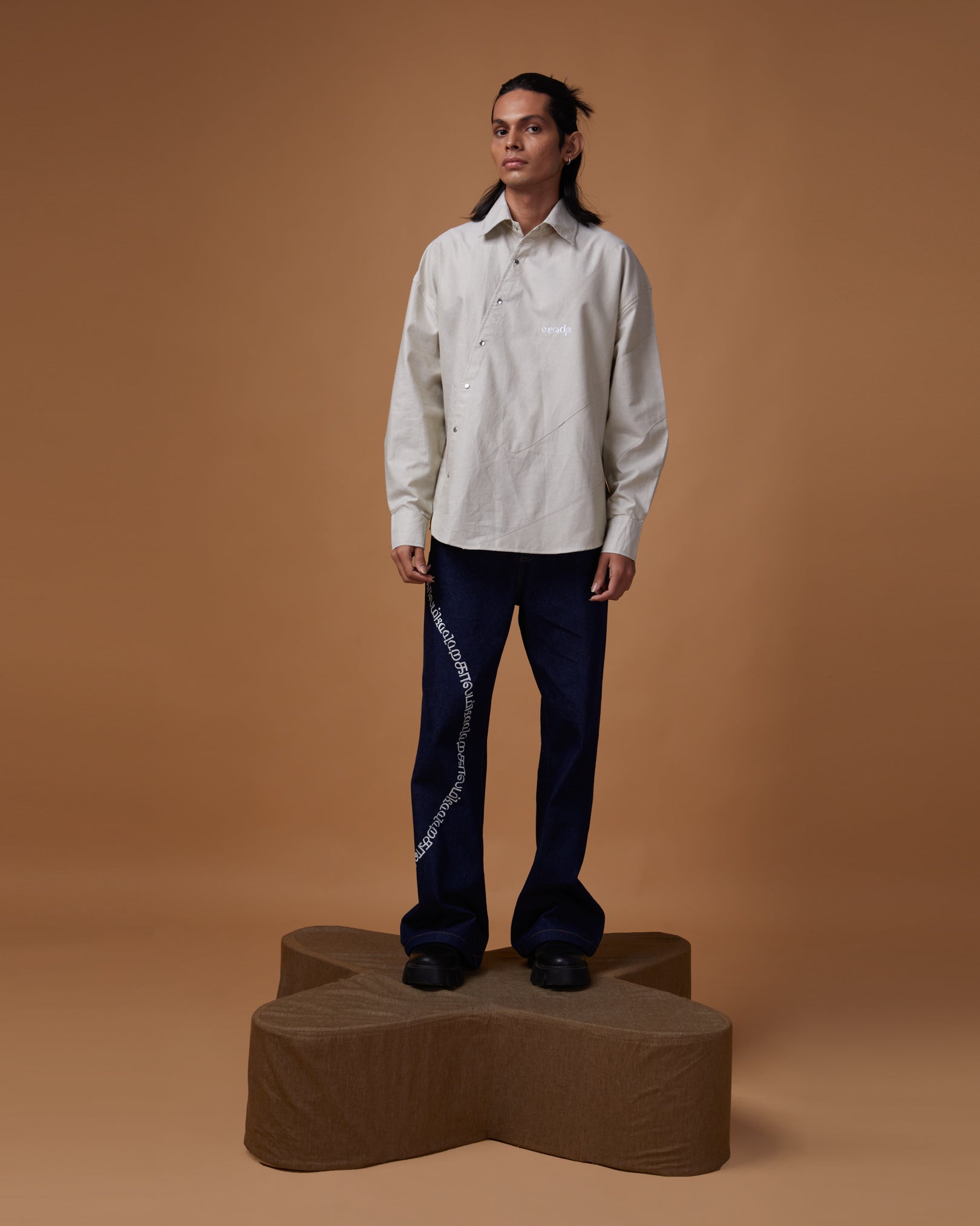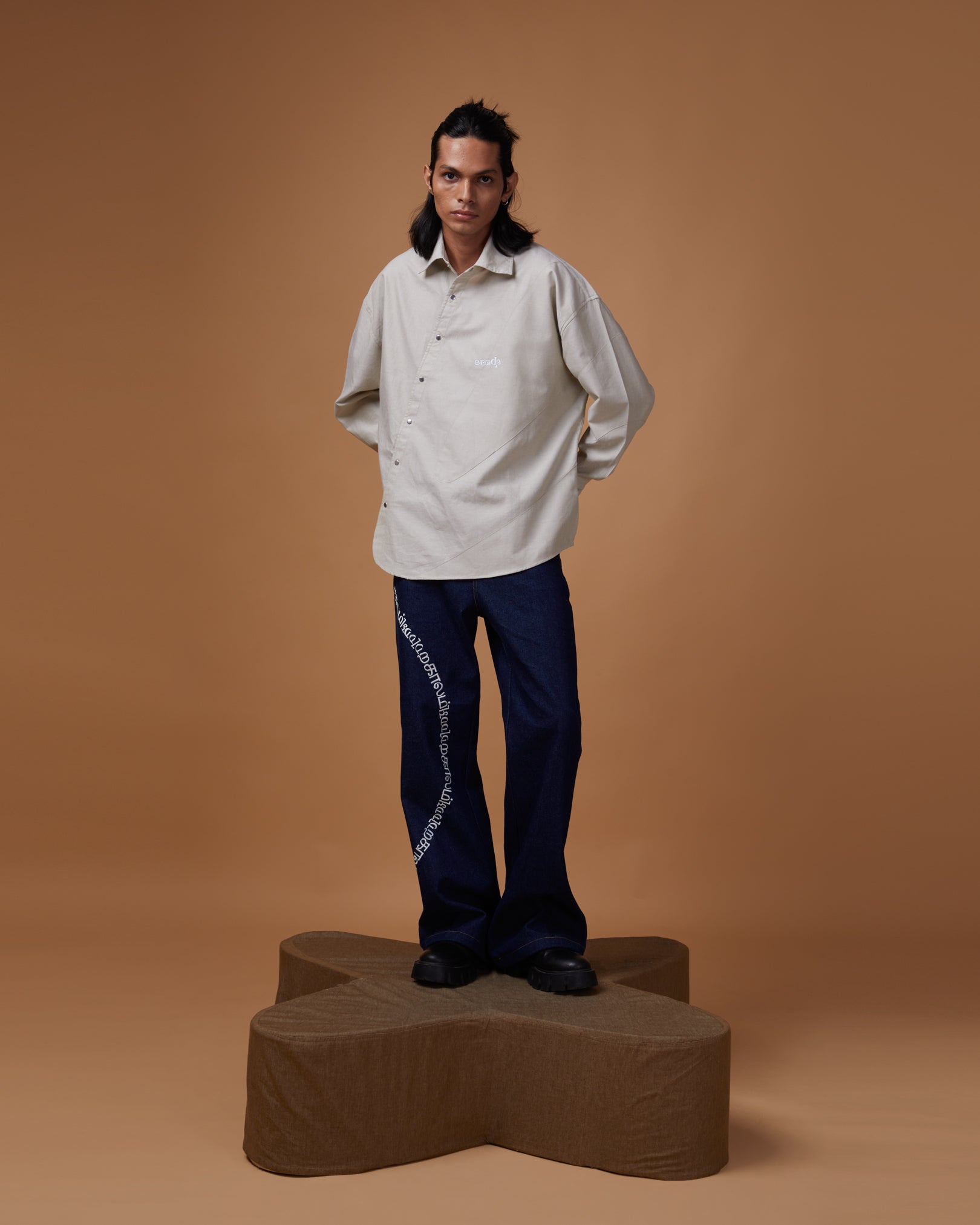 The "FADE INTO YOU" is our Olive-Olive Oxford cotton original shuttle shaped cutout. This shirt is Monochrome patched gracefully with ERODE logo embroidered. Big oversized, crisp collar, shuttle shaped buttoned placket and big full sleeves with silver snap closure.