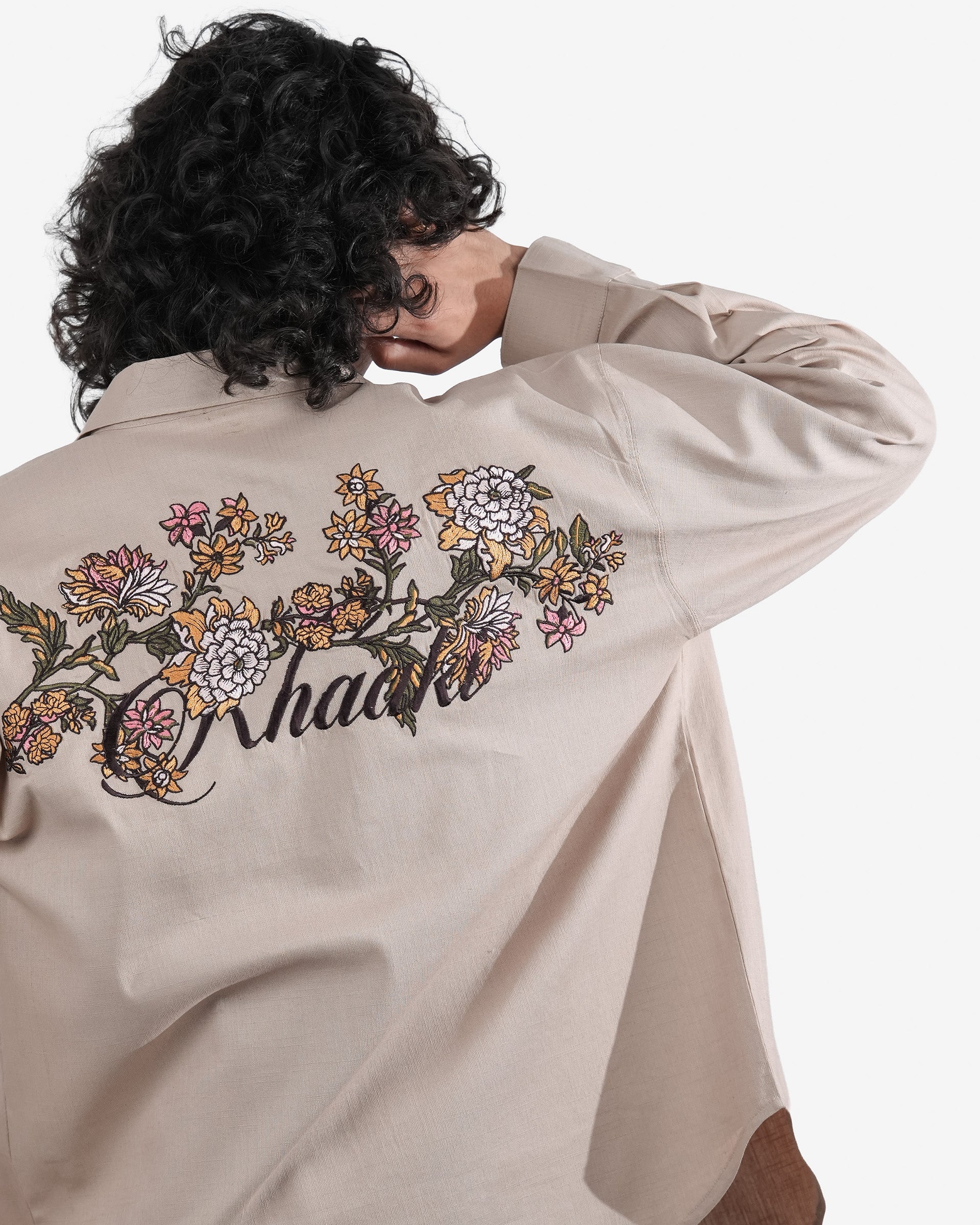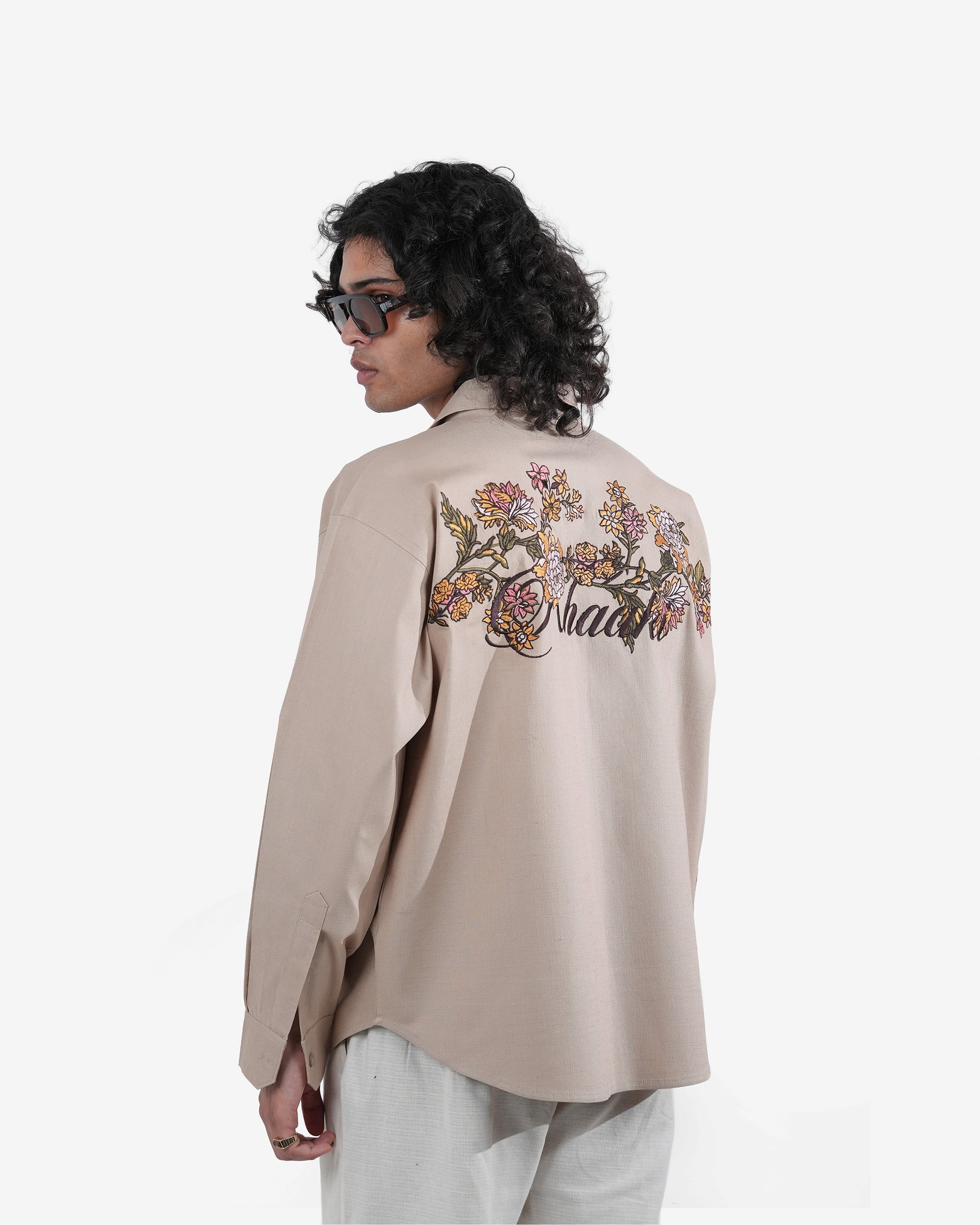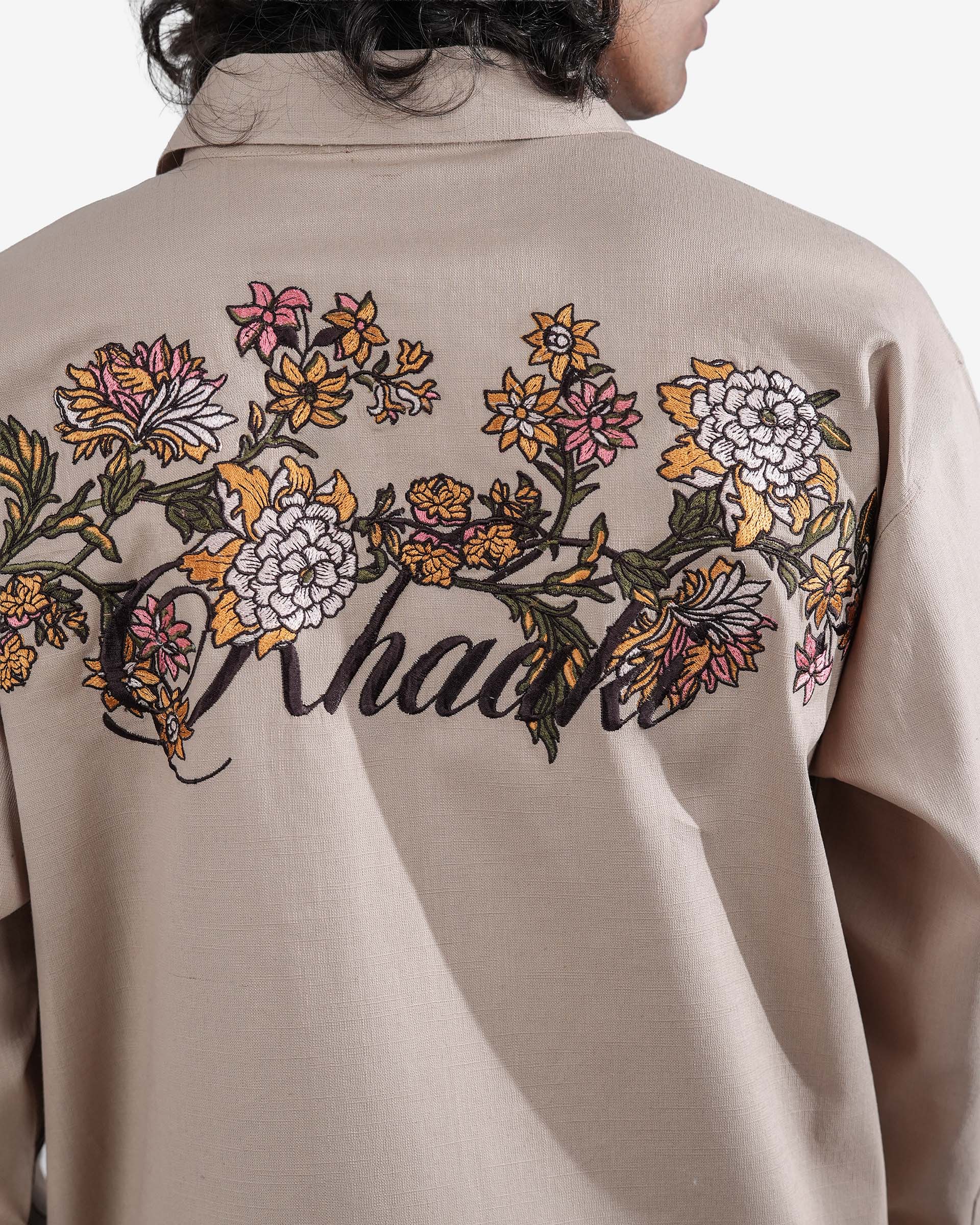 Featuring 2.5 lakh-stitch floral embroidery across the back, framing intricate detail. With double flap pockets on the chest and long sleeves with buttoned cuffs, a piece that speaks for itself when layered or worn solo.