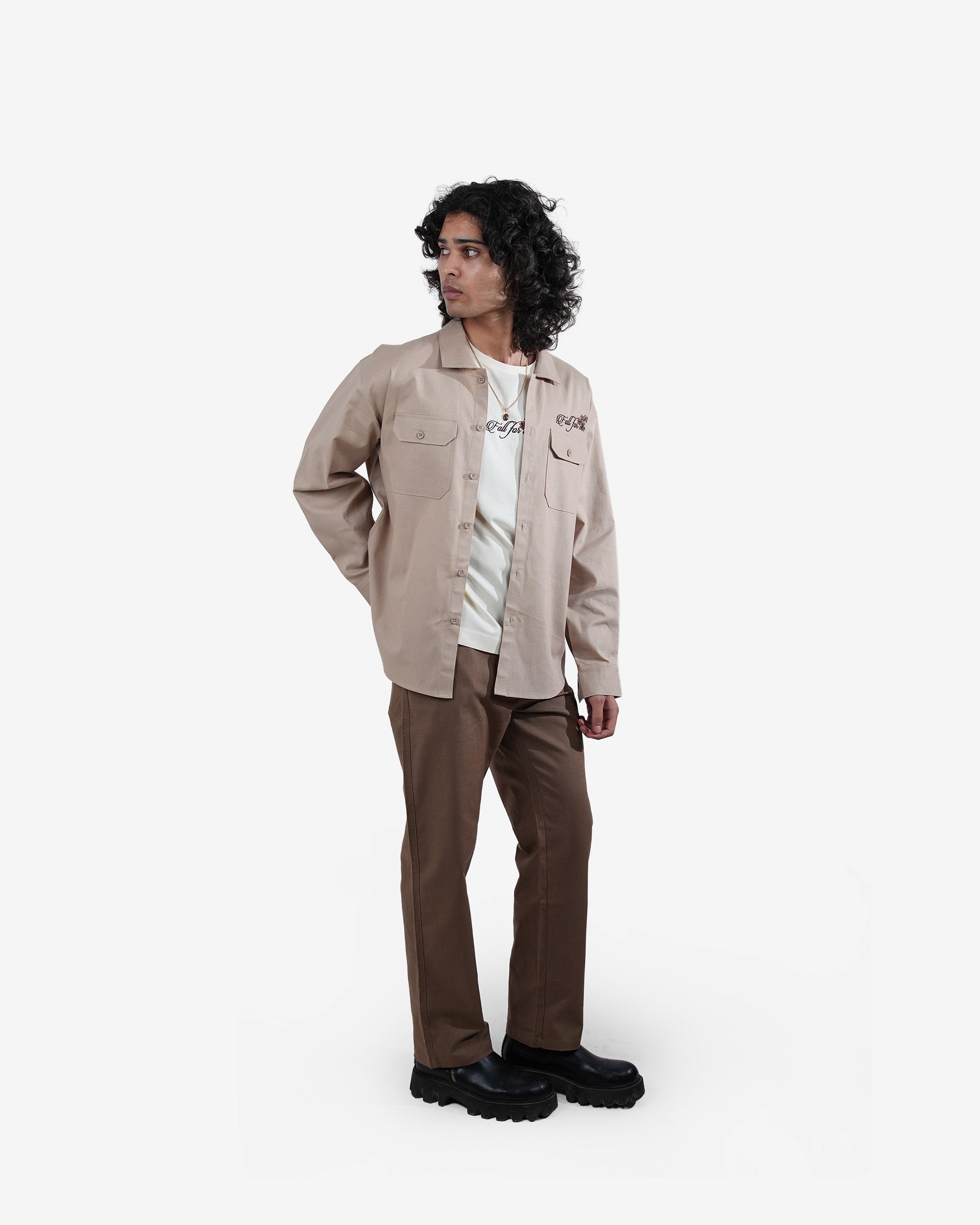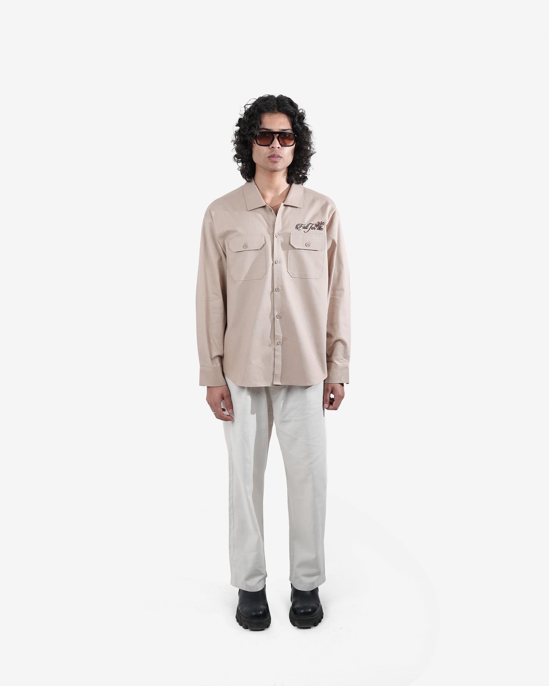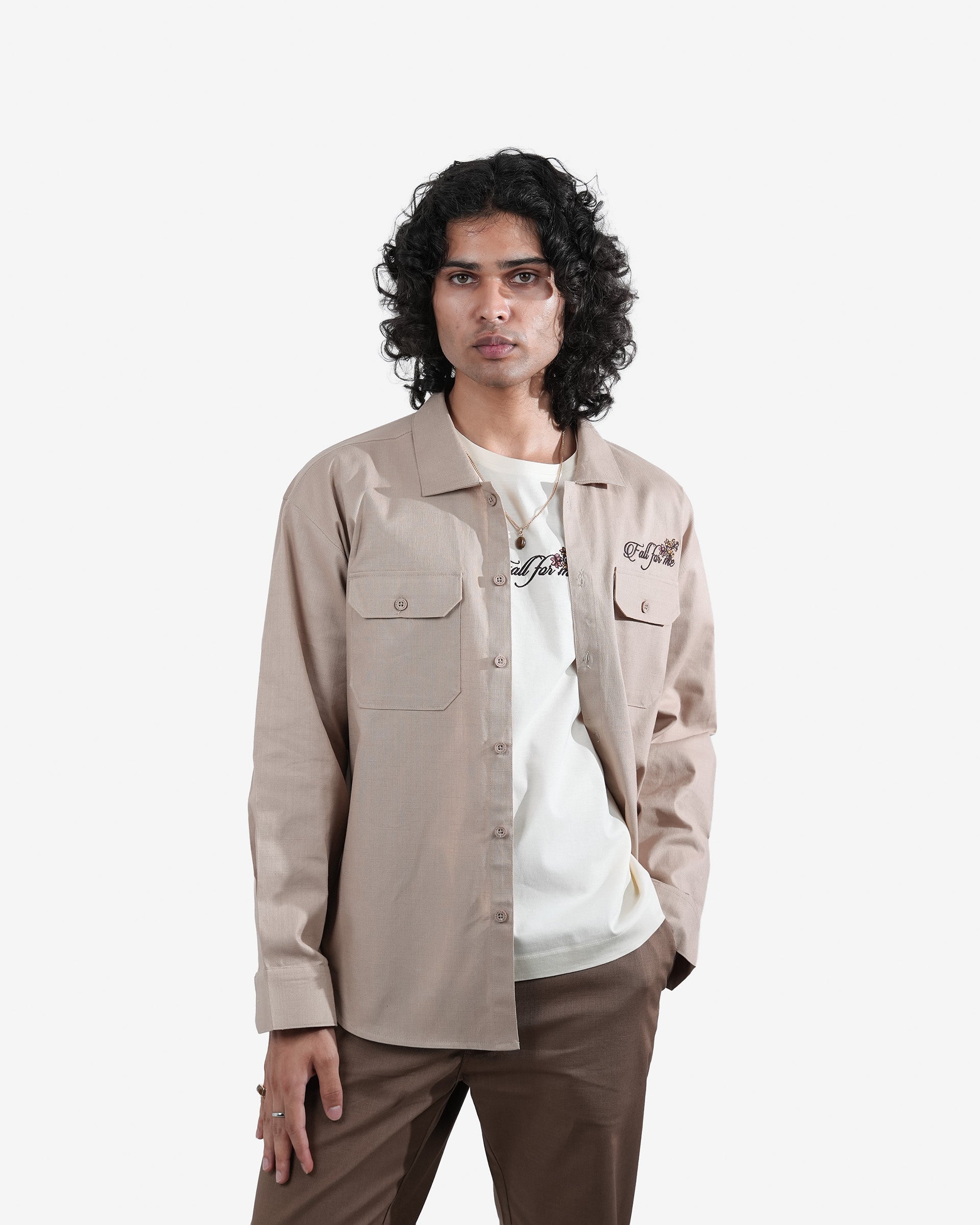 Featuring 2.5 lakh-stitch floral embroidery across the back, framing intricate detail. With double flap pockets on the chest and long sleeves with buttoned cuffs, a piece that speaks for itself when layered or worn solo.