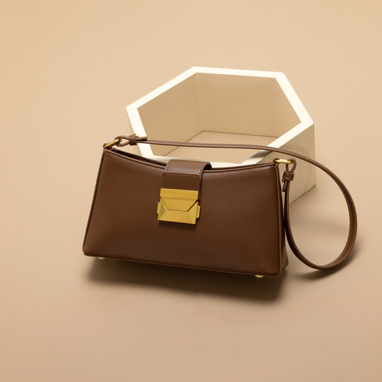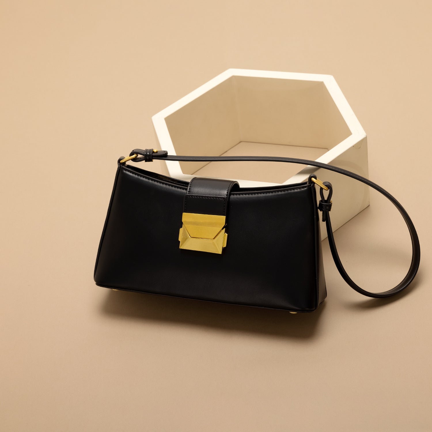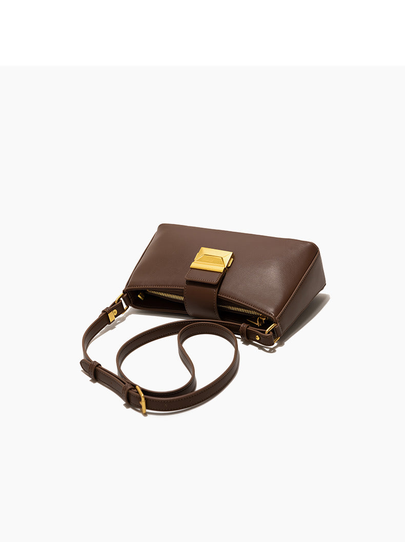 2. Elegant Gold Accents: Features a gold buckle lock at the front and a smooth gold-finish metal zipper, adding a touch of sophistication.