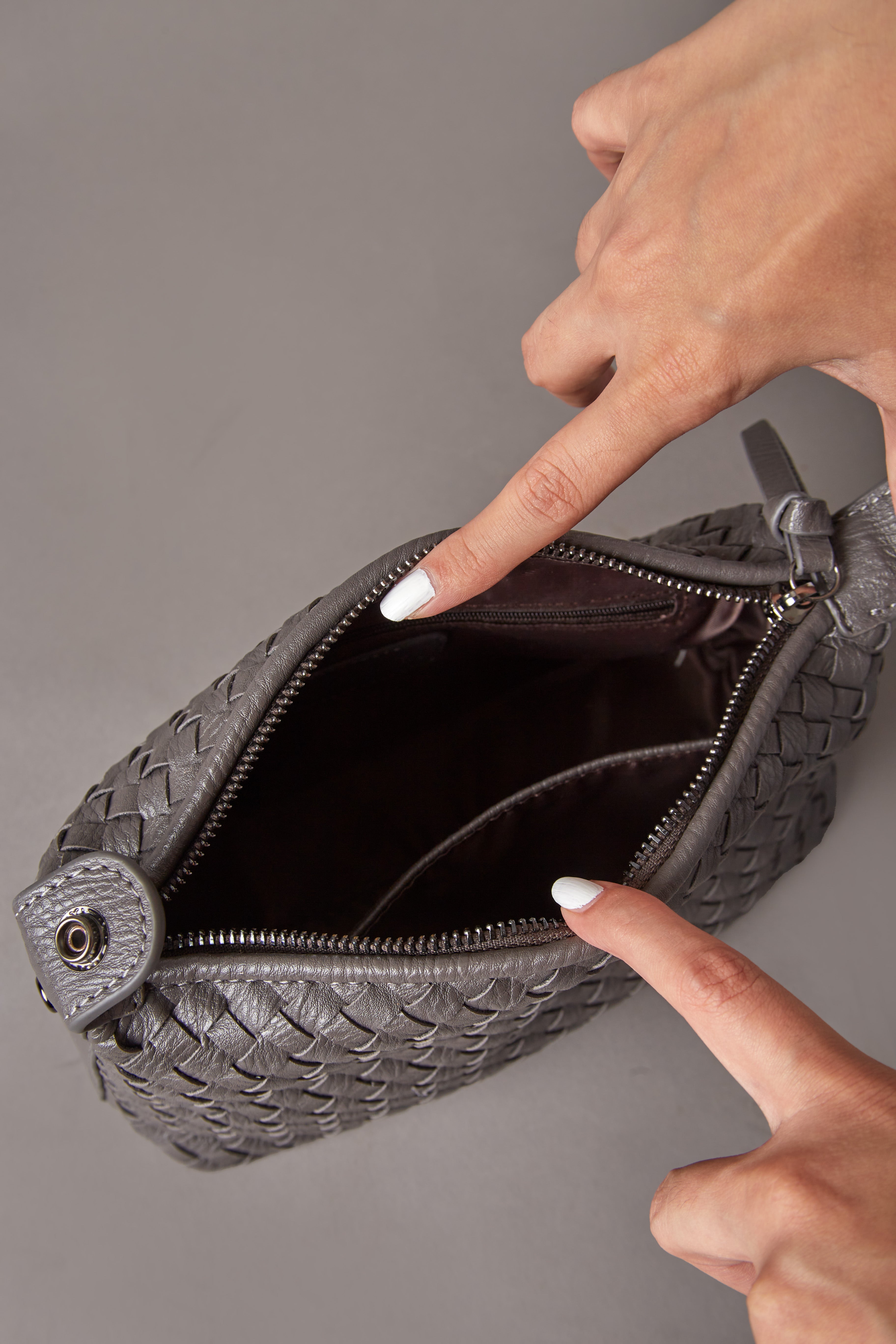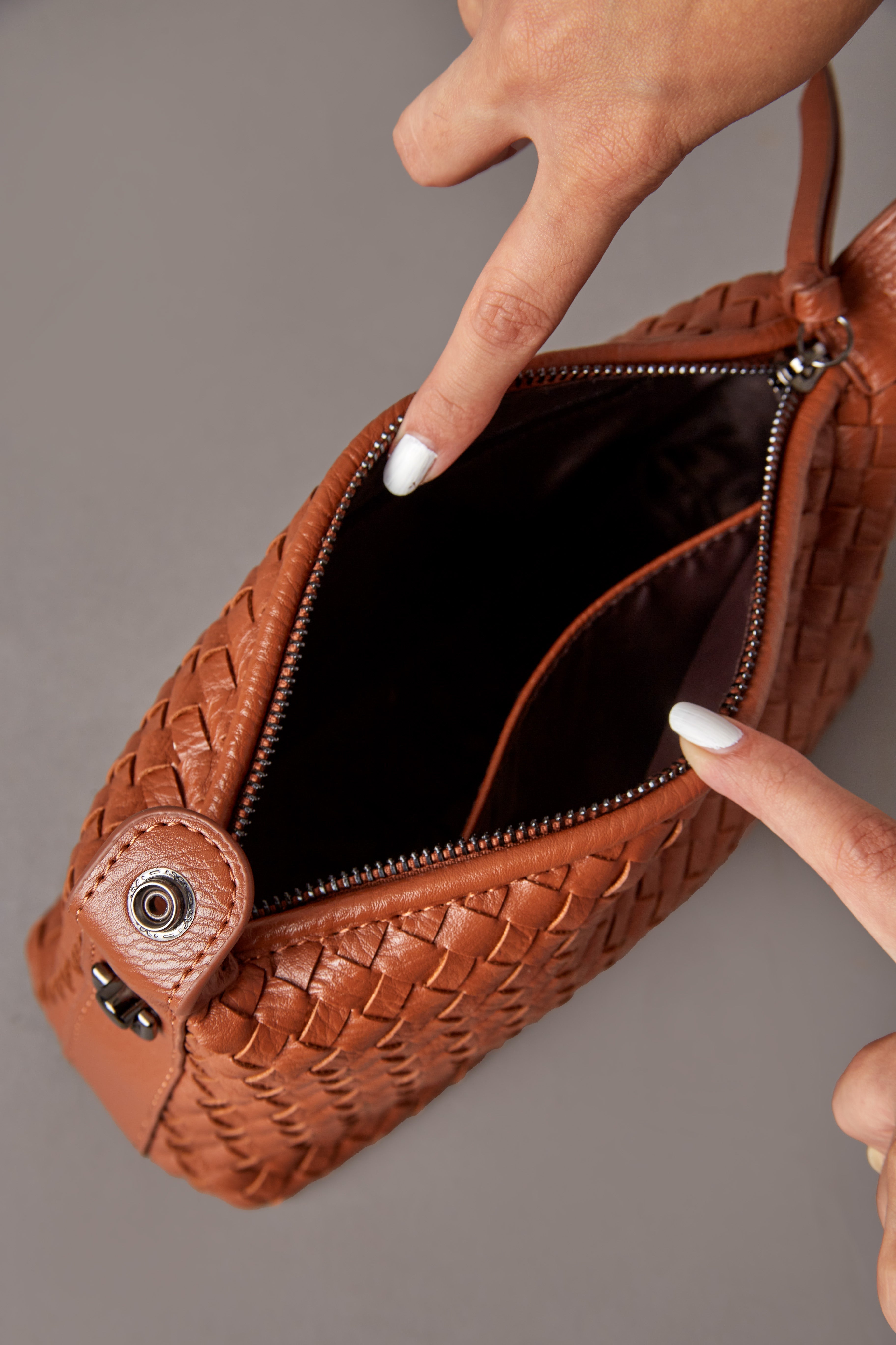 2. Secure Closure: A smooth metal zipper with a matching faux leather puller.