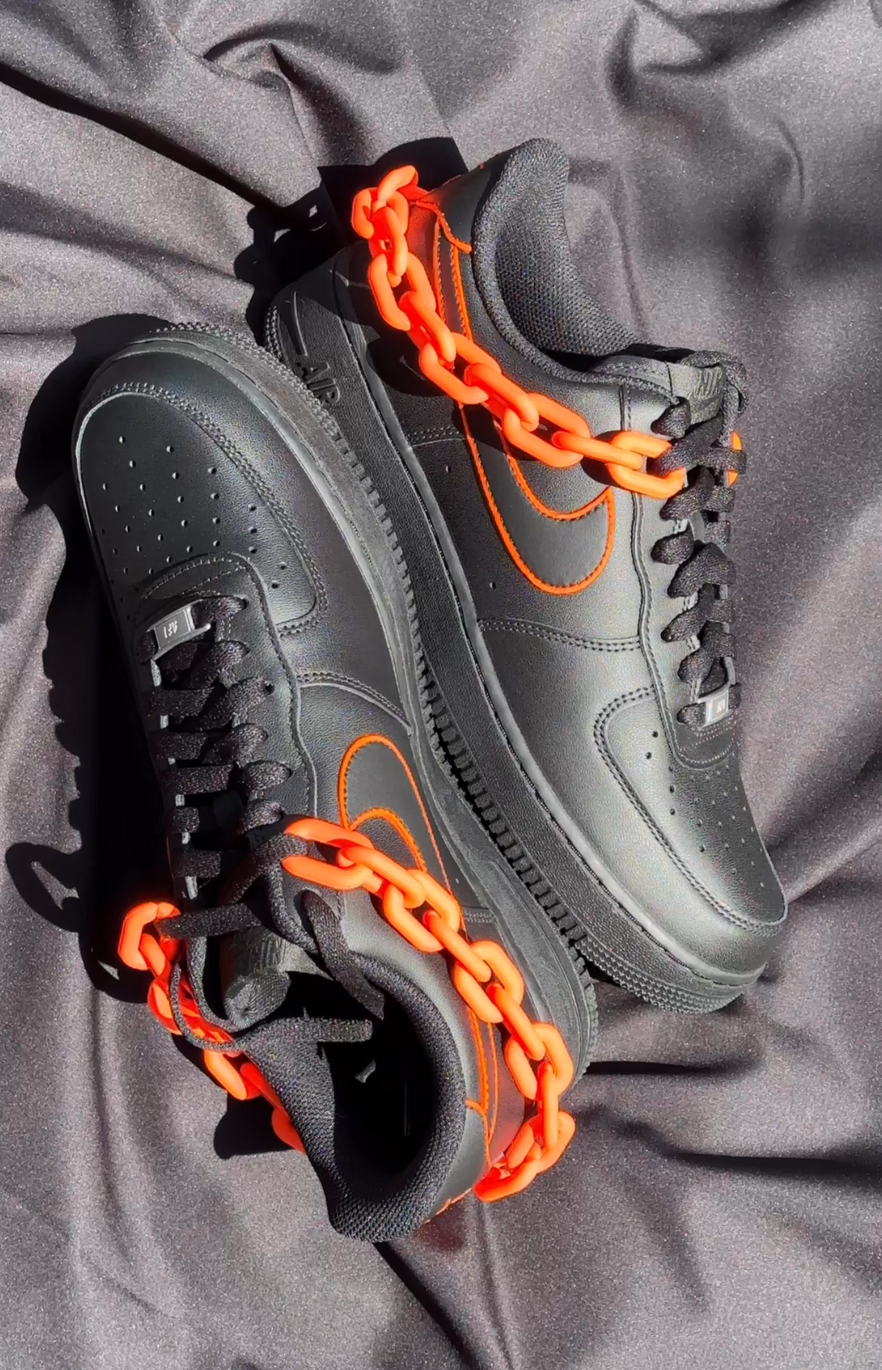 Designed for risk-takers like you, this black Nike AF1 features vibrant flaming orange accents on the swoosh and backtab. Complete the look with the neon linkup chain. Dare to stand out from the crowd and elevate your style with this bold and dynamic shoe.
