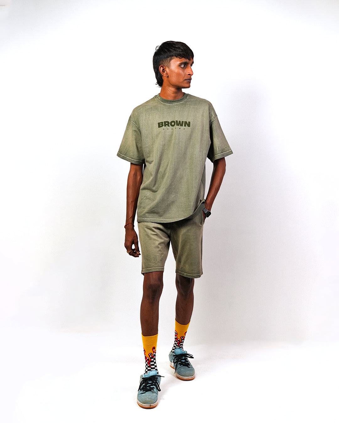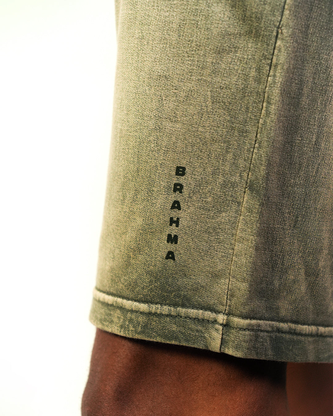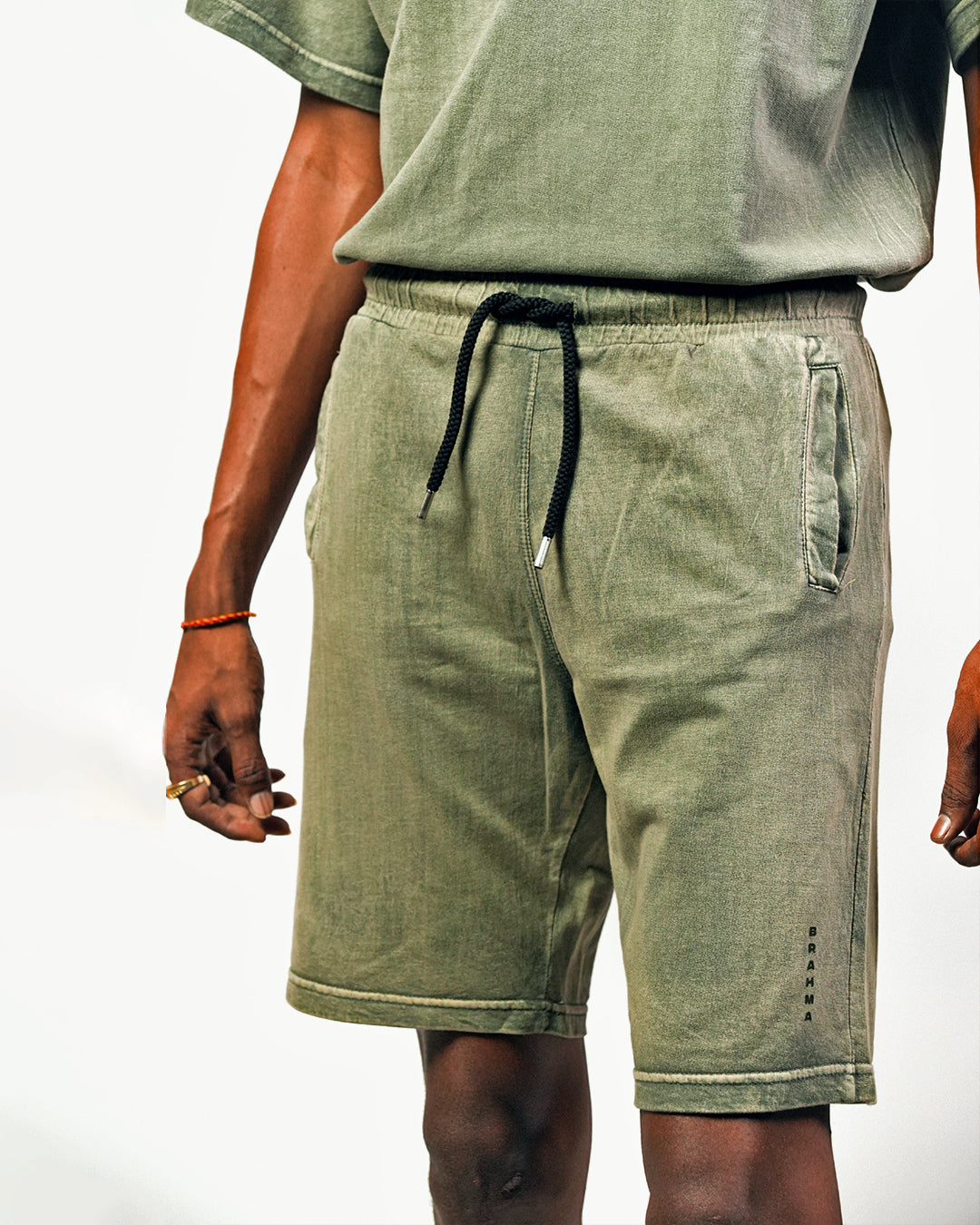 Introducing Brahma's cord-set for summer: a stylish T-shirt and shorts duo featuring a trendy wash effect. Crafted for comfort and style, the set is perfect for those sunny days. Wear the emblem of Brahma with pride and embrace the season with flair.