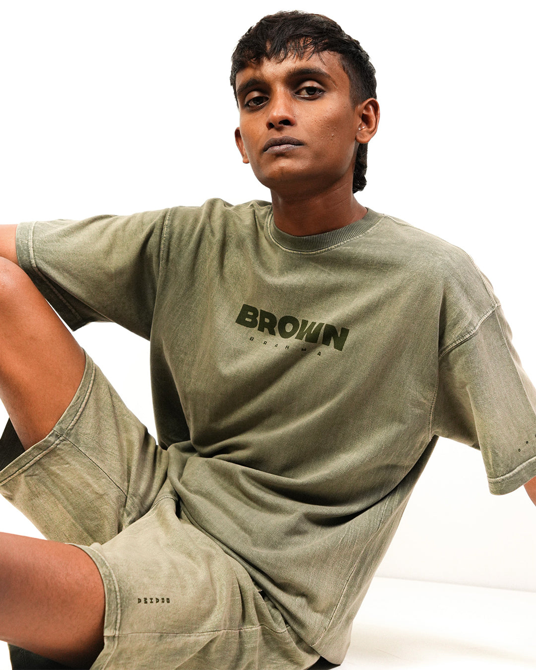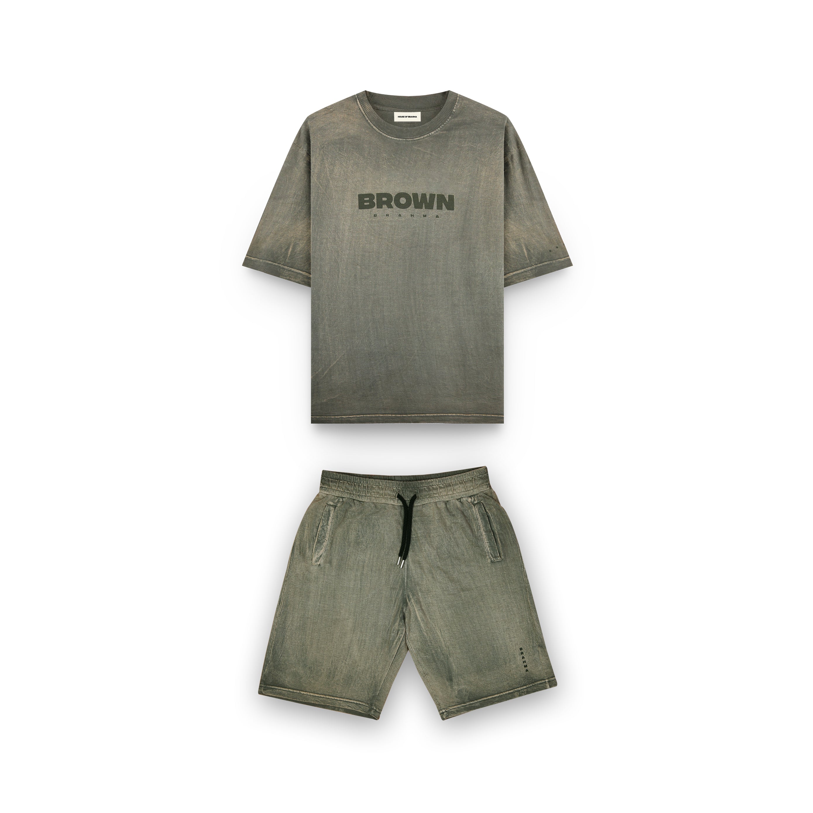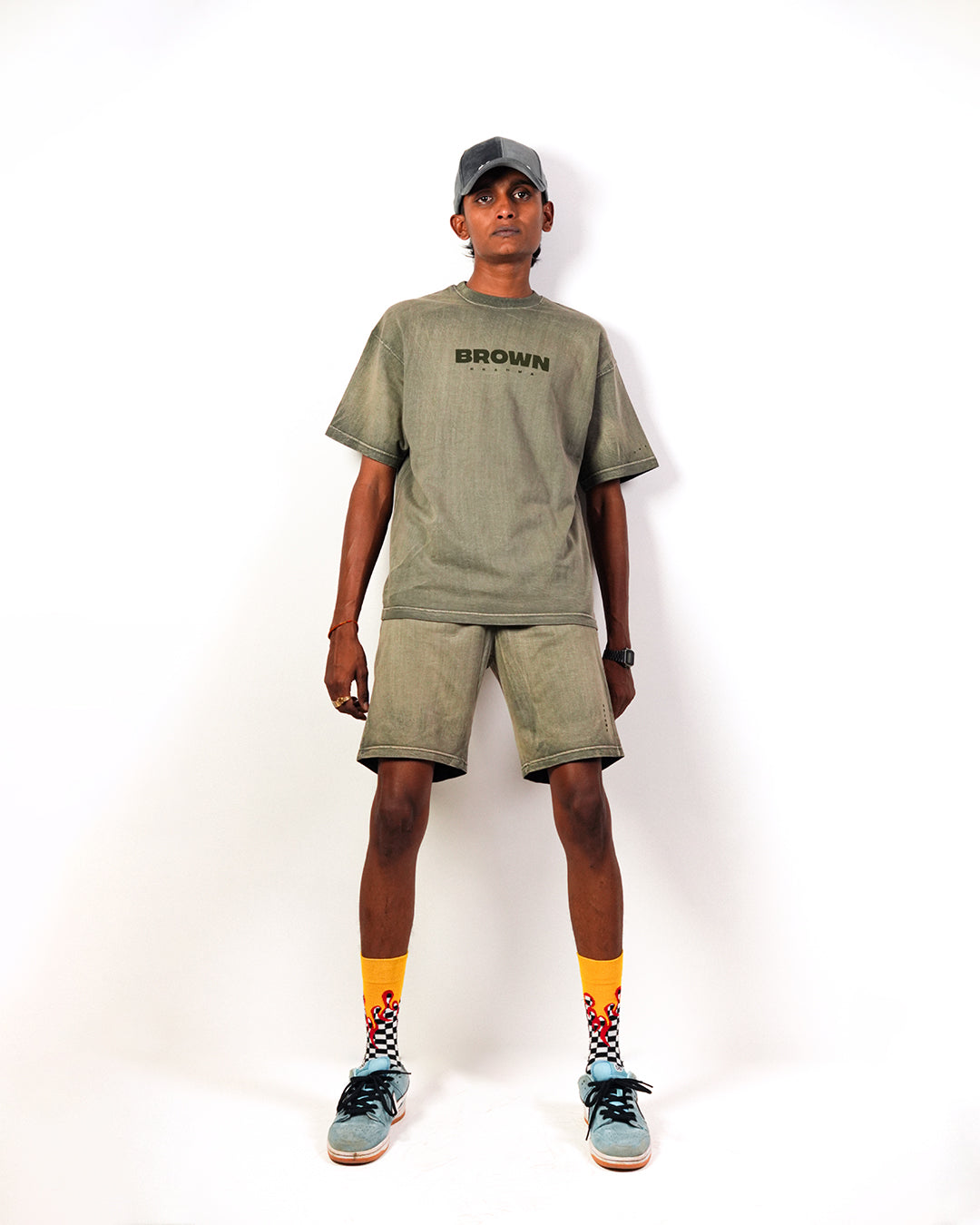 Introducing Brahma's cord-set for summer: a stylish T-shirt and shorts duo featuring a trendy wash effect. Crafted for comfort and style, the set is perfect for those sunny days. Wear the emblem of Brahma with pride and embrace the season with flair.