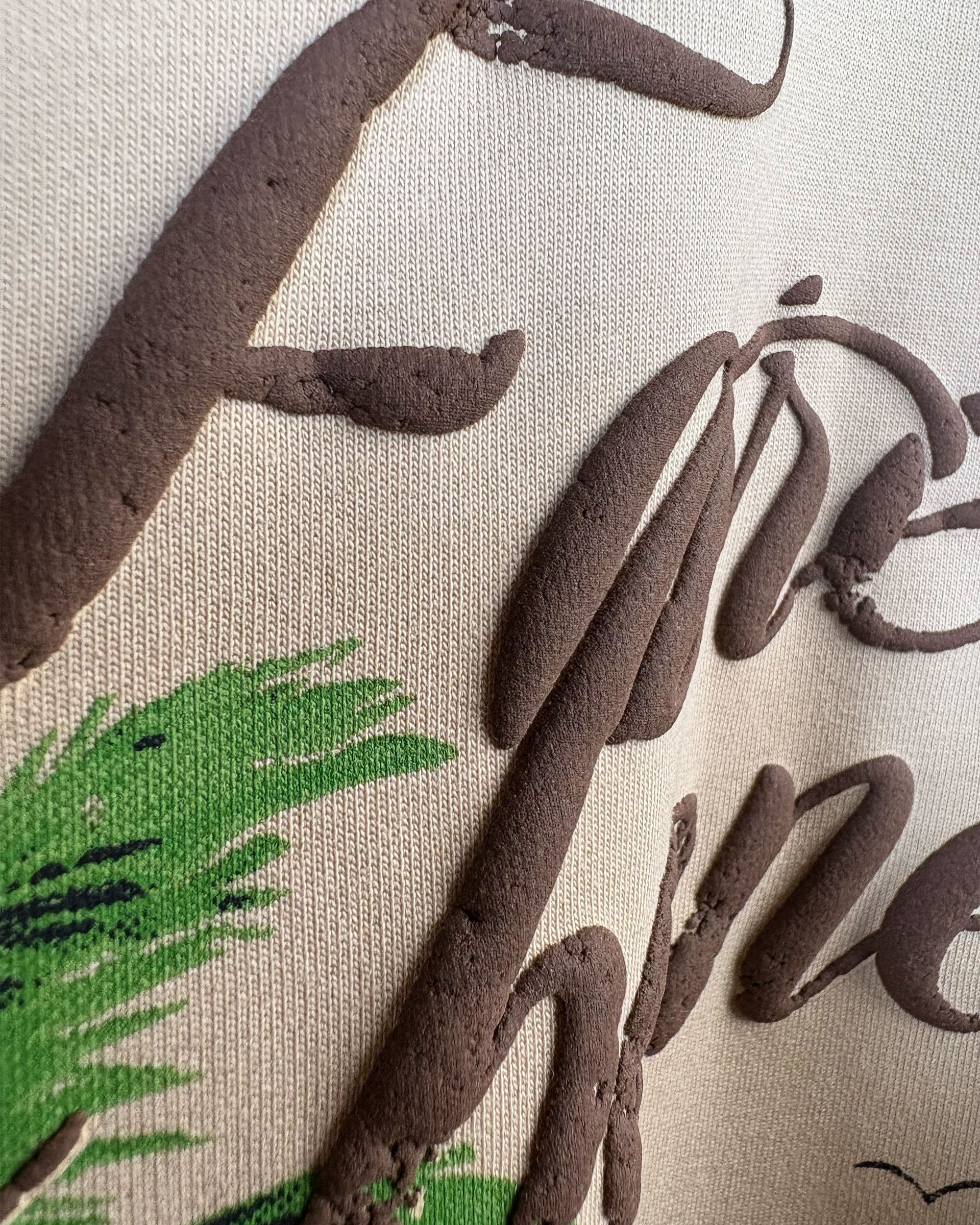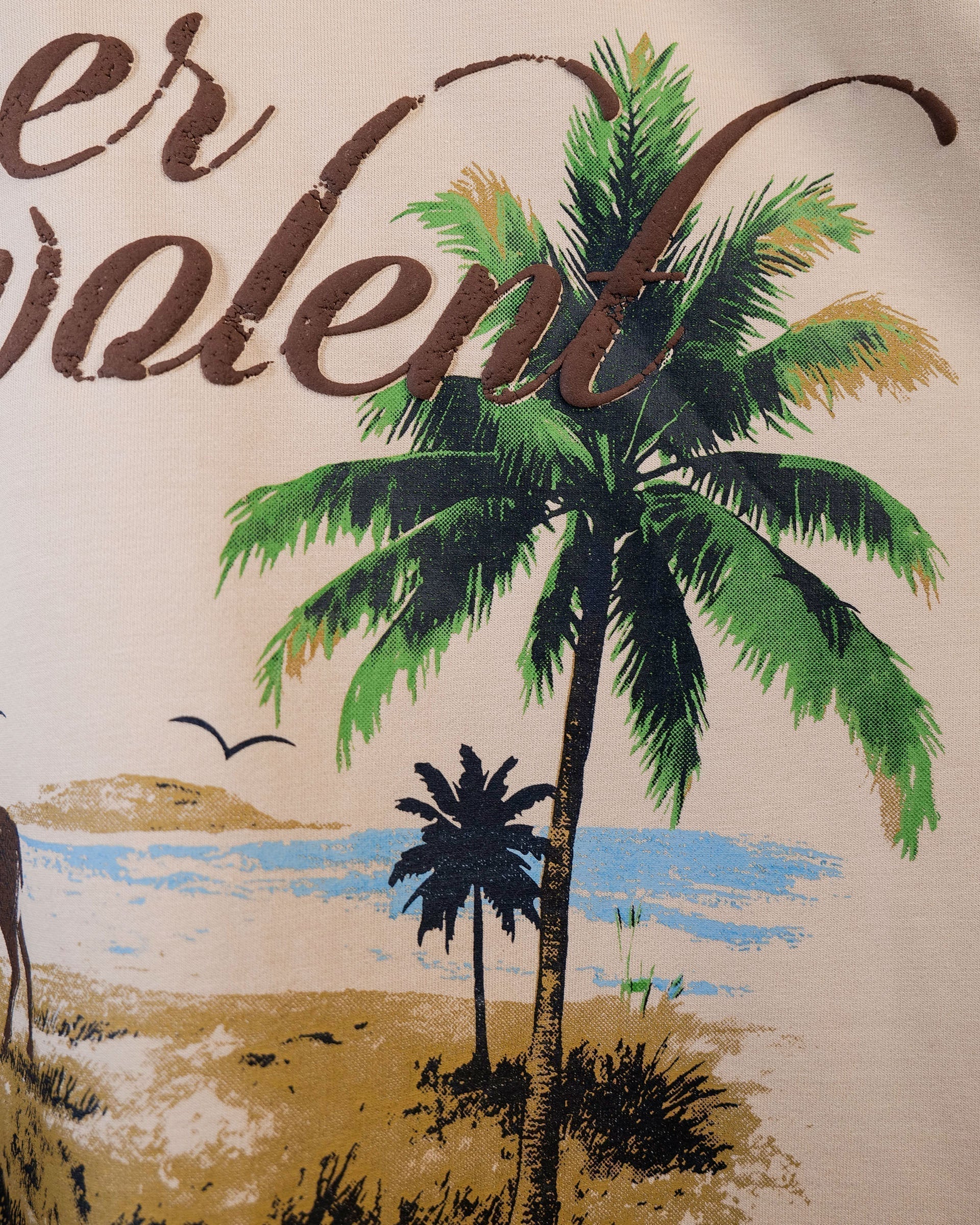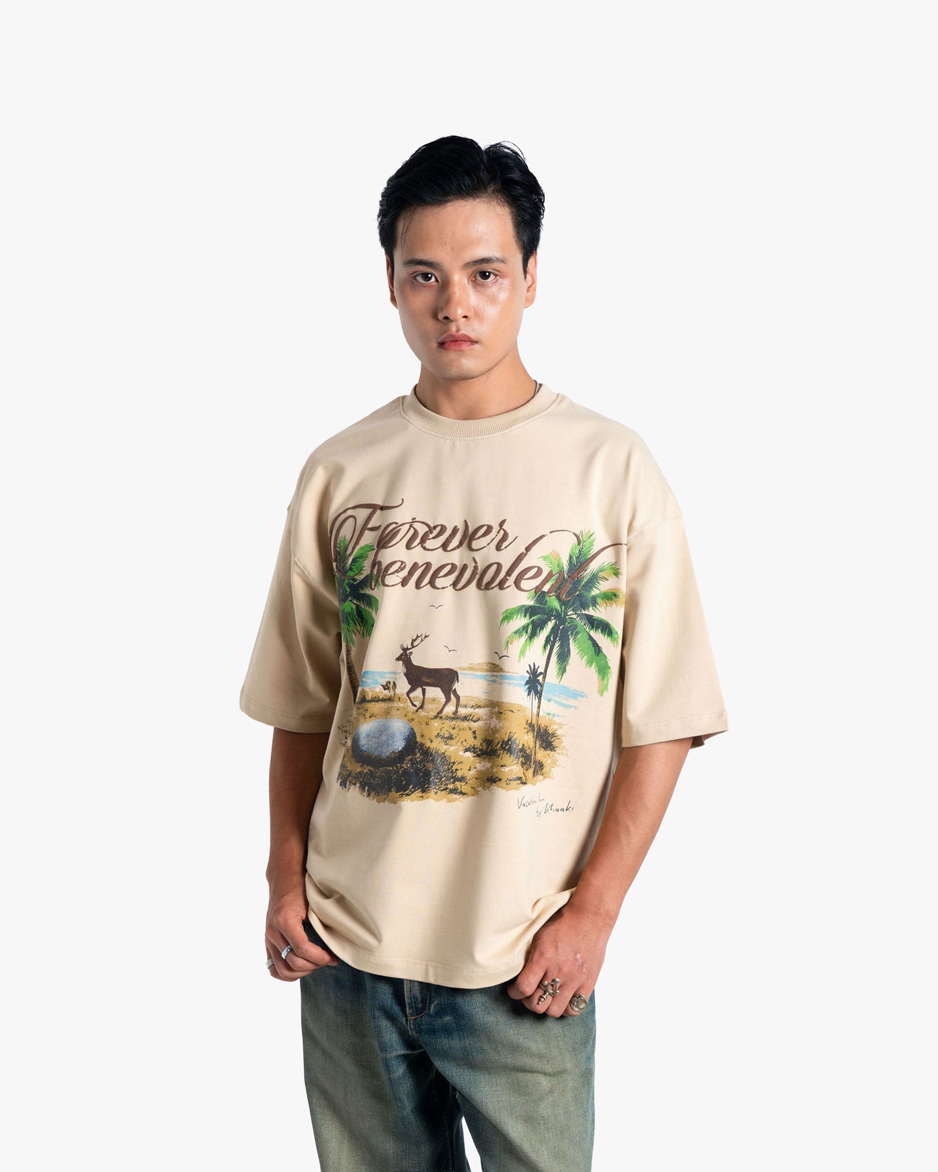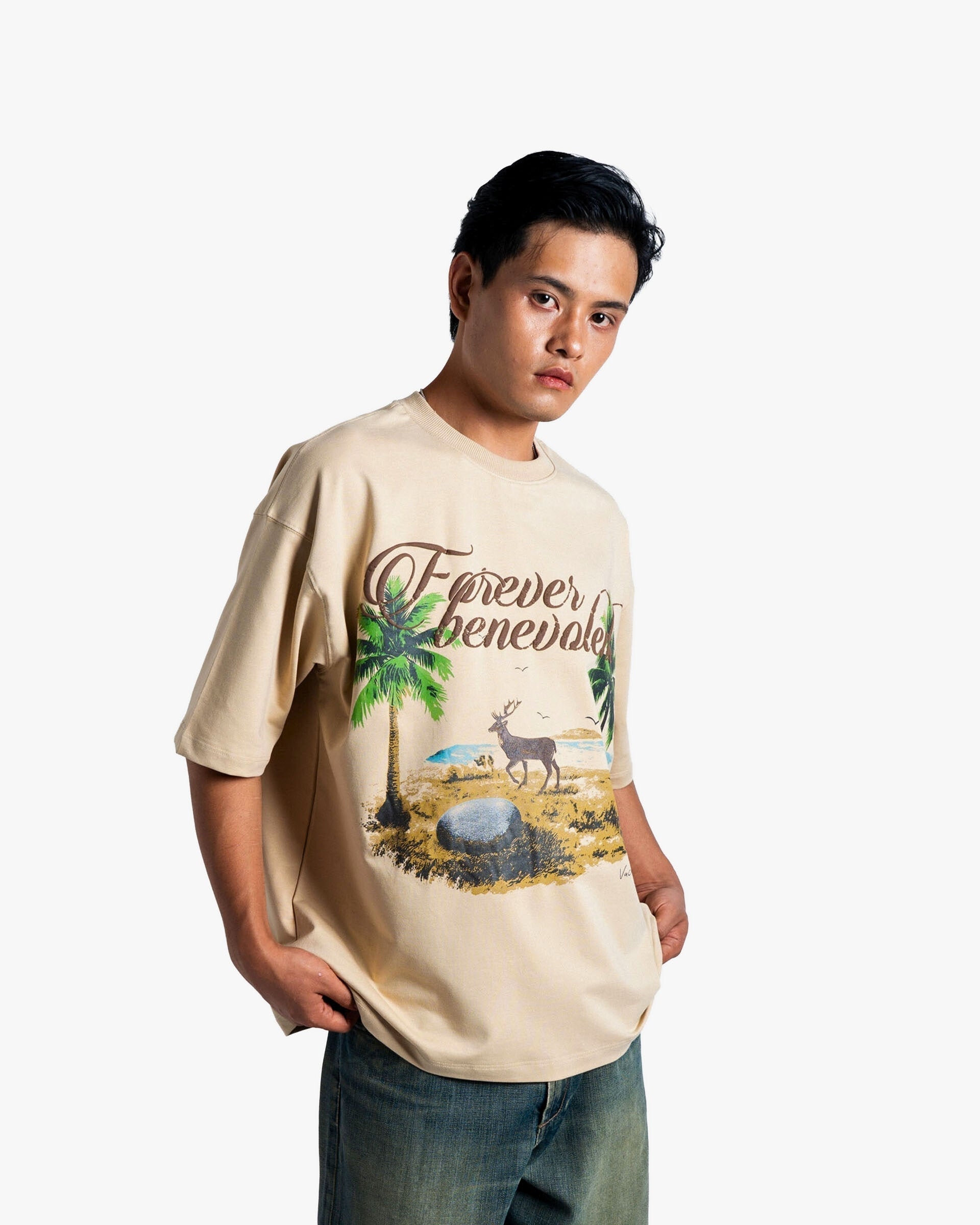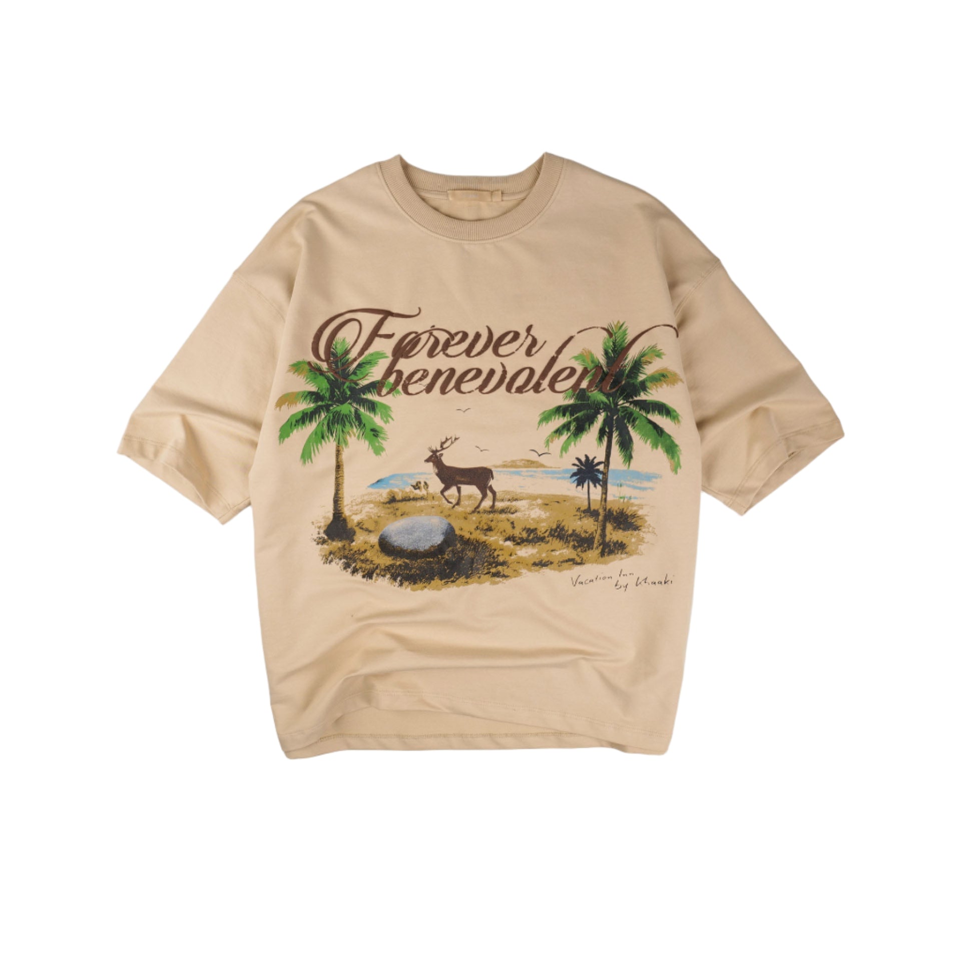 The front features an intricate hand-drawn scene, blending serene palm trees, a lone stag, and tranquil coastal vibes under the elegant script “Forever Benevolent.” This captivating graphic tee merges nature-inspired artistry with modern flair—ideal for the urban fashion set.