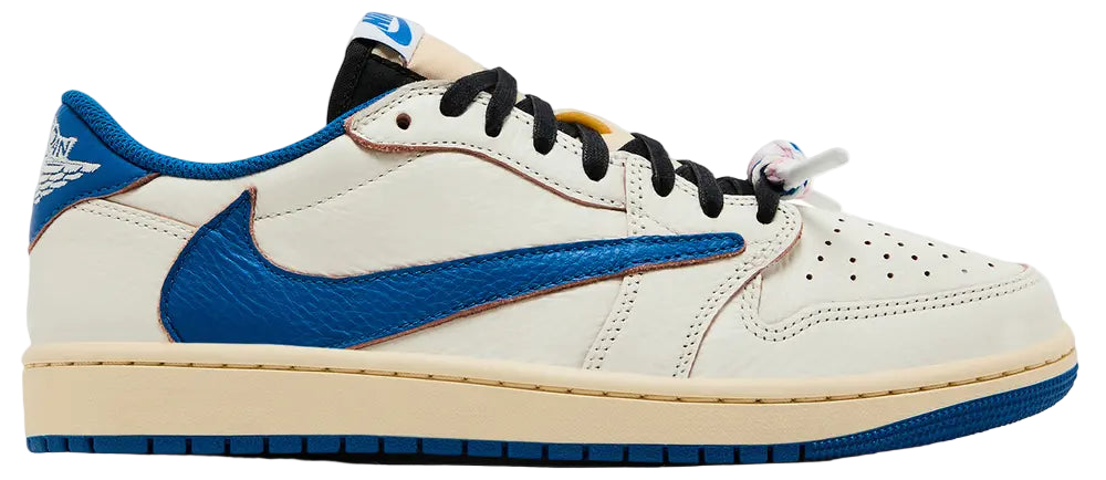 Step into a bold fusion of style and culture with the Fragment Design X Travis Scott X Air Jordan 1 Retro Low OG SP 'Sail Military Blue.' This exclusive sneaker combines iconic collaborations to deliver unmatched streetwear appeal. Featuring premium materials in a sleek sail and military blue palette, it offers both comfort and standout aesthetics. Elevate your collection with a rare and versatile design that effortlessly blends high fashion with athletic heritage.