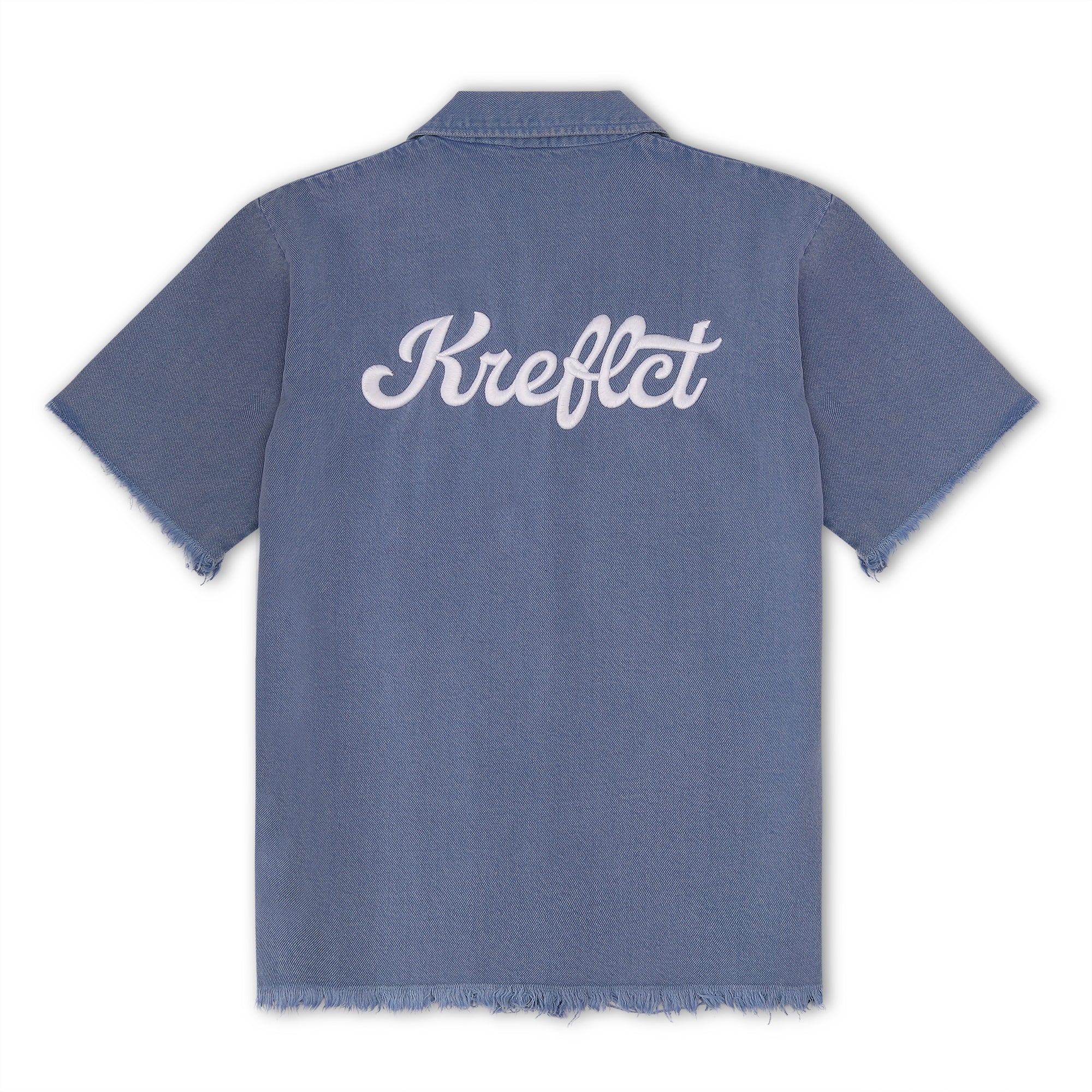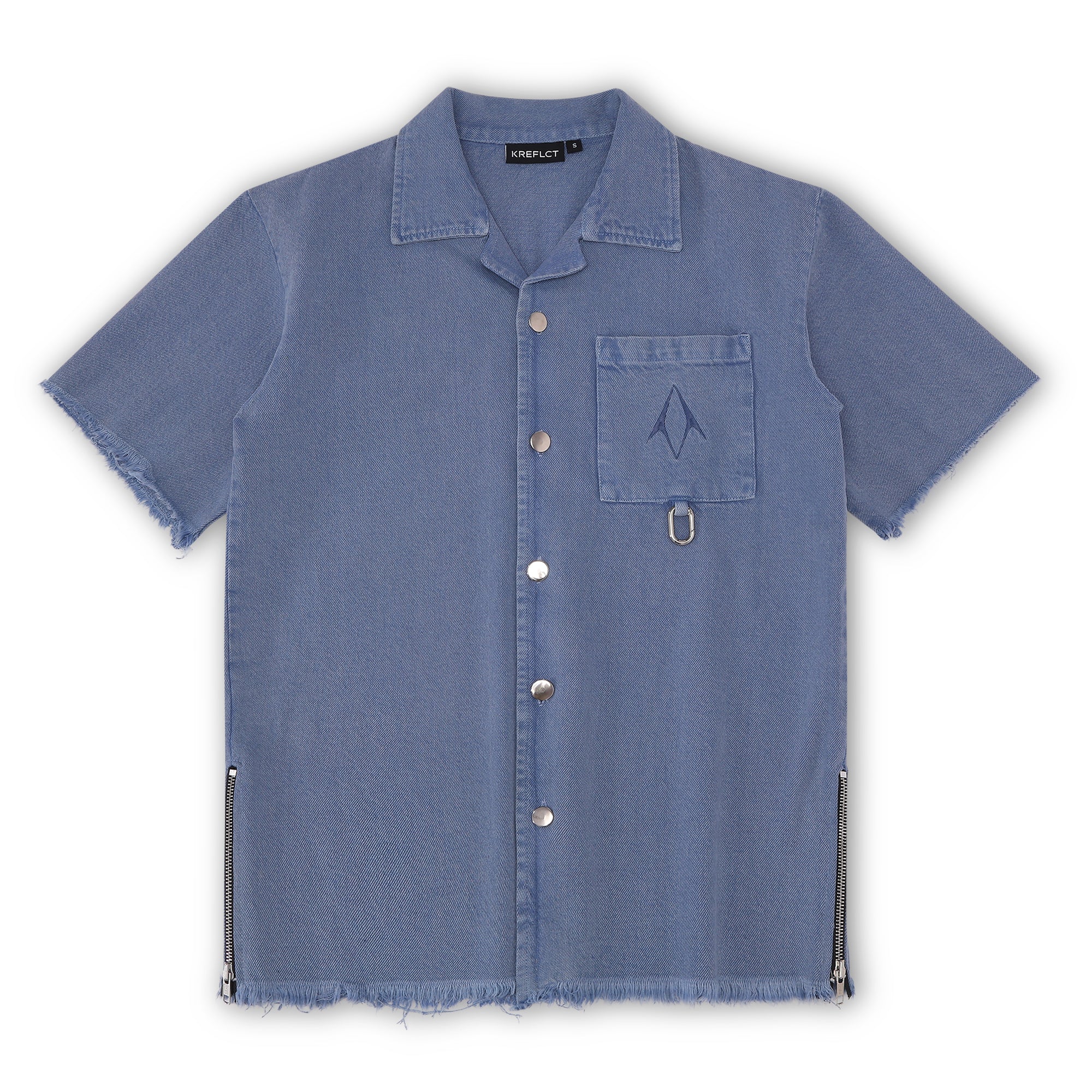 Make a bold statement with the Kreflct Fray Shirt—a contemporary piece crafted from durable denim twill. This shirt features a distinct silhouette with a frayed hemline and rugged, frayed short sleeves. Functional side zippers and polished metal buttons add a utilitarian edge, while the striking white logo embroidery on the back ensures you stand out.