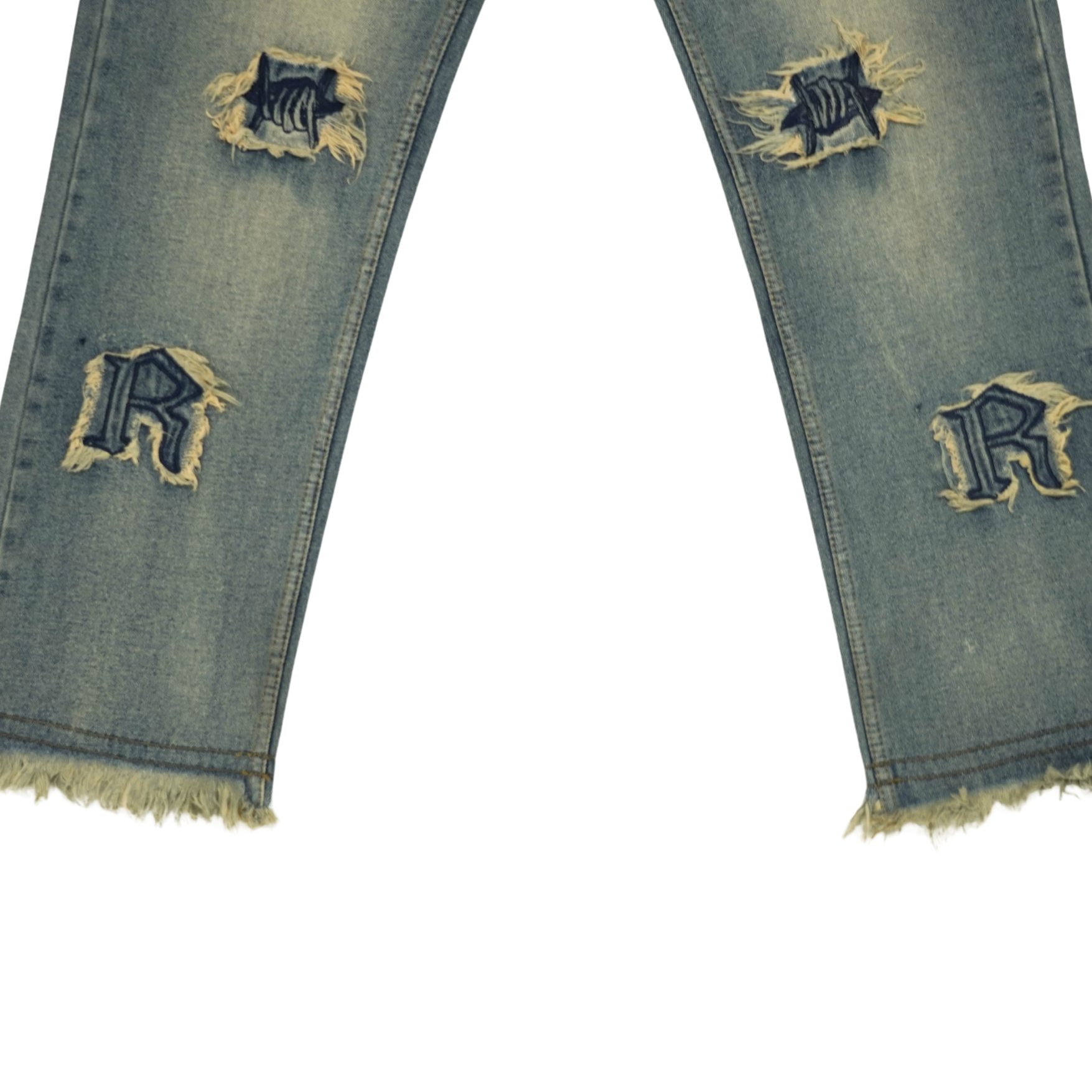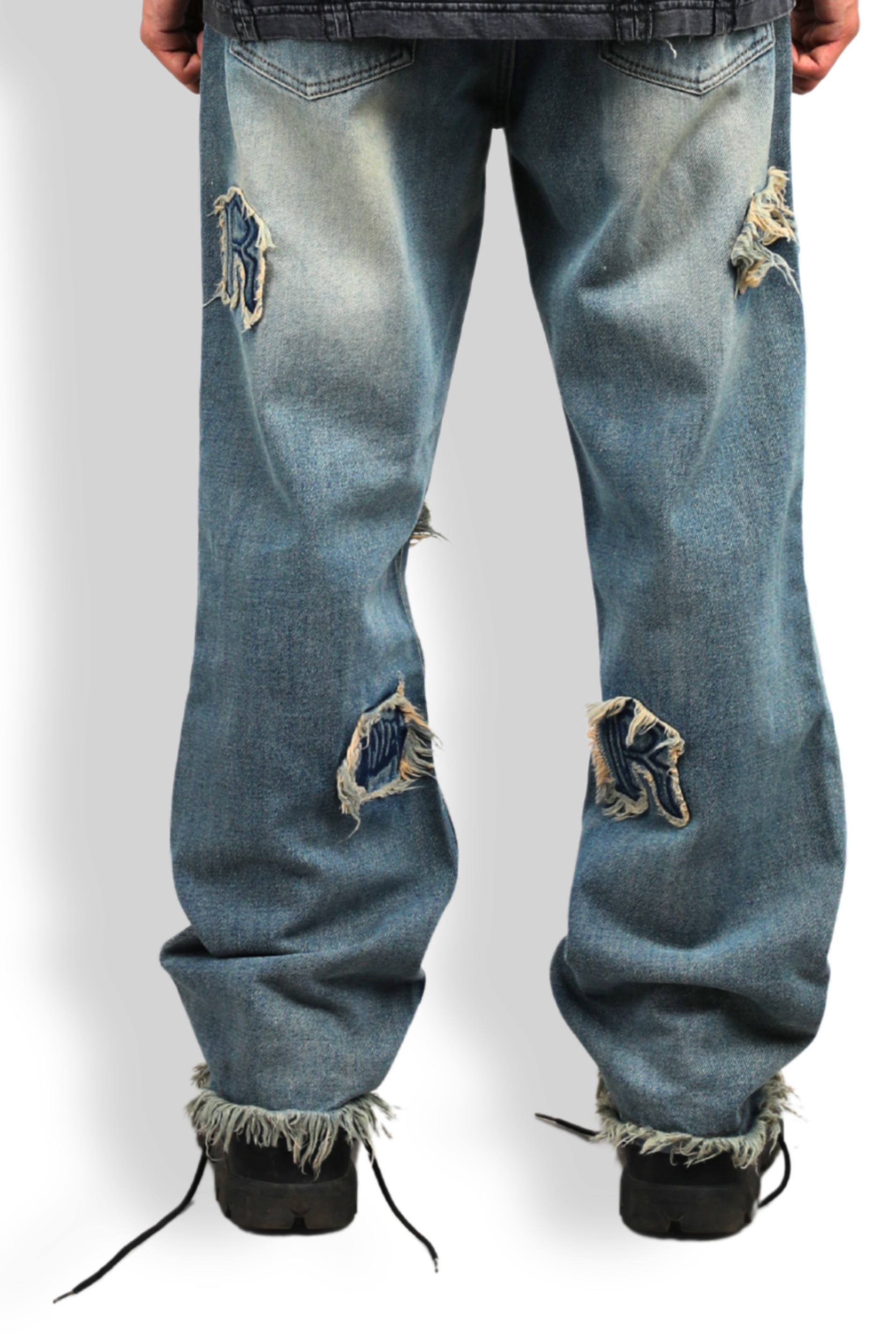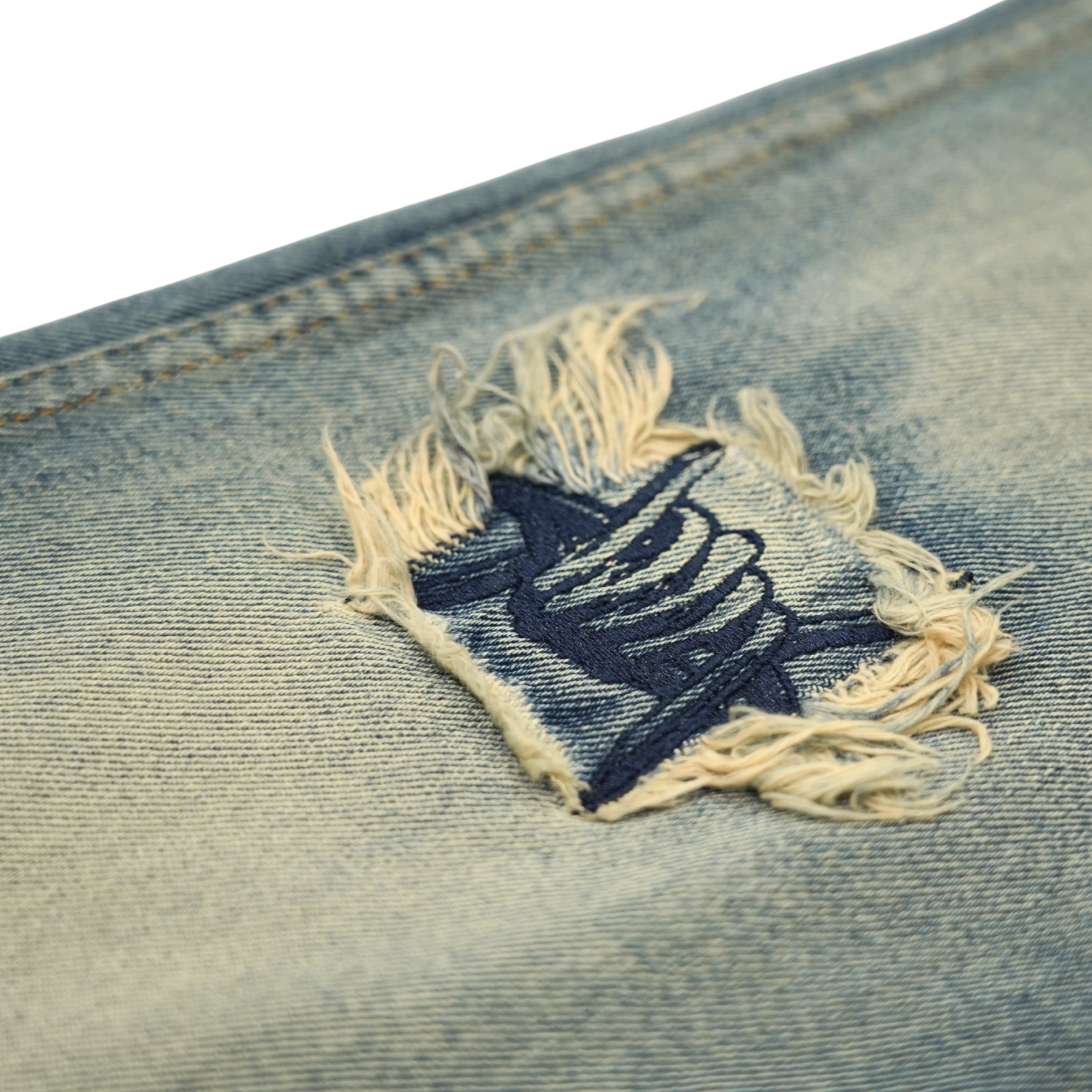 Straight loose fit non-stretch heavy washed jeans with frayed finishes across embroidered patches and the hem. Wide and low front pockets. YKK fly zipper. Limited to only 50 pieces.