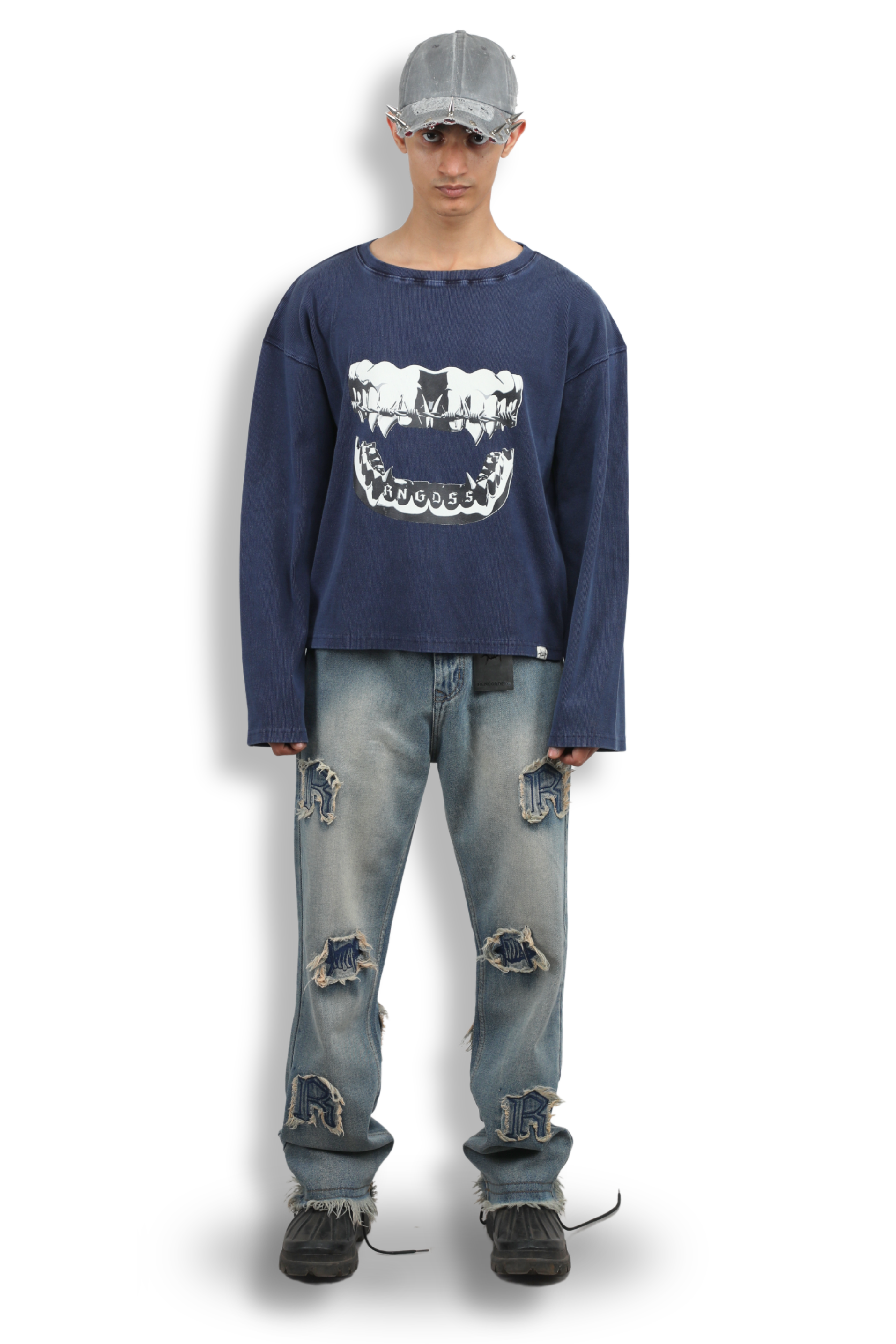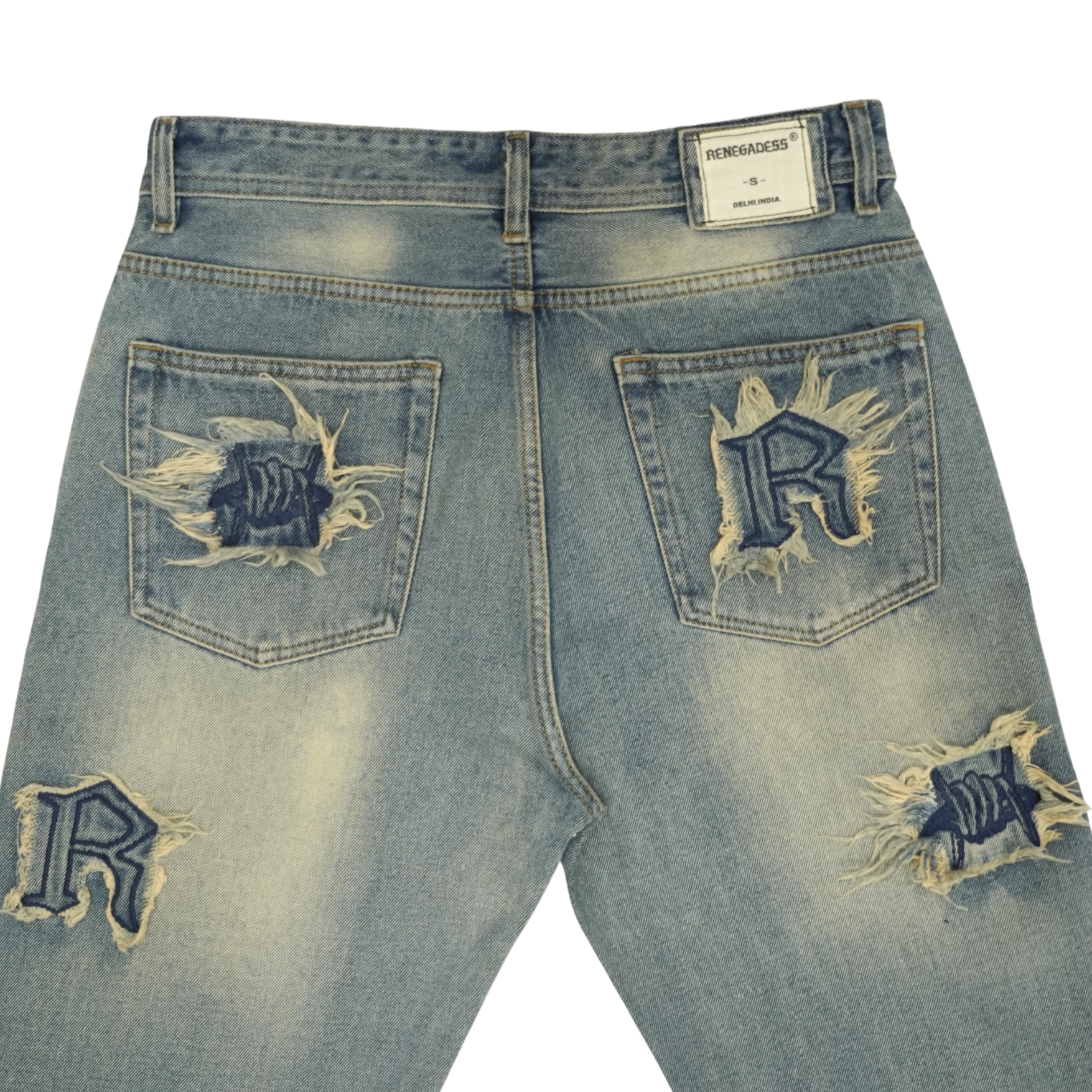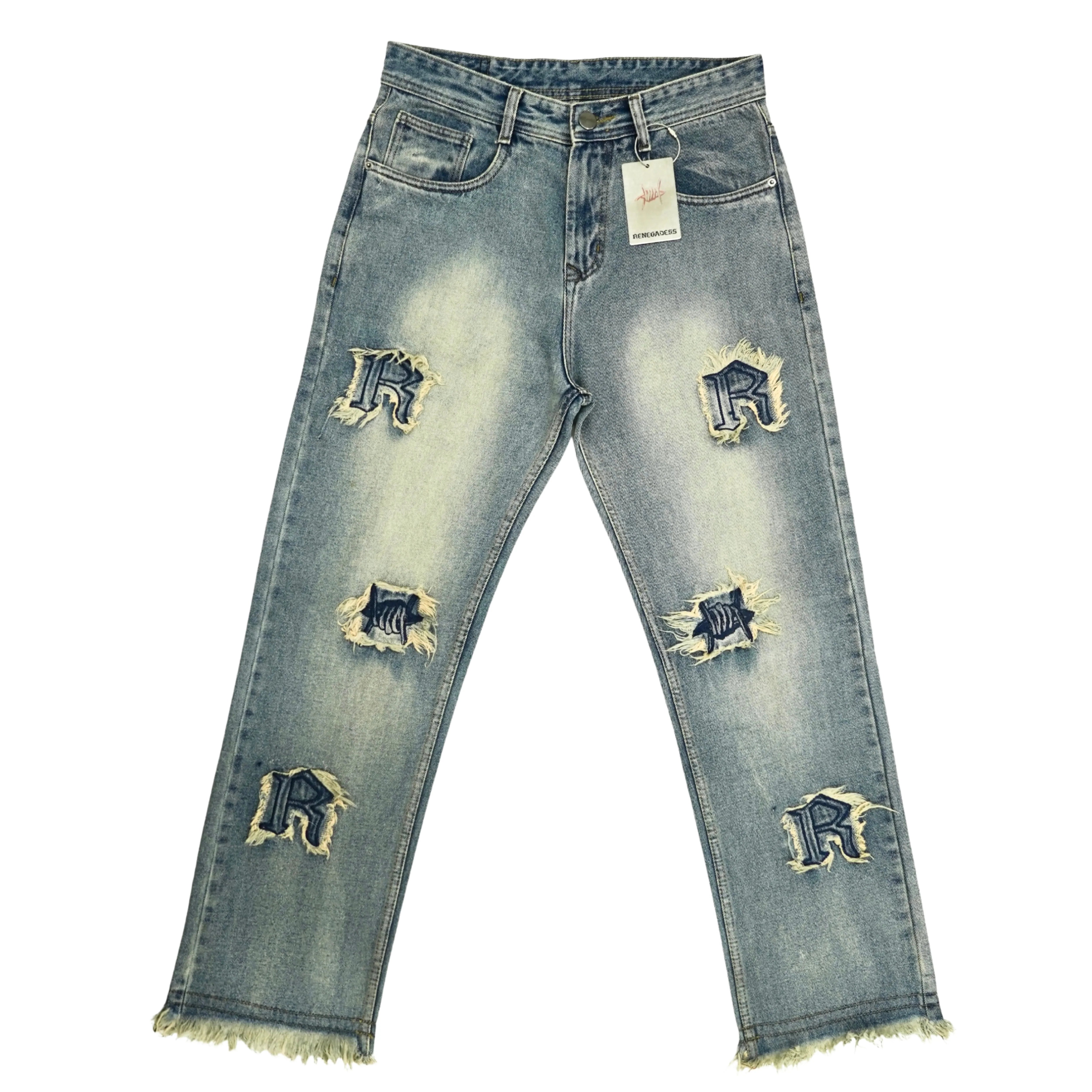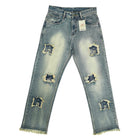 Straight loose fit non-stretch heavy washed jeans with frayed finishes across embroidered patches and the hem. Wide and low front pockets. YKK fly zipper. Limited to only 50 pieces.