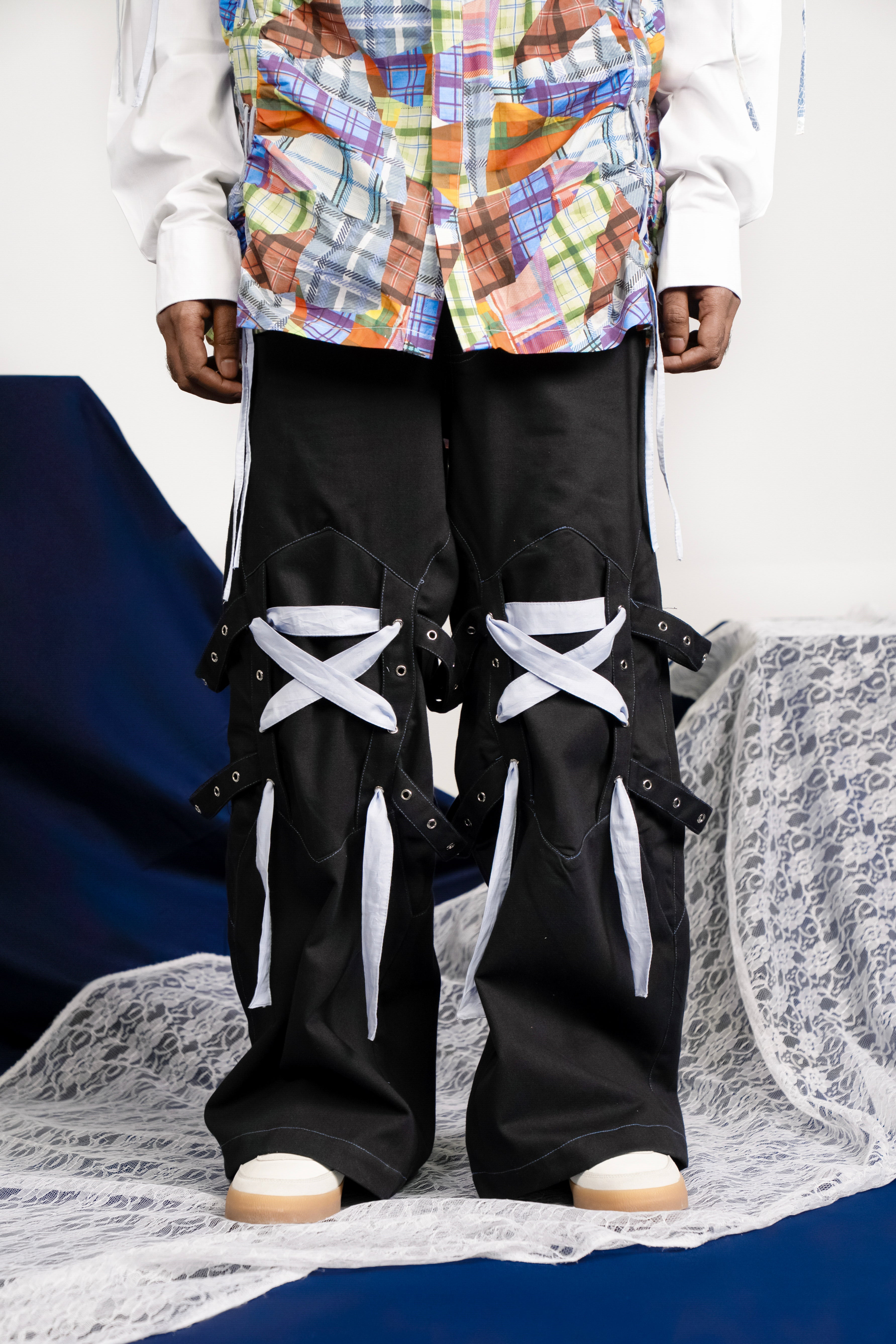 Highlighting the panels inspired from knee caps on armours, a blue thread contrast stitching brings out the details. This pant is crafted from black twill fabric, and has a wide leg silhouette. It has belts along the sides attached from the knees and embellished with silver eyelets. Thick drawstring detail at the knees, two front and two back pockets for utility and finished with a metallic zip and button.