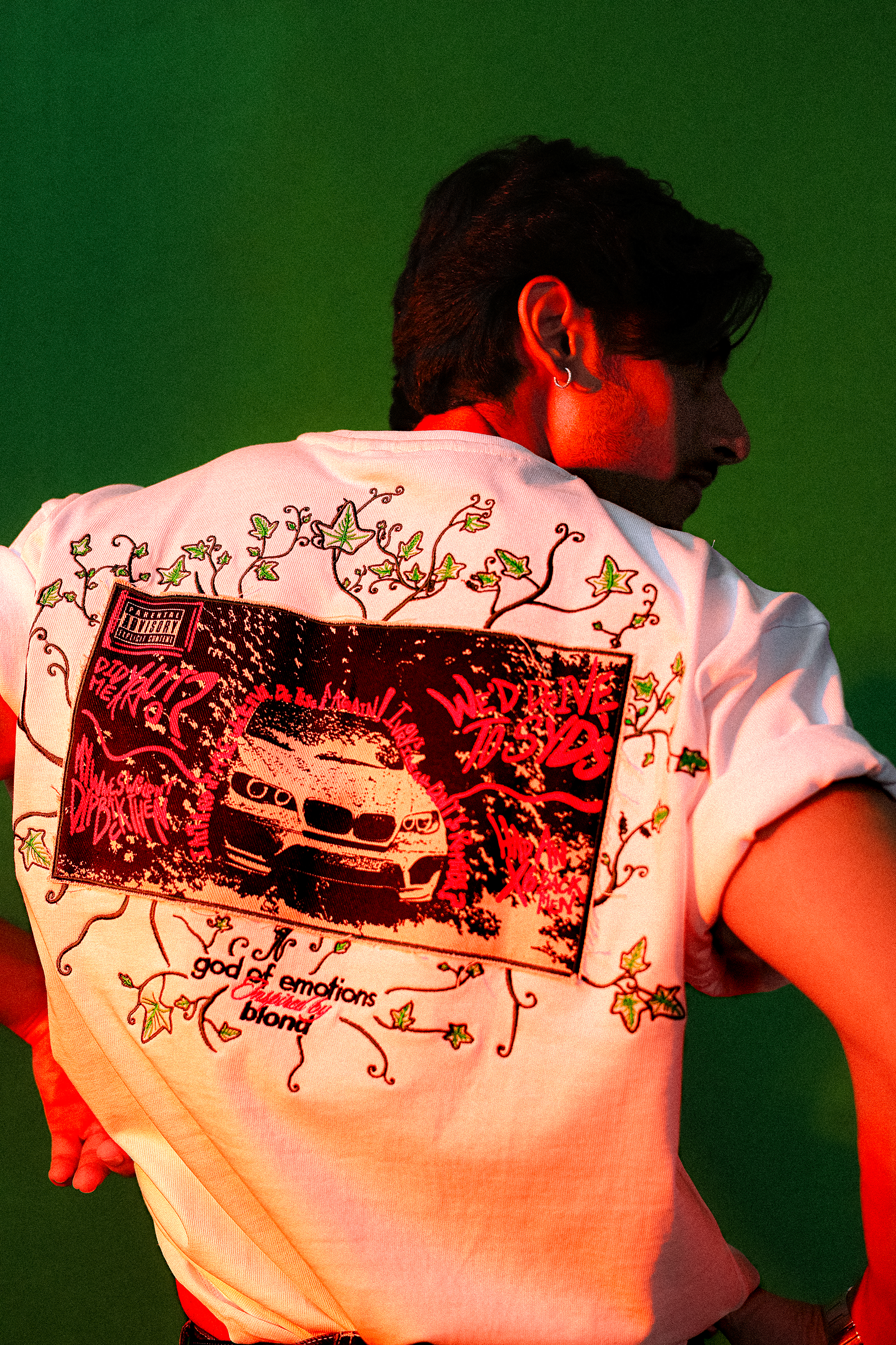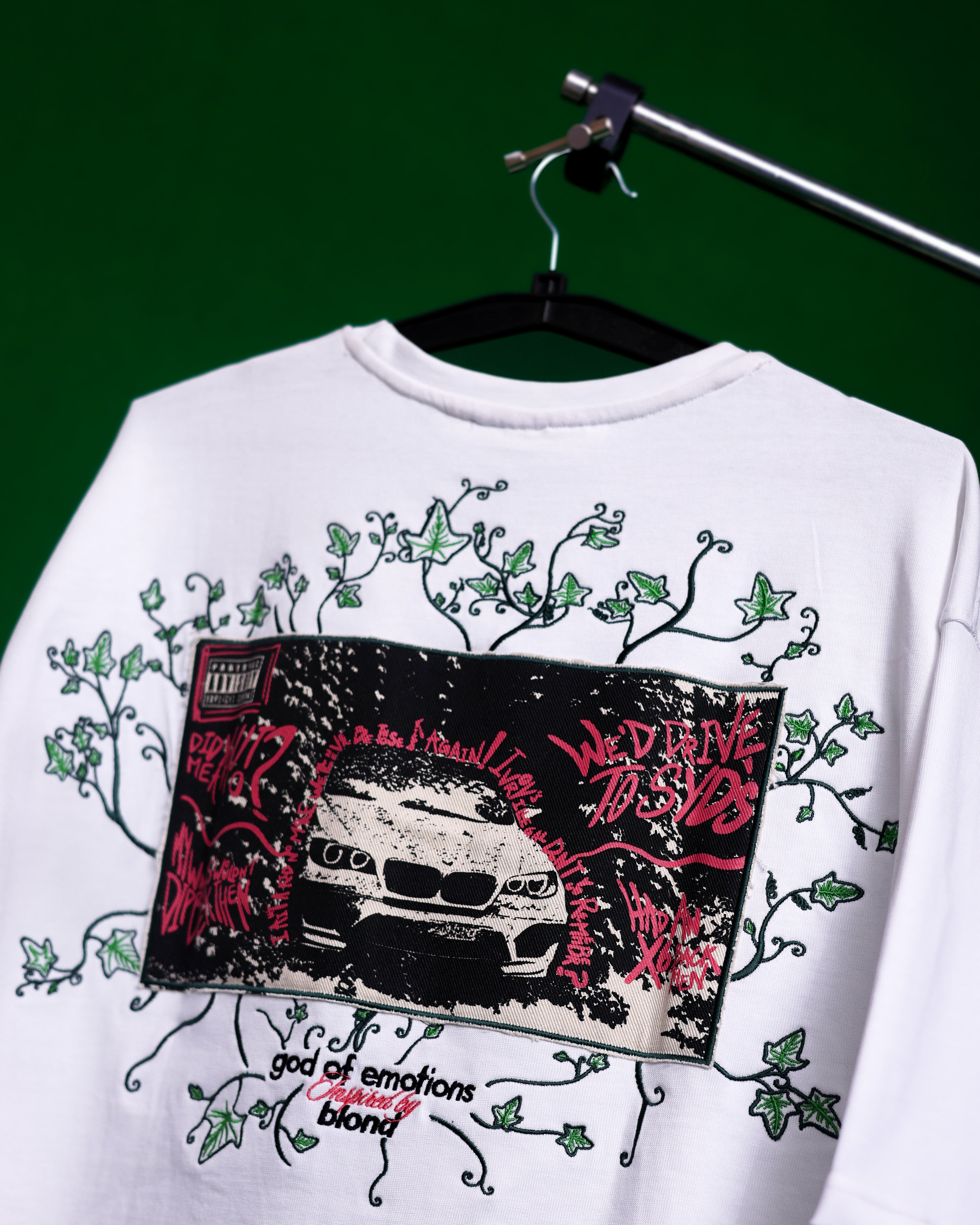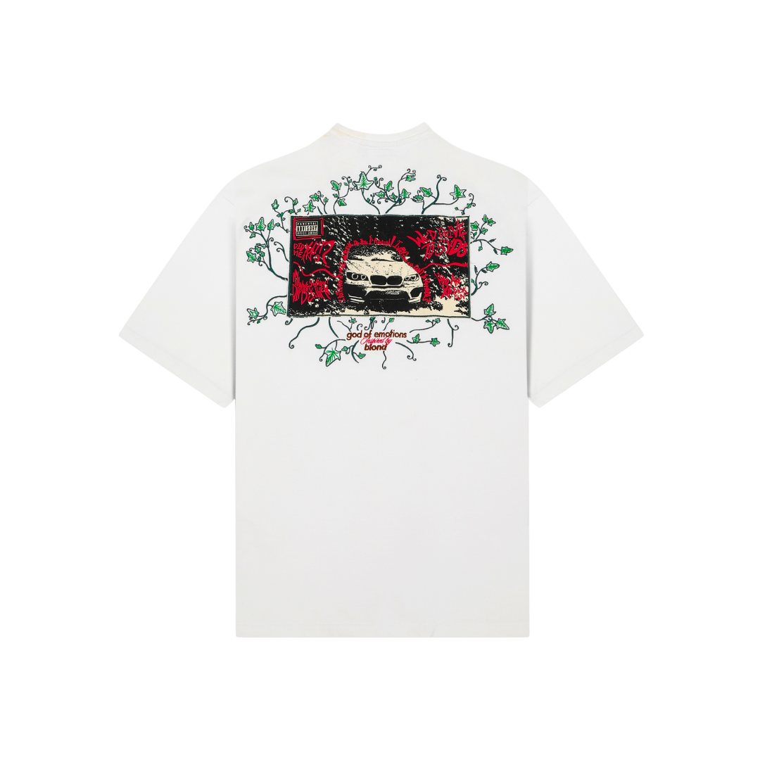 A TIMELESS, CONCEPTUAL TEE CRAFTED IN PURE WHITE, THIS PIECE IS INSPIRED BY FRANK OCEAN’S IVY. THE FRONT FEATURES THE GOD OF EMOTIONS LOGO / BOLDLY SCREEN-PRINTED, ECHOING THE ESSENCE OF BLOND. THE BACK TELLS A STORY: THE ICONIC BMW X6, EMBROIDERED WITH INTRICATE IVY CREEPERS, REFERENCING THE VERSE 'WE'D DRIVE TO SYD'S, HAD AN X6 BACK THEN'. A MEMORY CAPTURED IN MOTION.